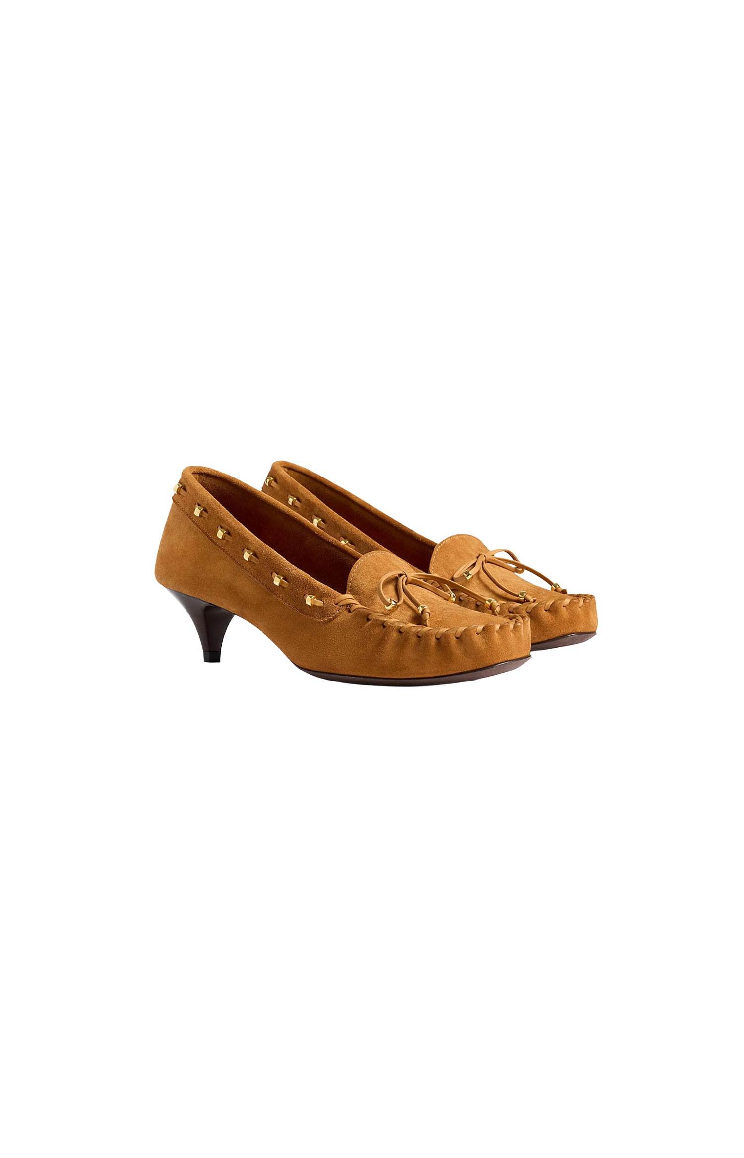 These Milly pumps by Khaite are crafted from suede. They feature tubular construction, tonal whipstitching, hand-threaded grommet lacing with gold beads, and a suede lining.
