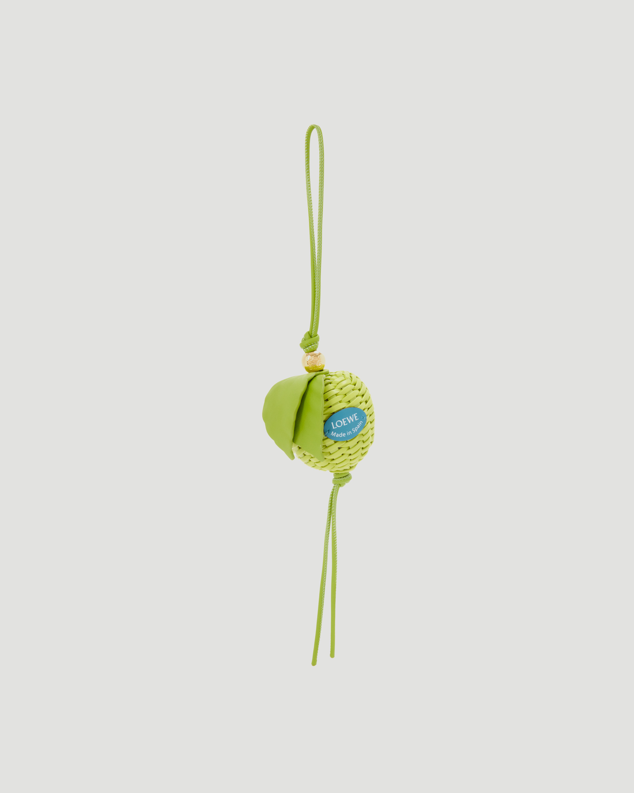 Apple charm by Loewe crafted from woven calfskin, featuring a looped calfskin strap and an Anagram Pebble dice detail.