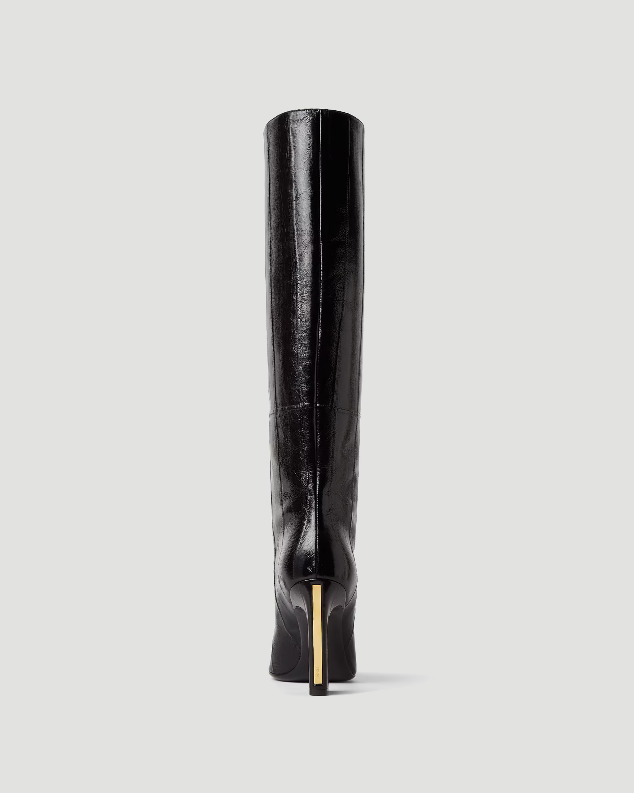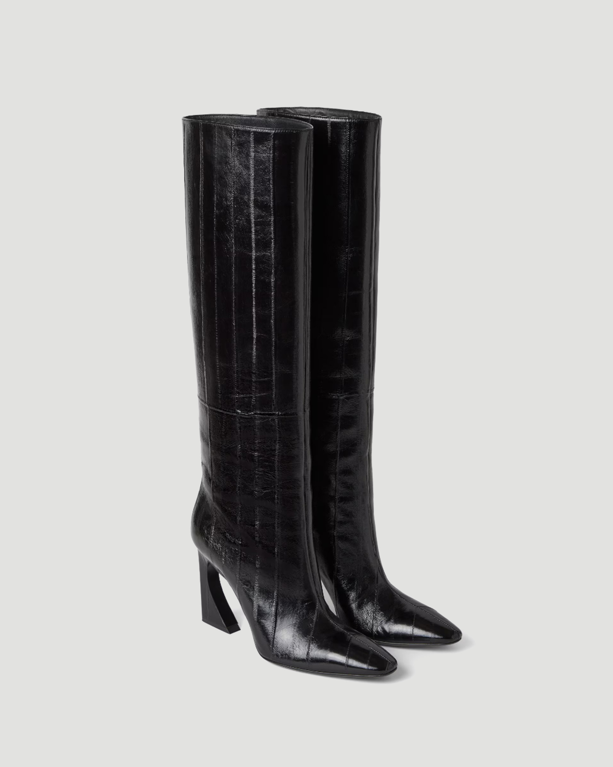 The Fendi tubular boots are crafted from black shiny hagfish leather with a tapered toe, high heel, and covered heel with a leather sole. They feature the iconic Arco line, accented with a metal detail and engraved logo.