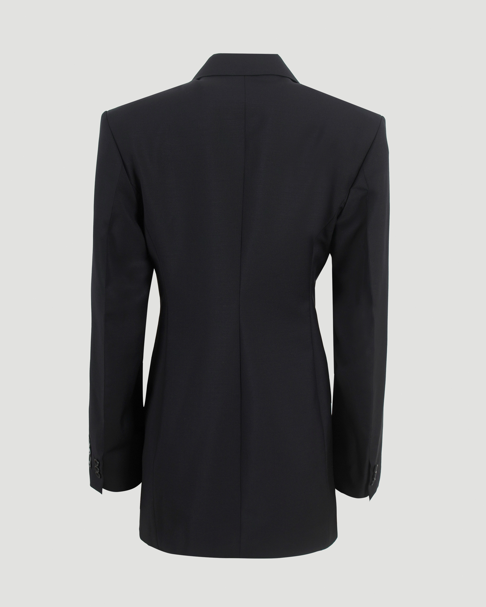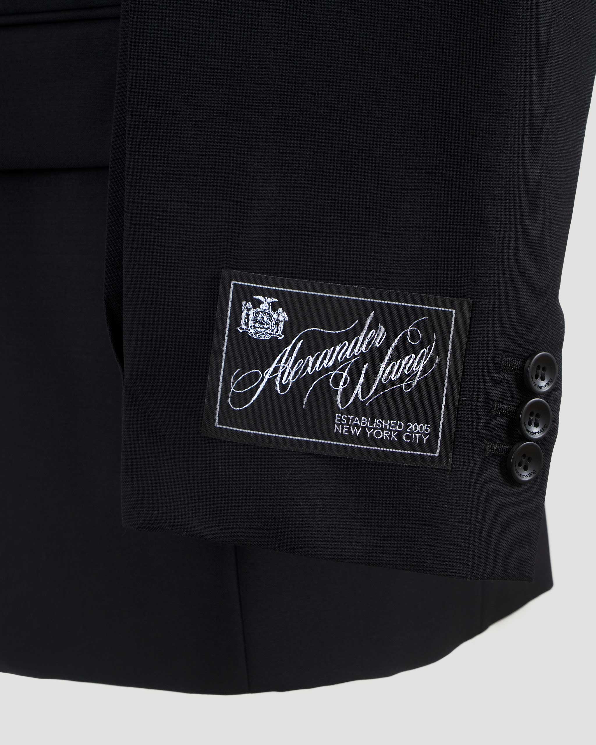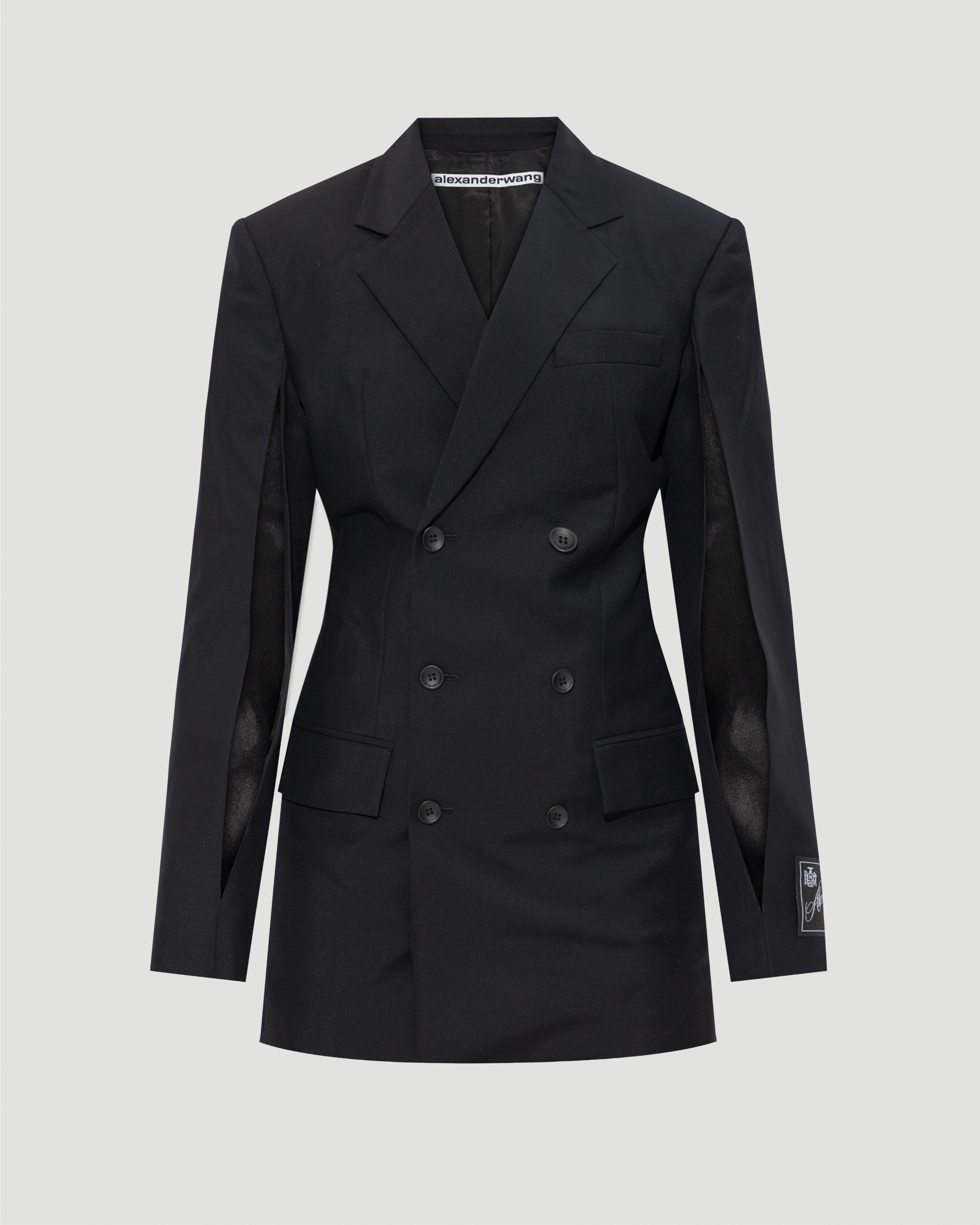 This Alexander Wang double-breasted blazer dress is cut from black wool-mohair suiting with slashed sleeve detailing. It features a three-button front, extended shoulders, sharp tailoring, flap and welt pockets, and a branded tailoring label at the cuff.