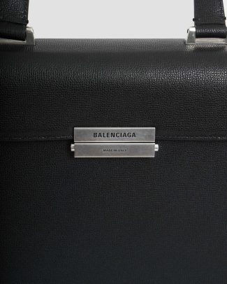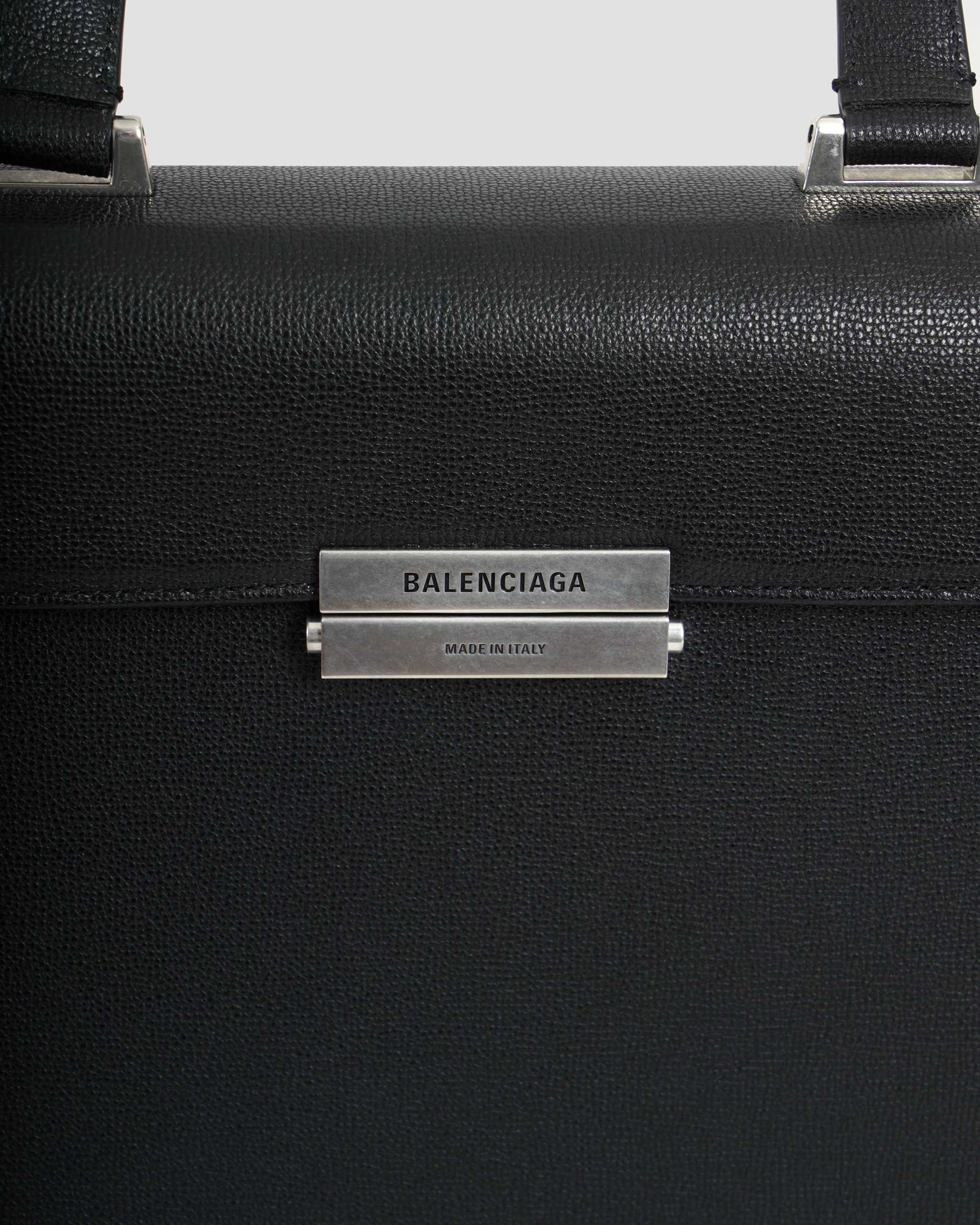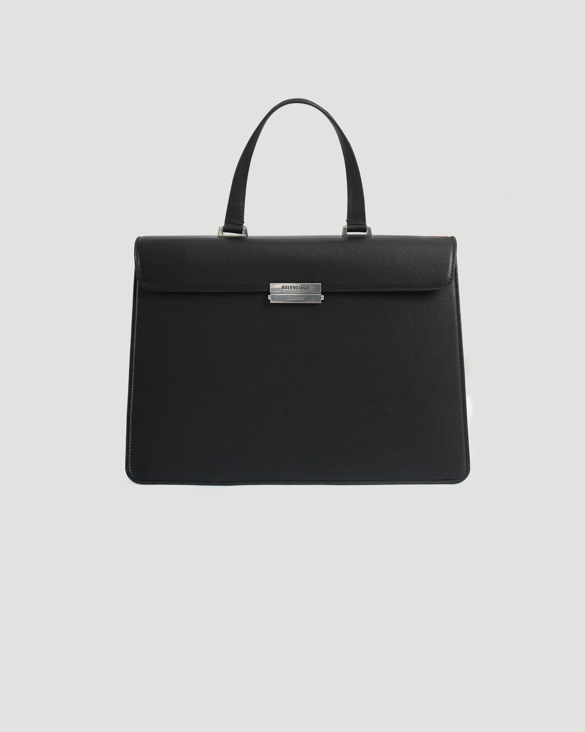 This sleek briefcase by Balenciaga is crafted in black calfskin leather with a structured silhouette. Finished with a polished silver-tone clasp engraved with the Balenciaga logo.