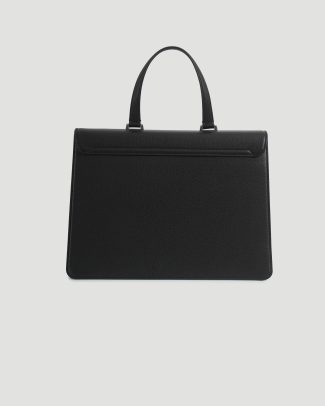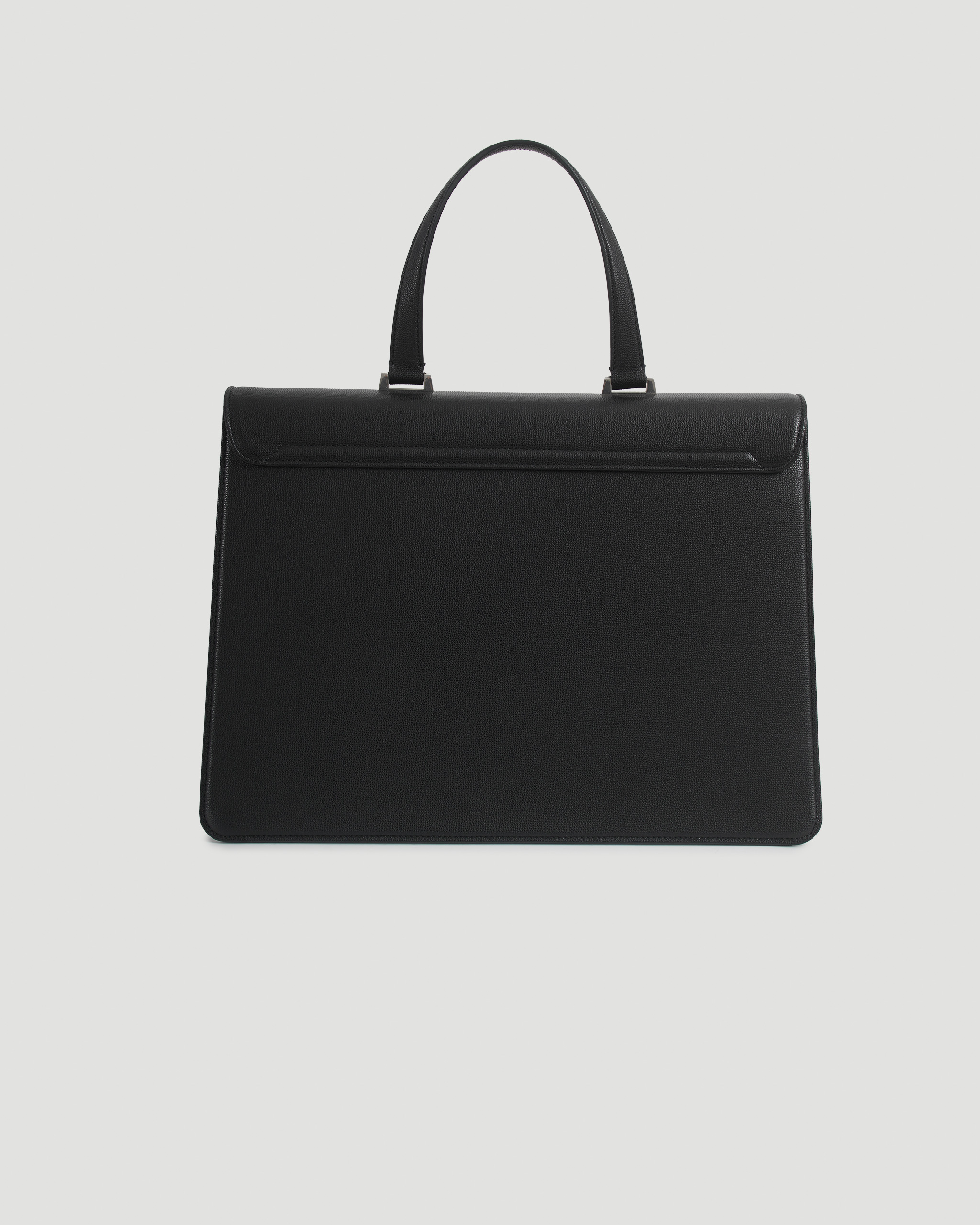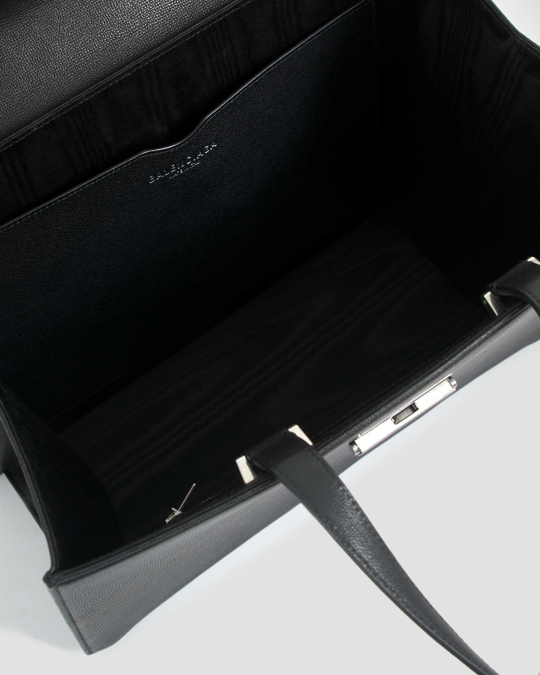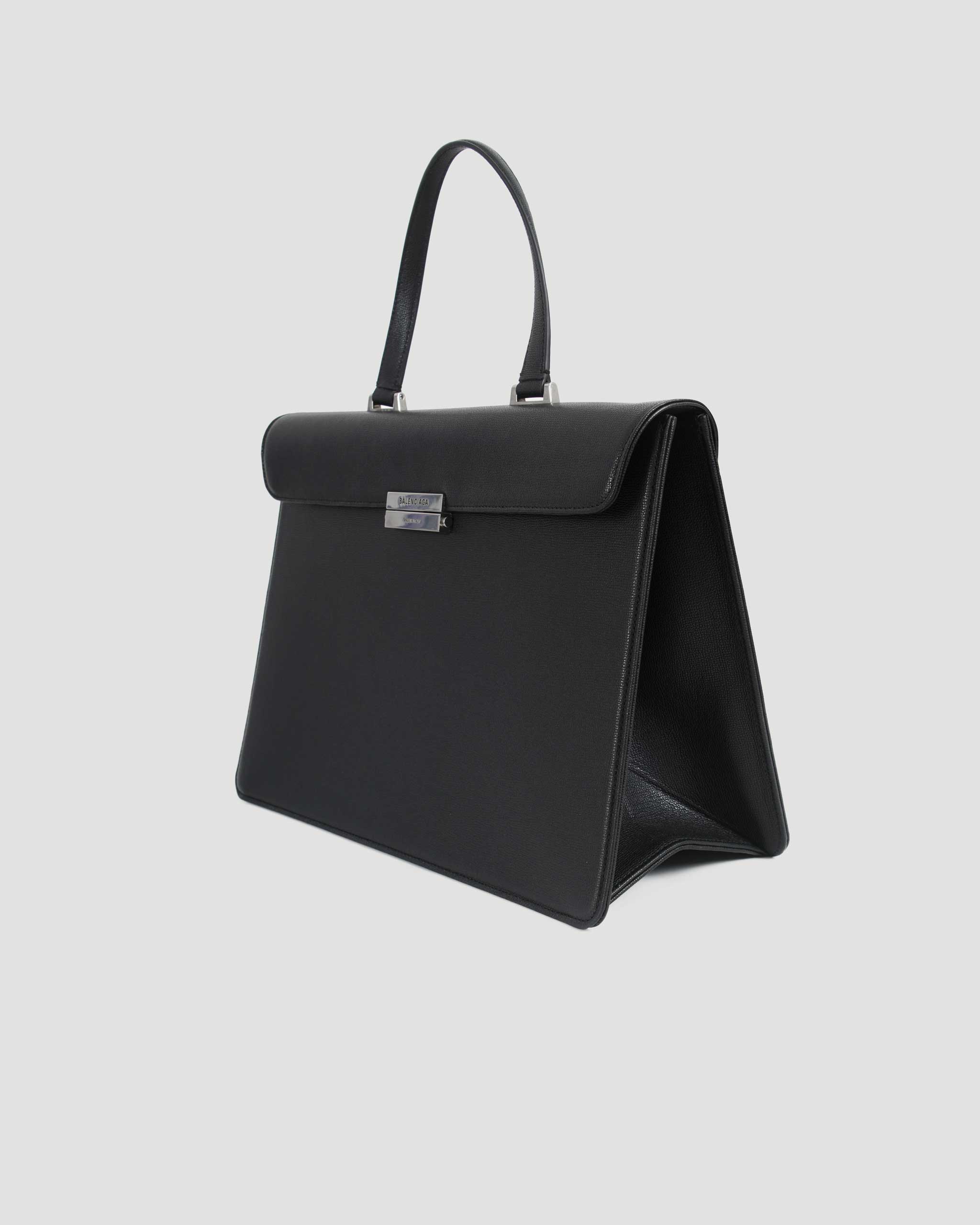 This sleek briefcase by Balenciaga is crafted in black calfskin leather with a structured silhouette. Finished with a polished silver-tone clasp engraved with the Balenciaga logo.