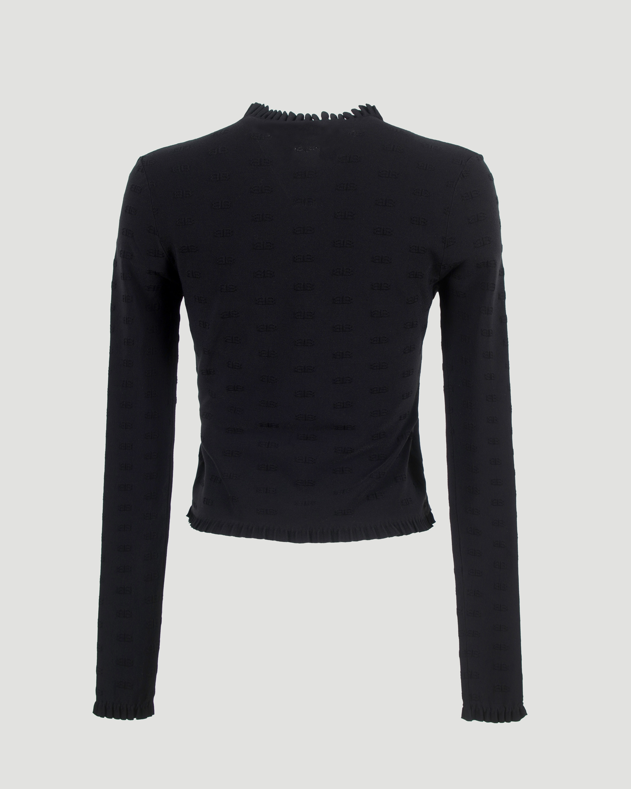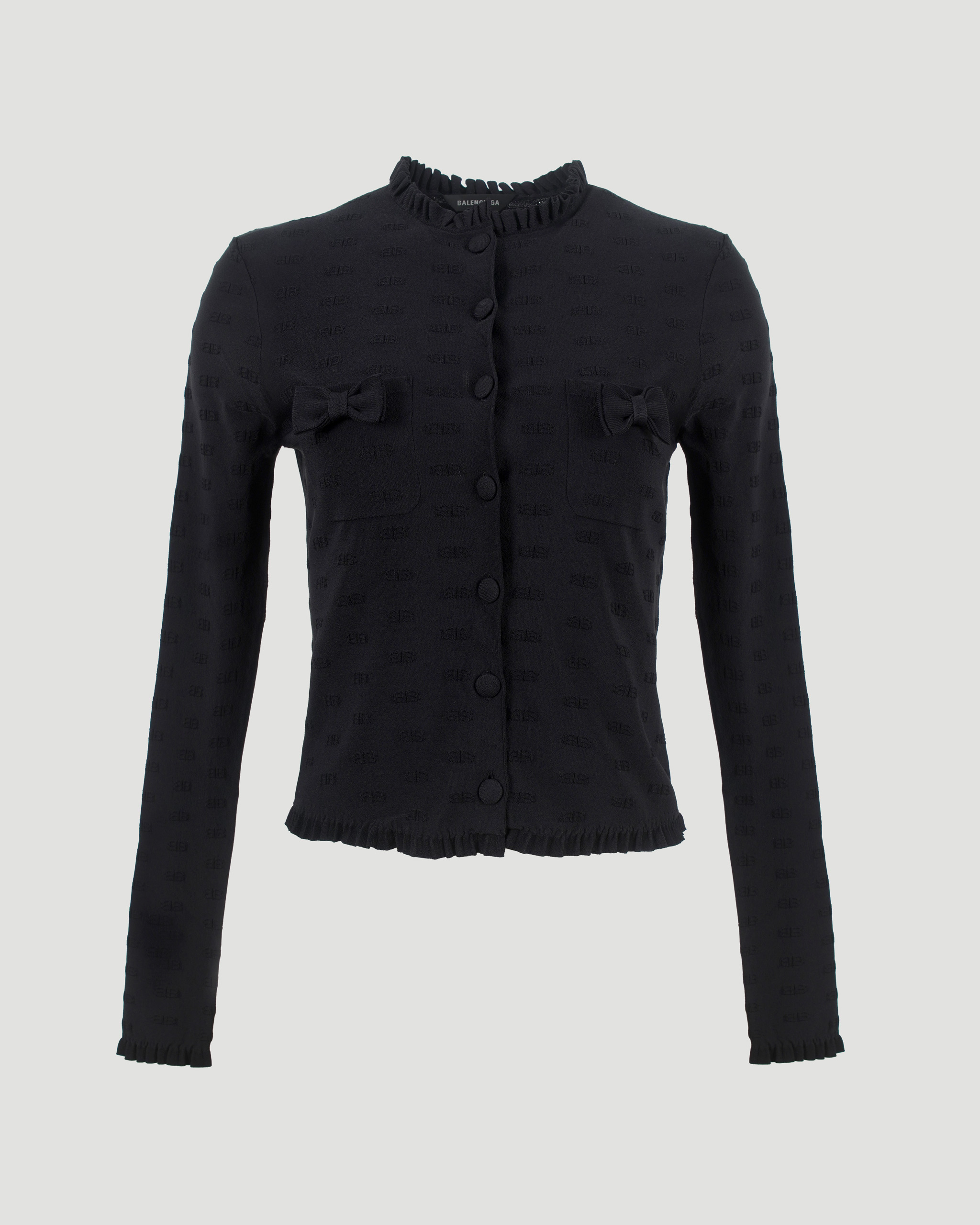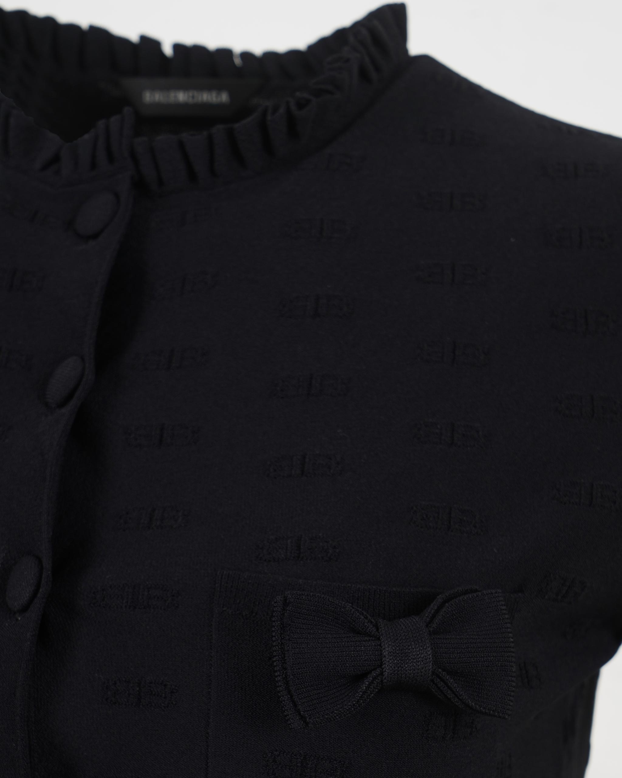 Black cardigan by Balenciaga featuring an all-over tonal monogram. Designed with a round neckline, front button closure, and two chest pockets accented with bow details. Finished with subtle ruffled edges at the collar, cuffs, and hem.