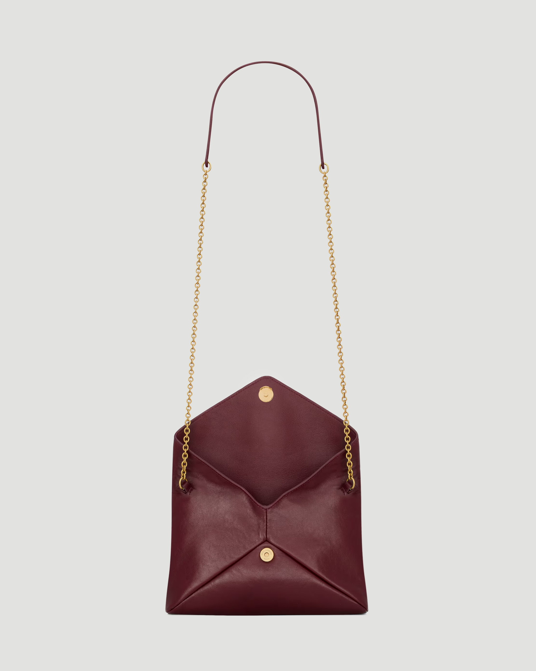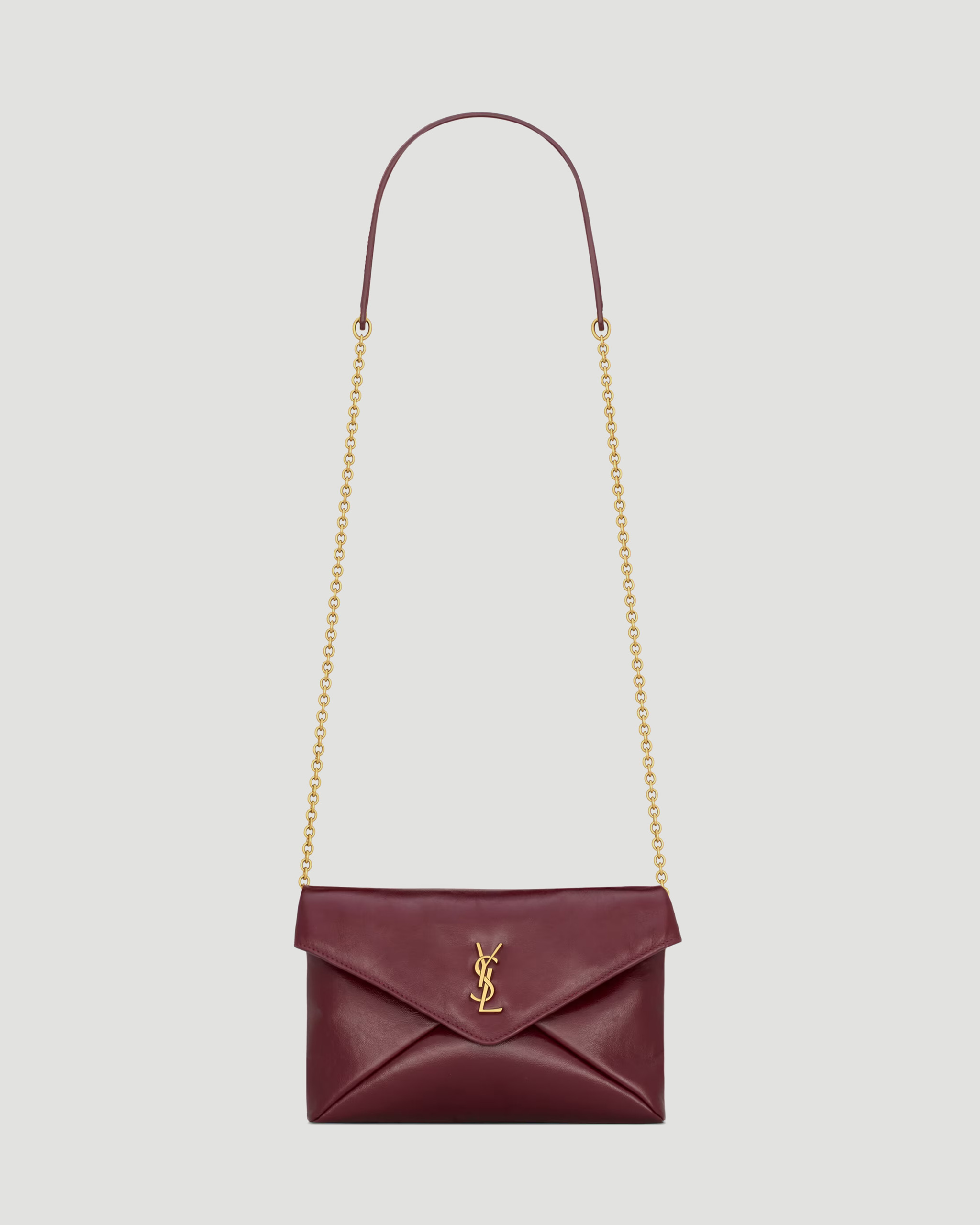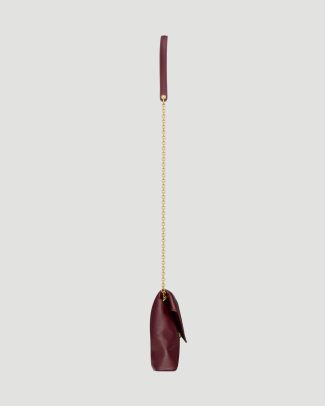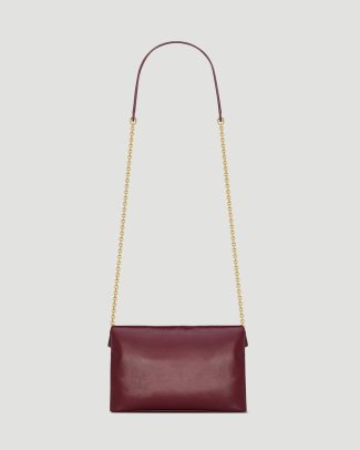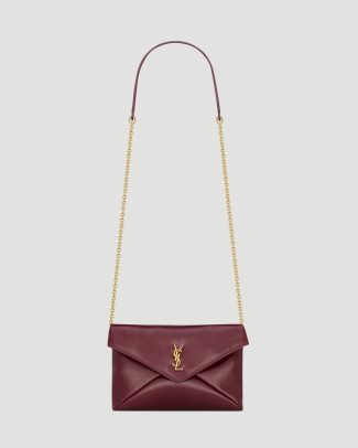 This chain pouch in shiny leather by Saint Laurent is crafted from dark ruby calfskin, featuring the Cassandre, leather lining, bronze-tone hardware, magnetic closure, and one card slot. It can be carried by hand as a clutch or on the shoulder.