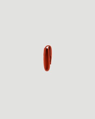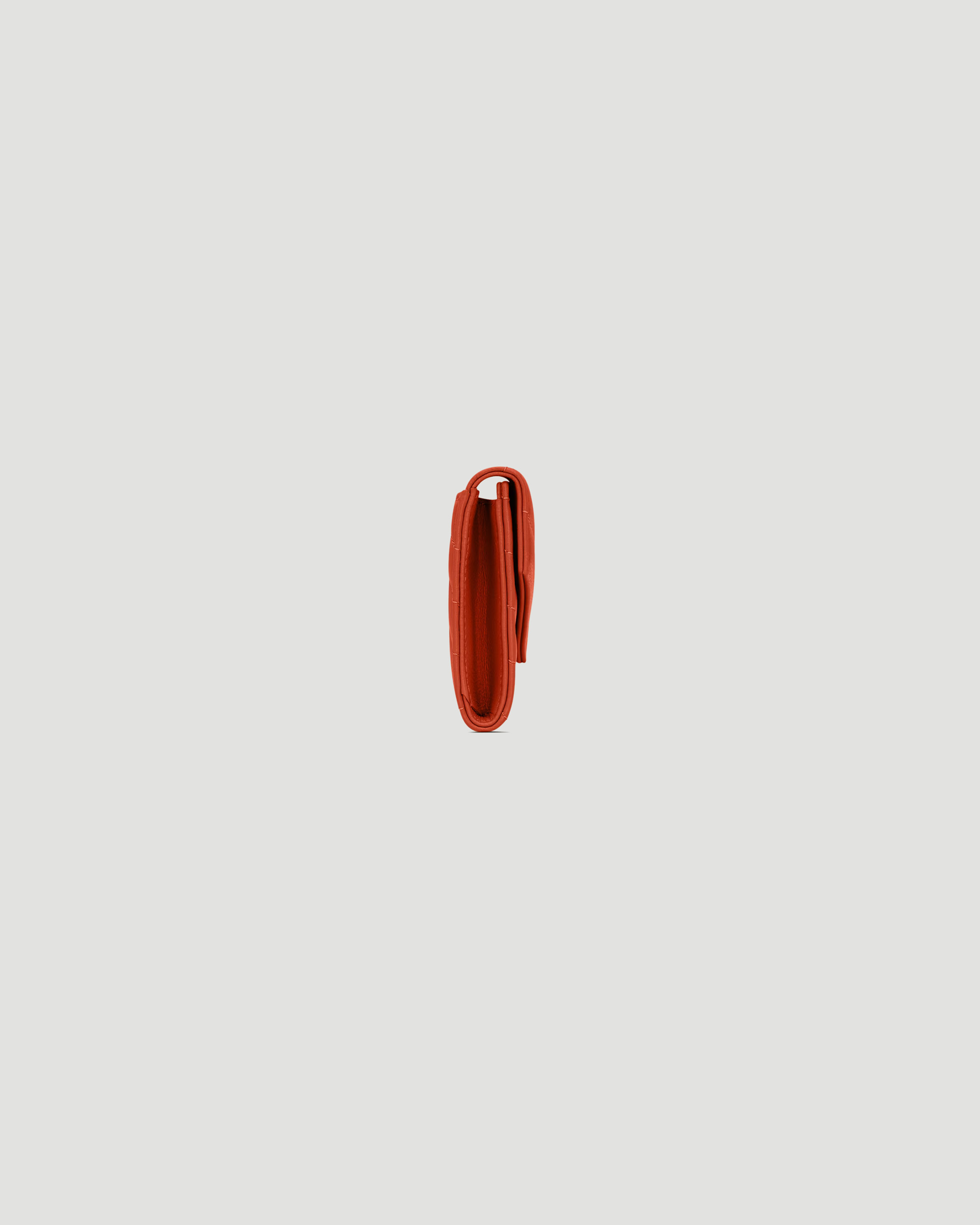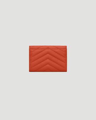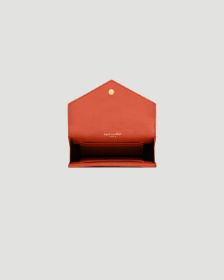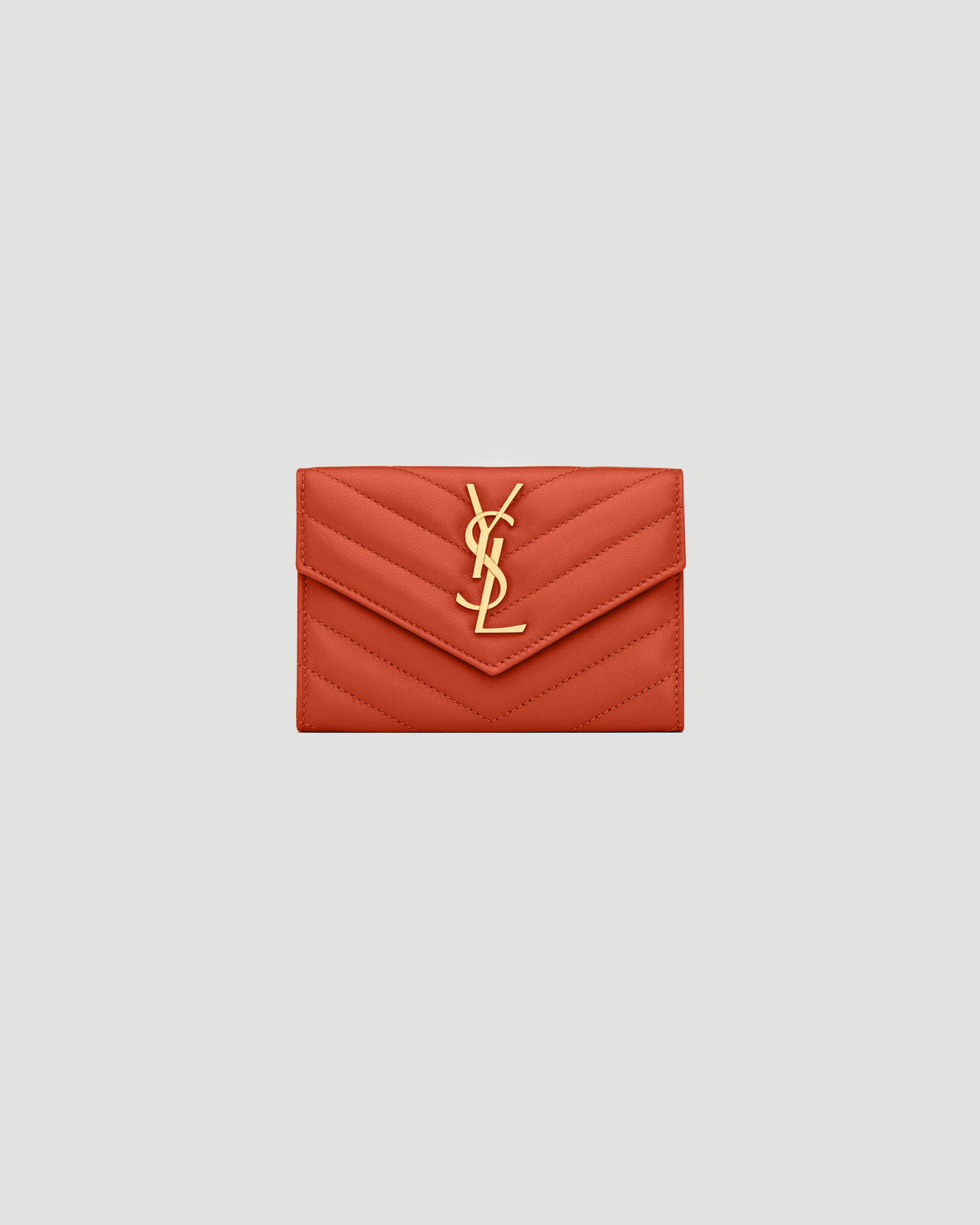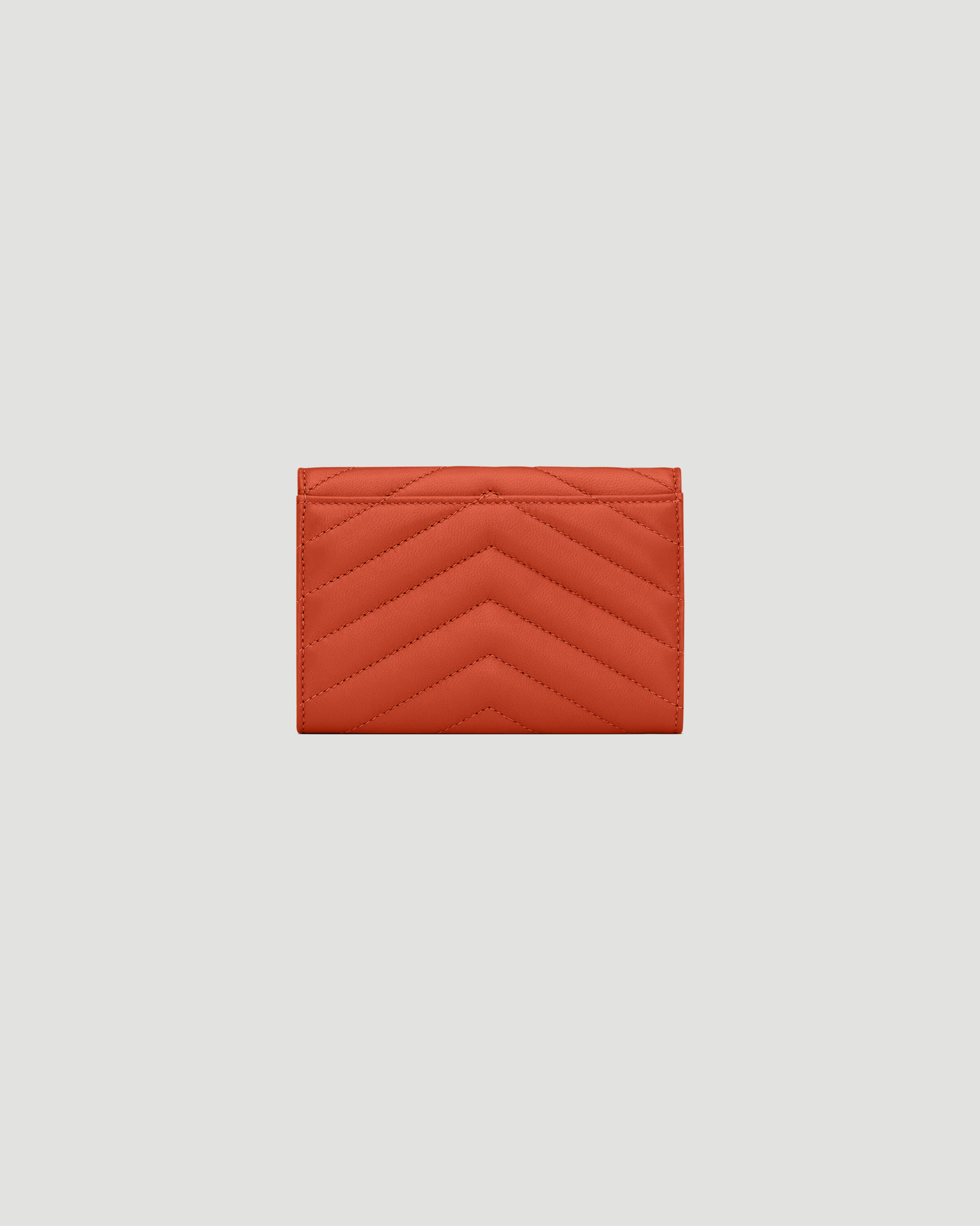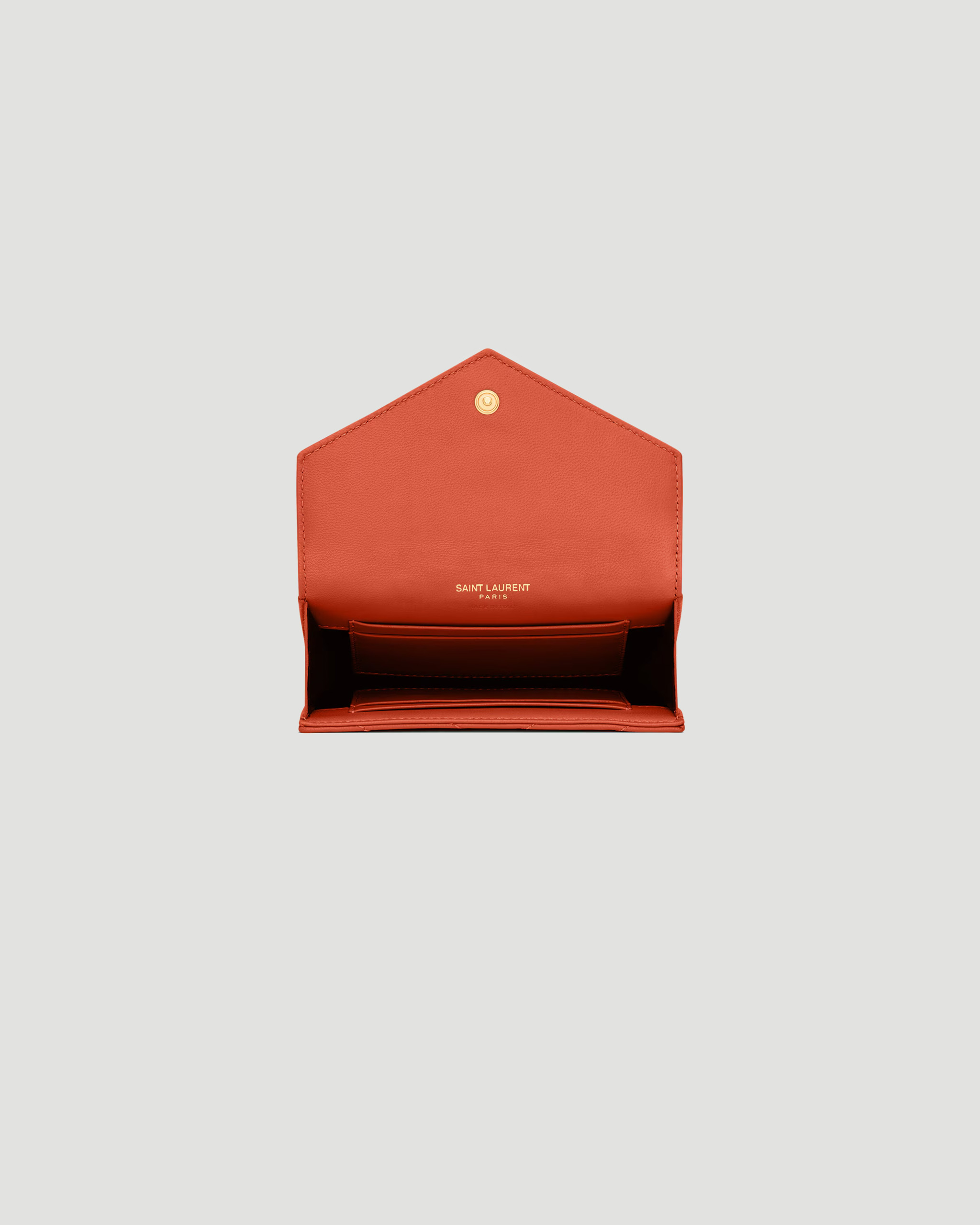 This Cassandre lambskin wallet in dark mandarin by Saint Laurent is an envelope-style design with quilted stitching, leather lining, gold details, snap button closure, four card slots, and a back pocket.