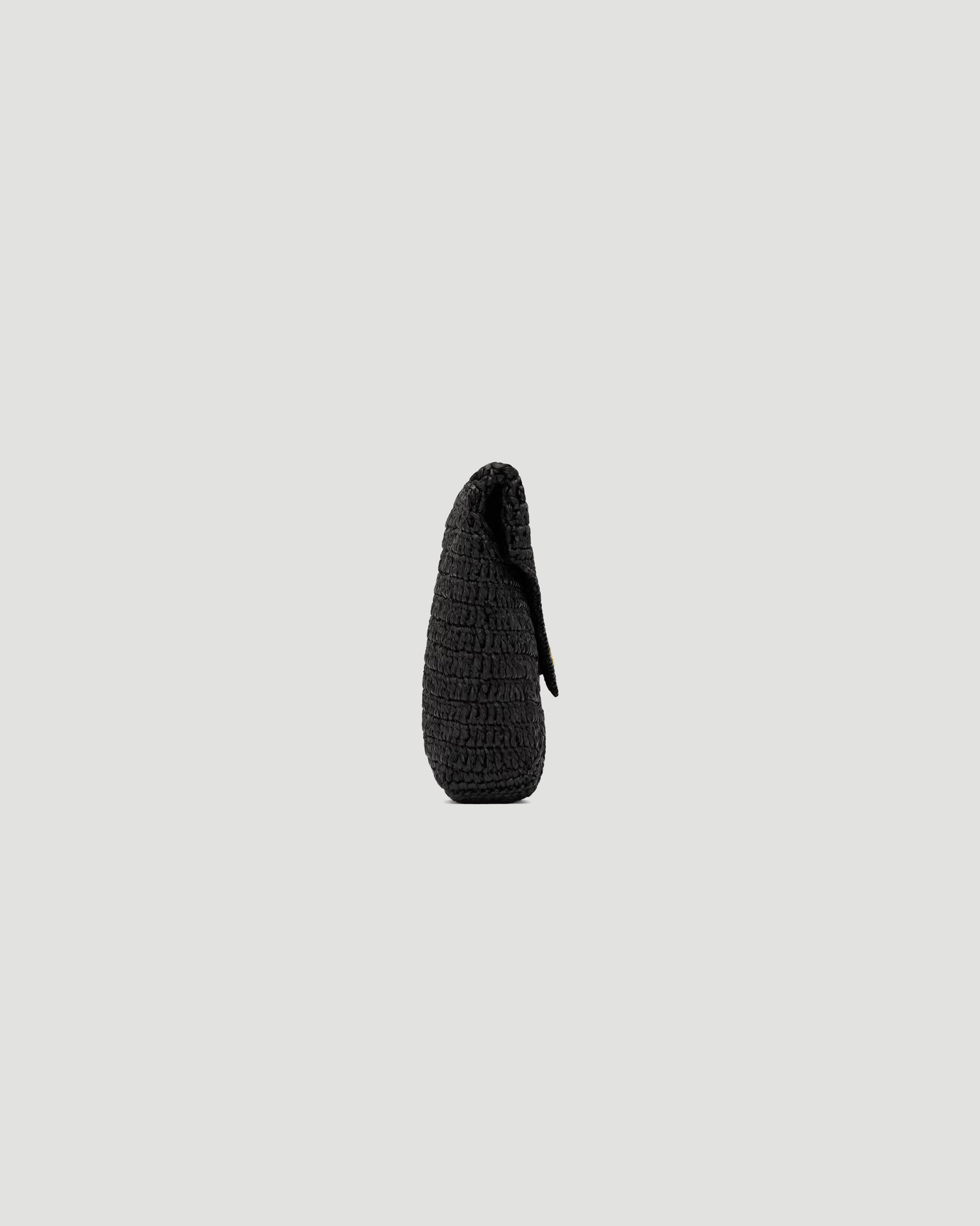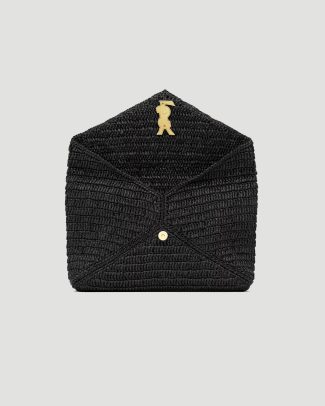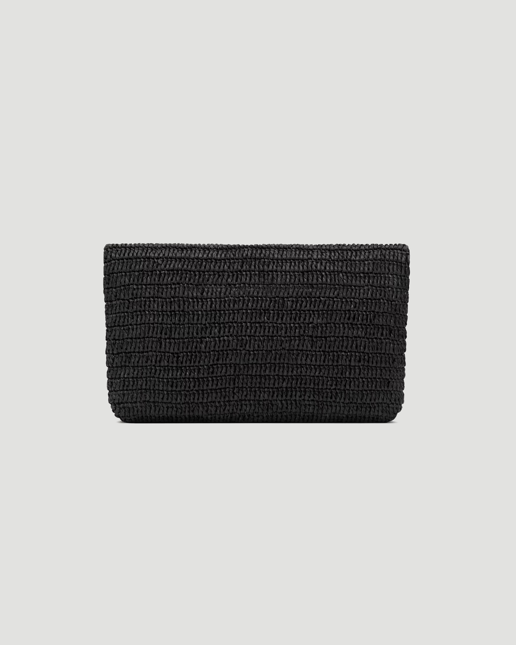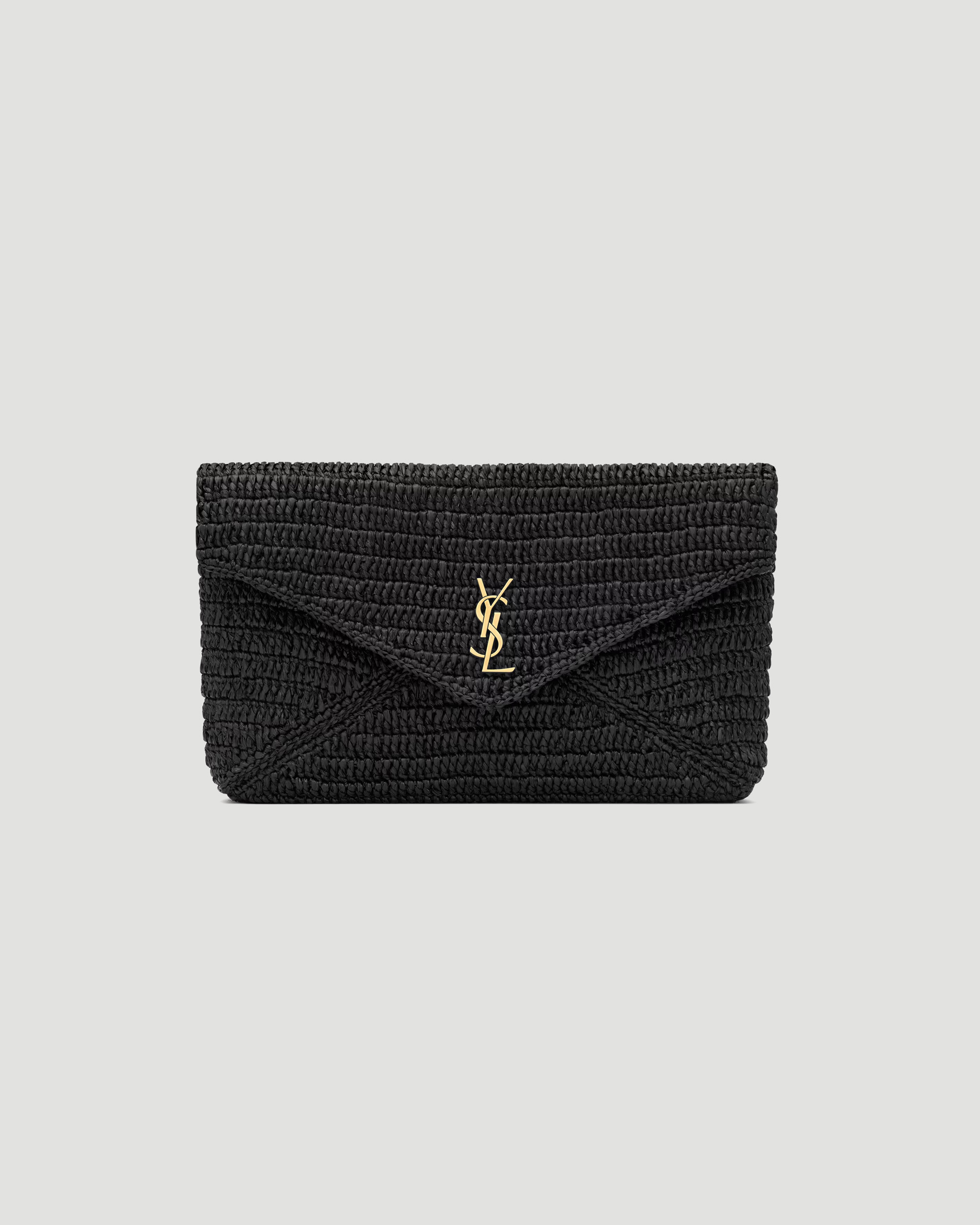 Large envelope pouch in natural woven raffia by Saint Laurent, finished with the Cassandre emblem, bronze-tone hardware, and a magnetic snap closure.
