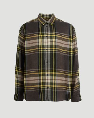 Relaxed-fit shirt by Saint Laurent crafted from certified wool and silk. Features a pointed collar, front button closure, one-button cuffs, and Cassandre embroidery at the hem.
