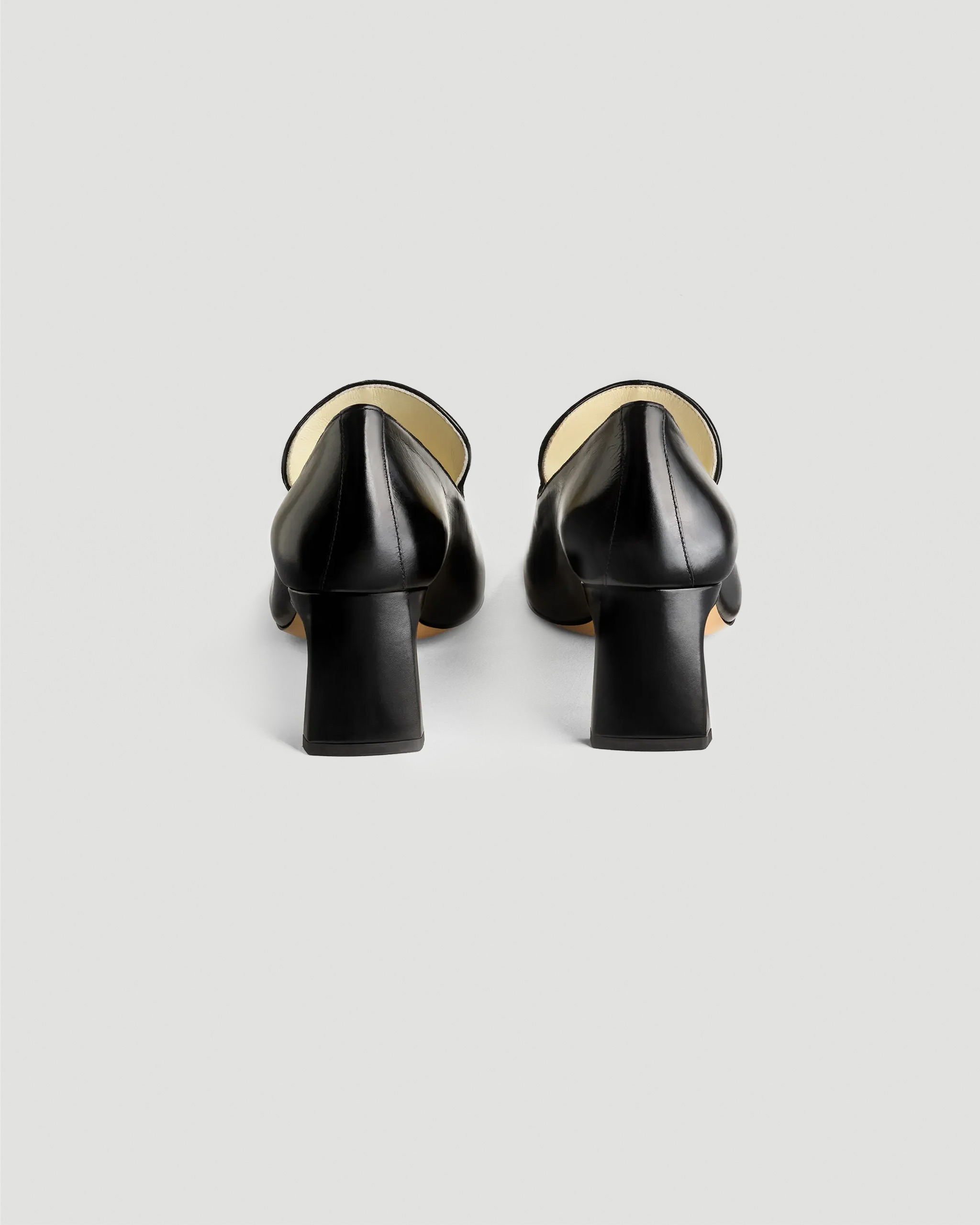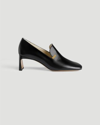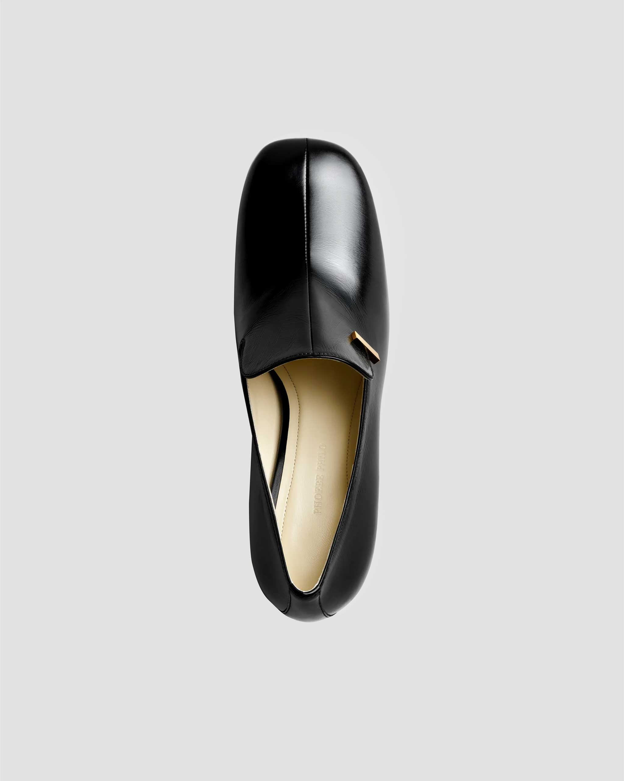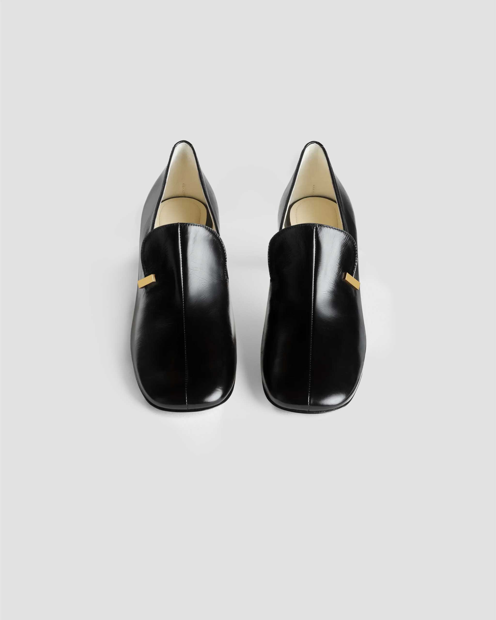 The Club Loafer by Phoebe Philo is crafted from soft, high-shine black leather. It features a long, narrow silhouette with a full sole, a lightly padded fixed insole, and a 60mm cut-away concave heel. Finished with gold-tone hardware, it strikes a balance between classic form and sculptural edge.