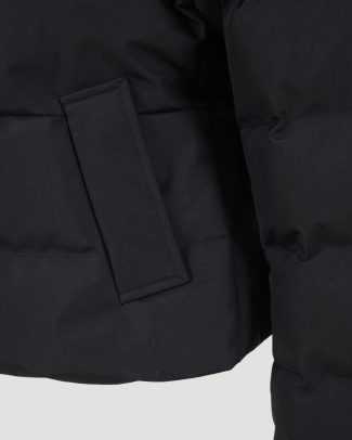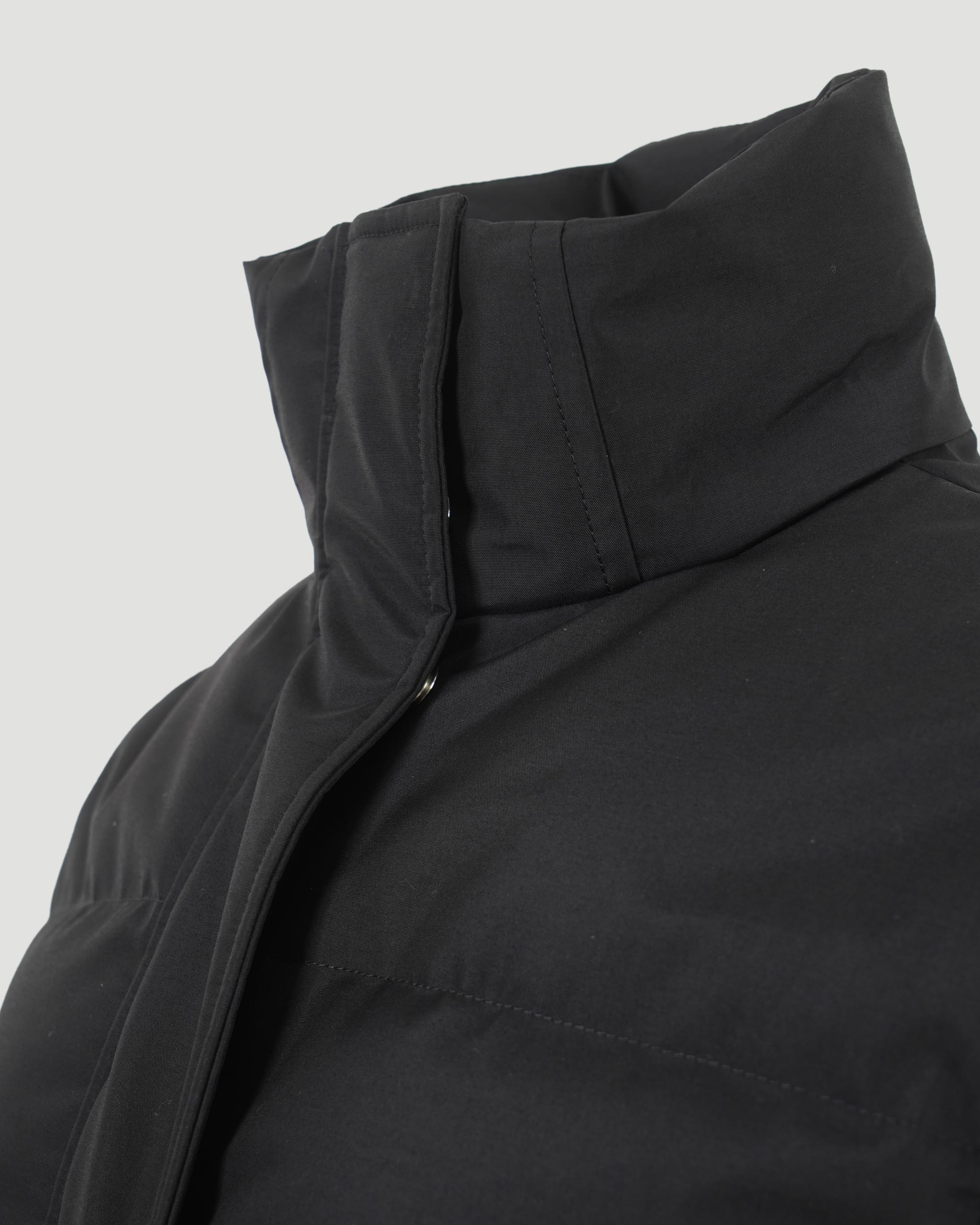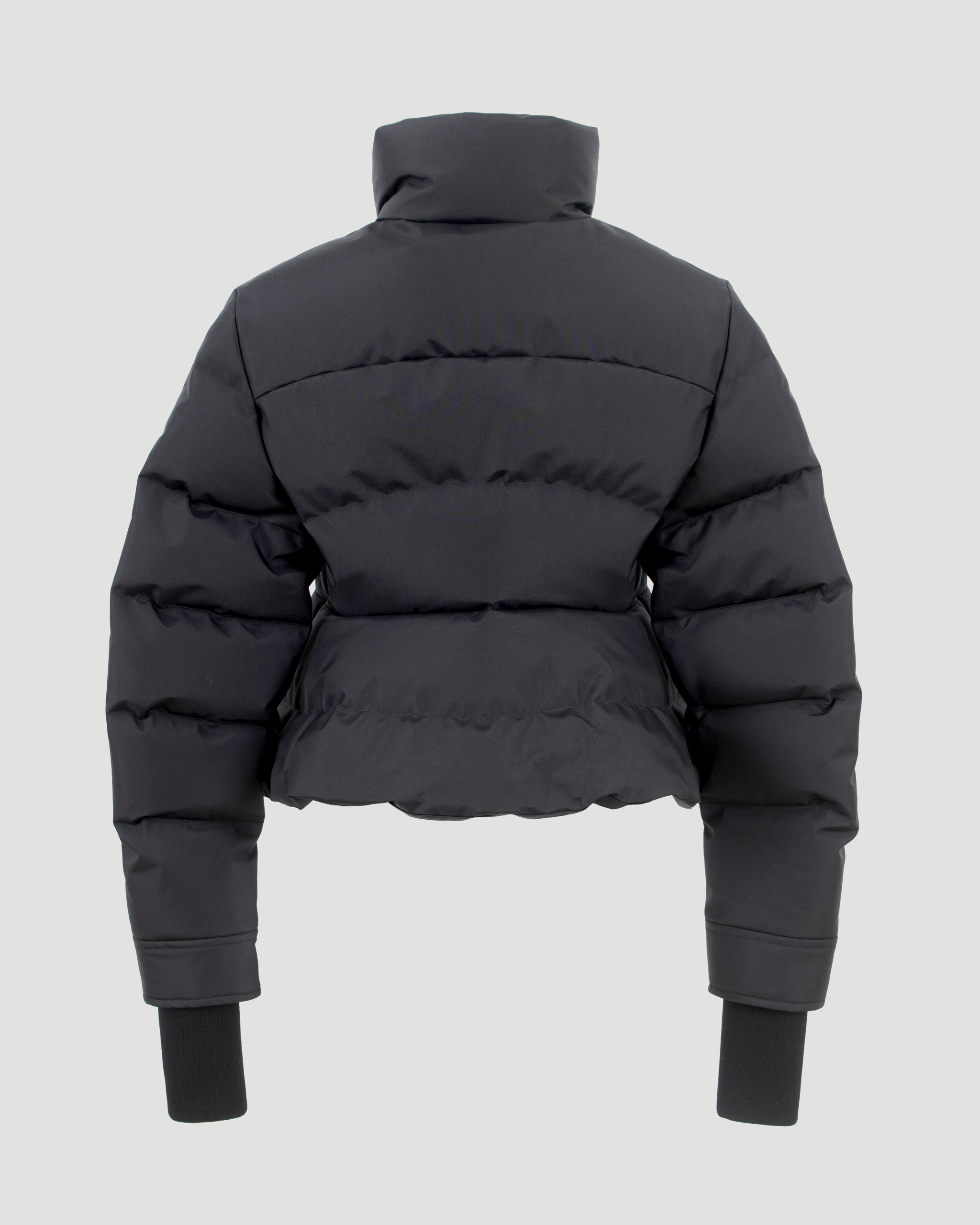 Cropped down jacket by Alexander McQueen in quilted technical fabric, padded with goose feathers. Designed with a cinched waist, standing collar, and front zip with snap button closure. Features side pockets and long sleeves finished with knitted cuffs.