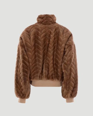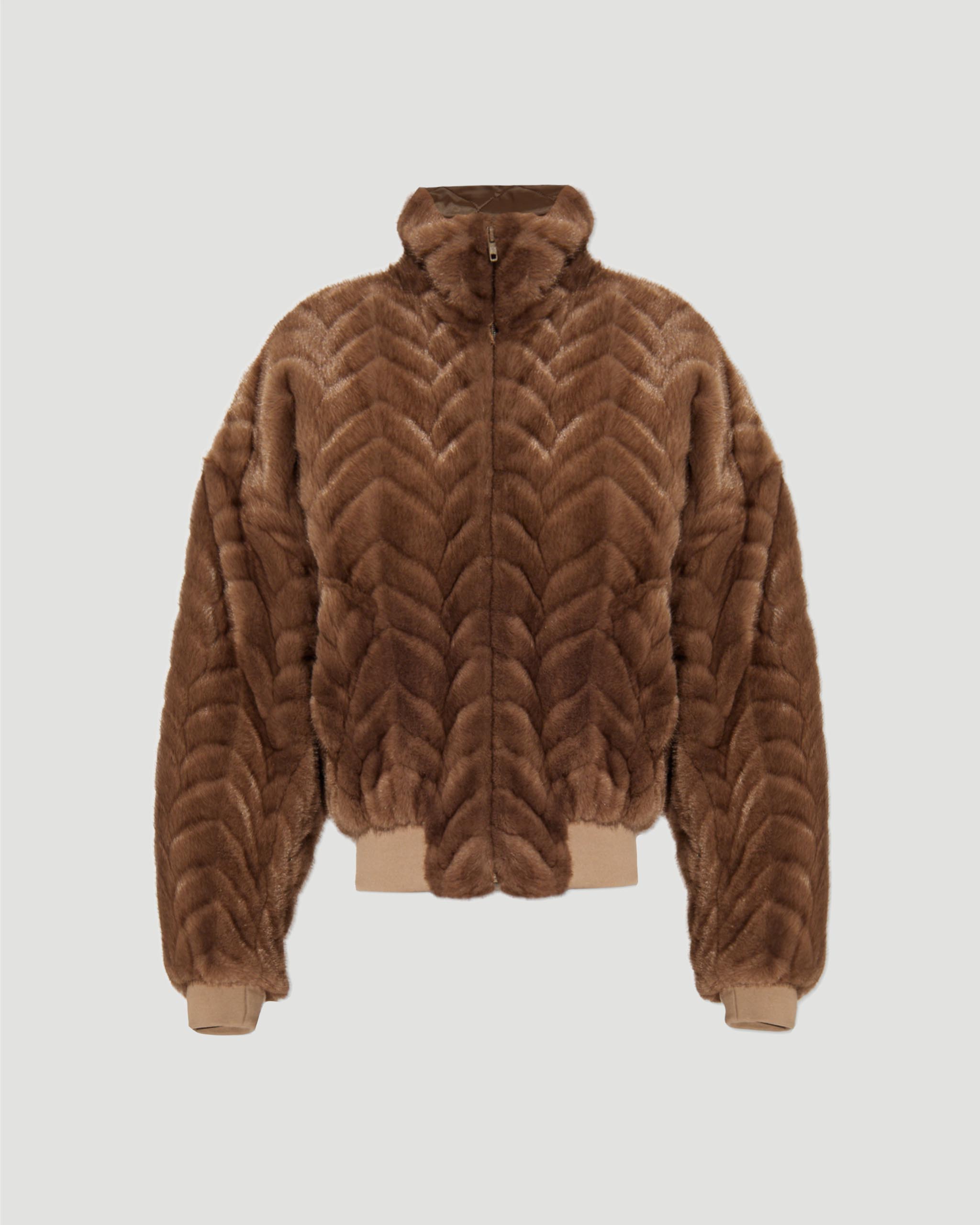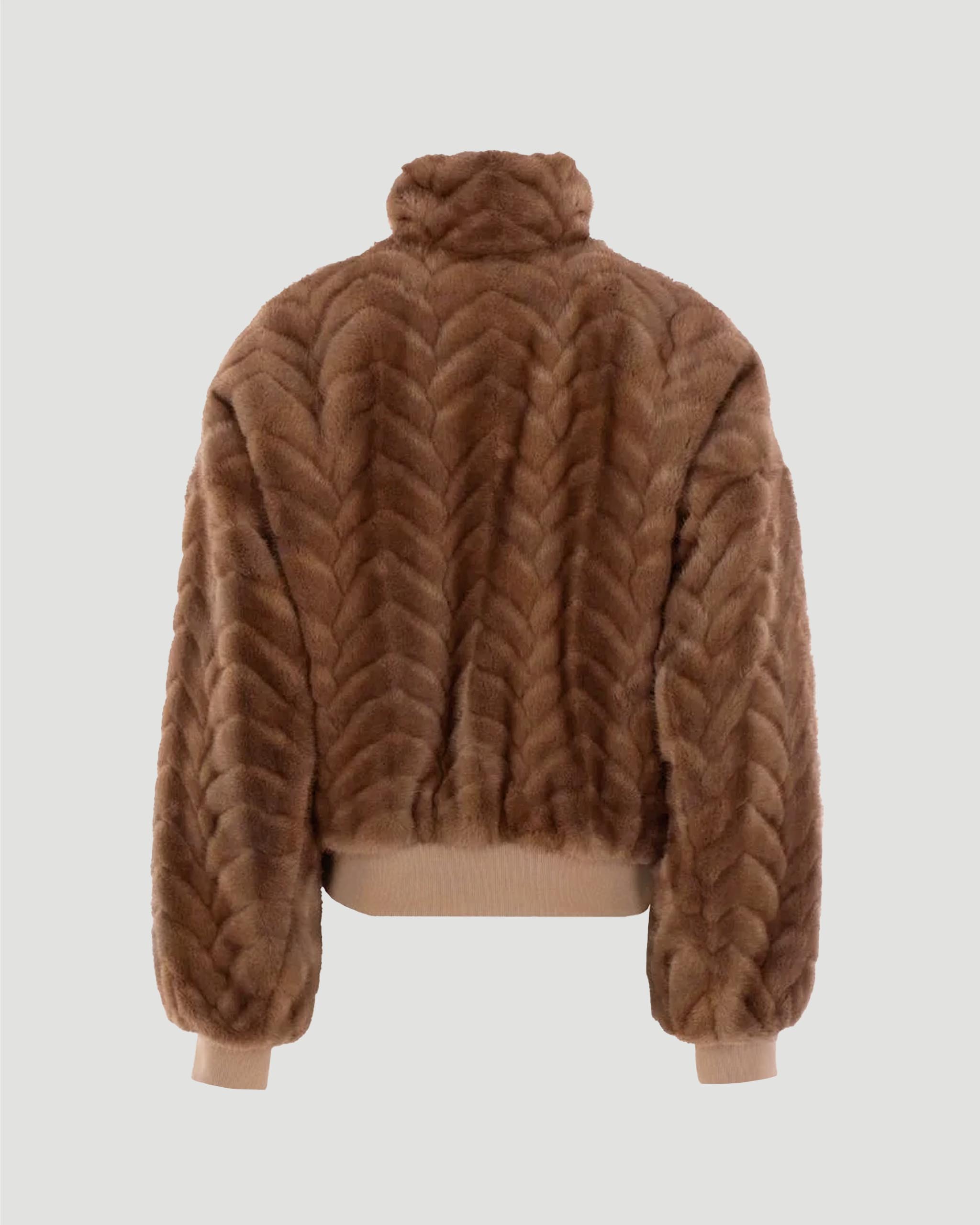 This Balenciaga cropped jacket is made from recycled polyester with animal-free fur. It features a high collar, rounded sleeves, two front slash pockets, a zipped closure, and ribbed trims.