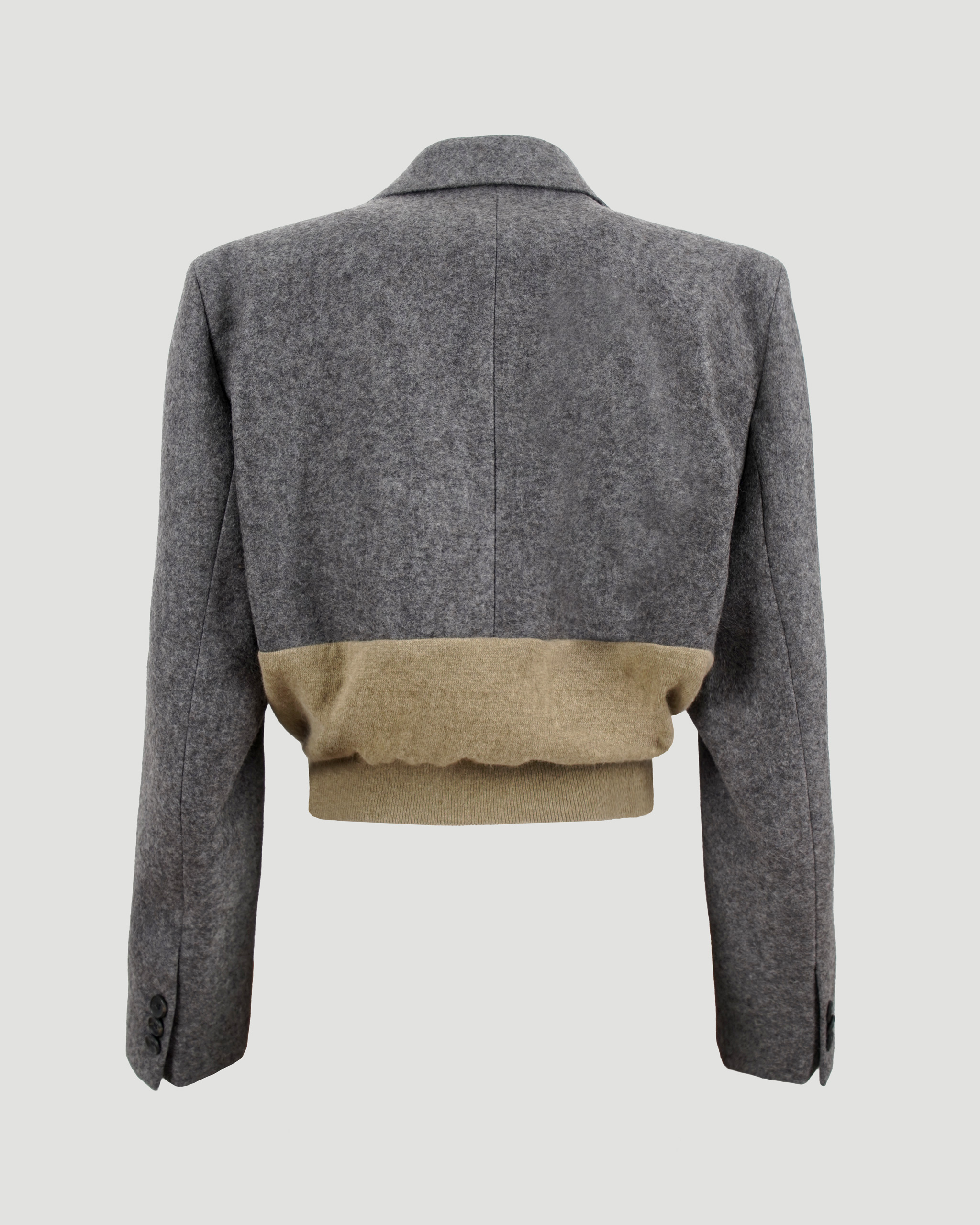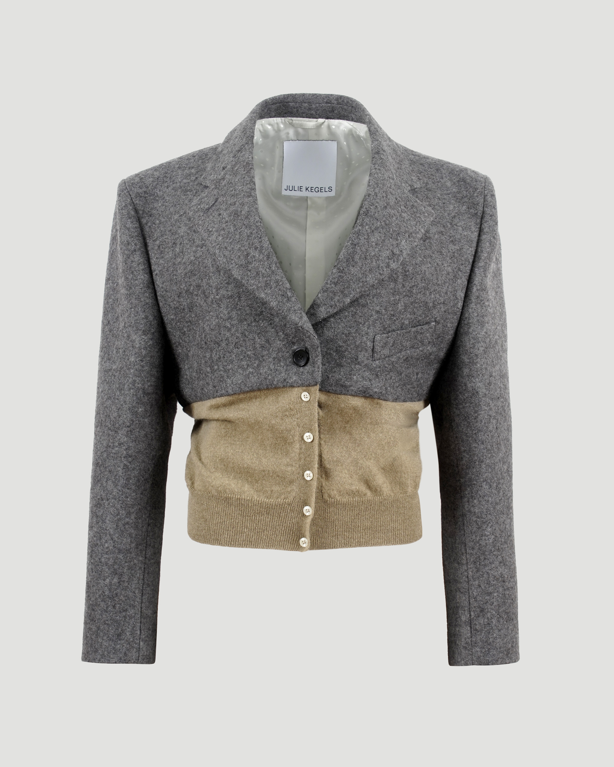 Cropped wool blazer by Julie Kegels, designed with a contrast effect between a single-breasted blazer and a cardigan. Features button closures, a chest welt pocket, and notched lapels. Finished with a slick jacquard satin lining for a refined touch.