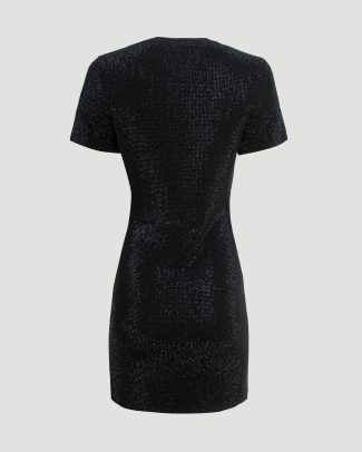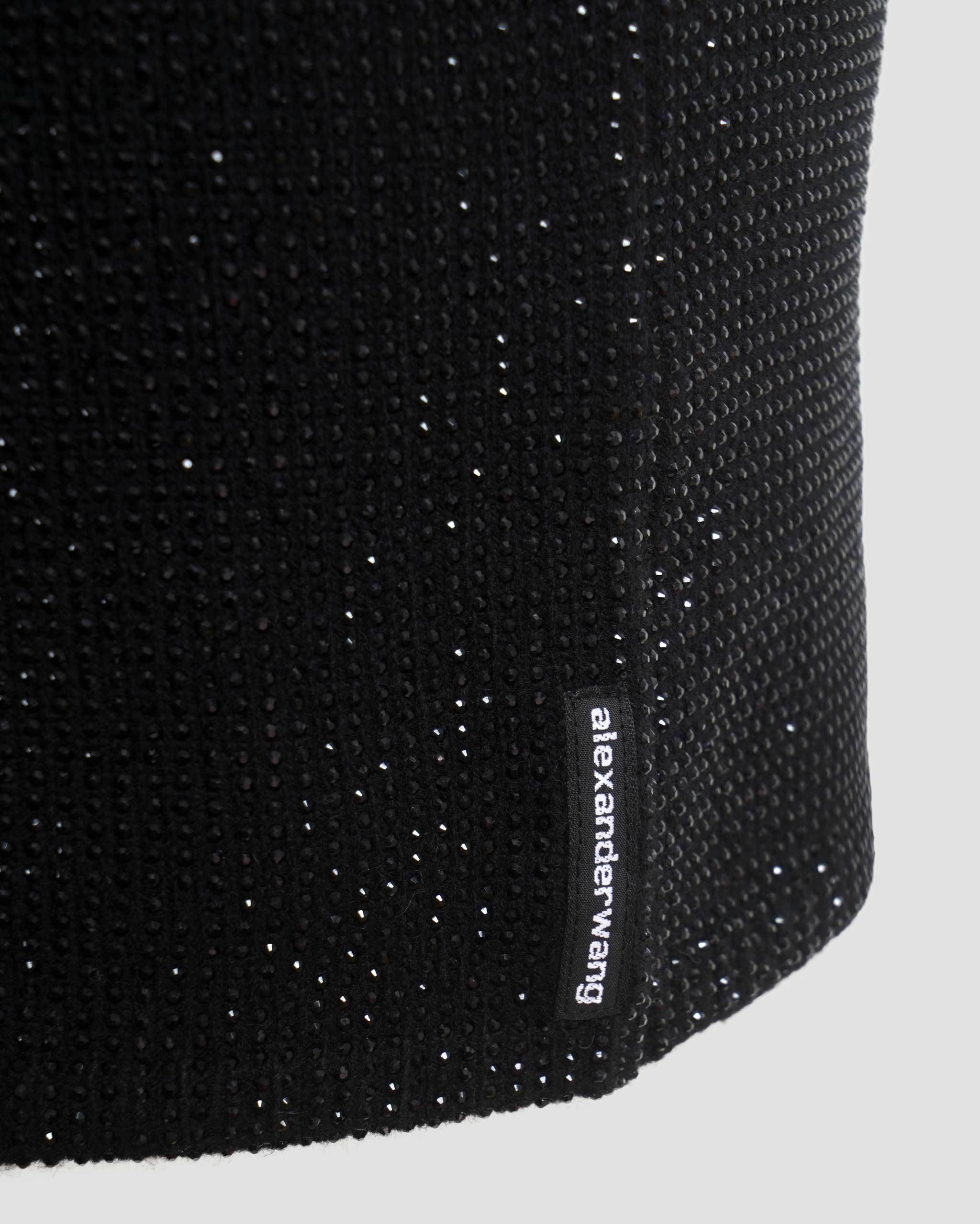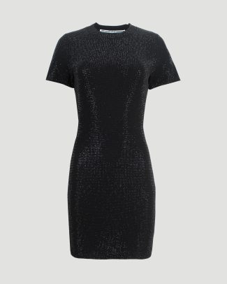 This black dress by Alexander Wang is crafted from luxurious boiled wool, creating a sleek bodycon silhouette that hugs your figure. It features an allover crystal hotfix design, adding a touch of sparkle and glamour to your outfit. Finished with a subtle logo at the hem, a crewneck, and rib trim.