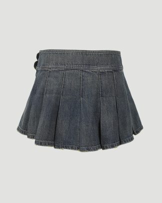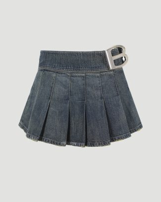This pleated mini skirt in stonewashed stretch cotton denim by Balenciaga features a side zip and belt with oversized metal logo buckle.
