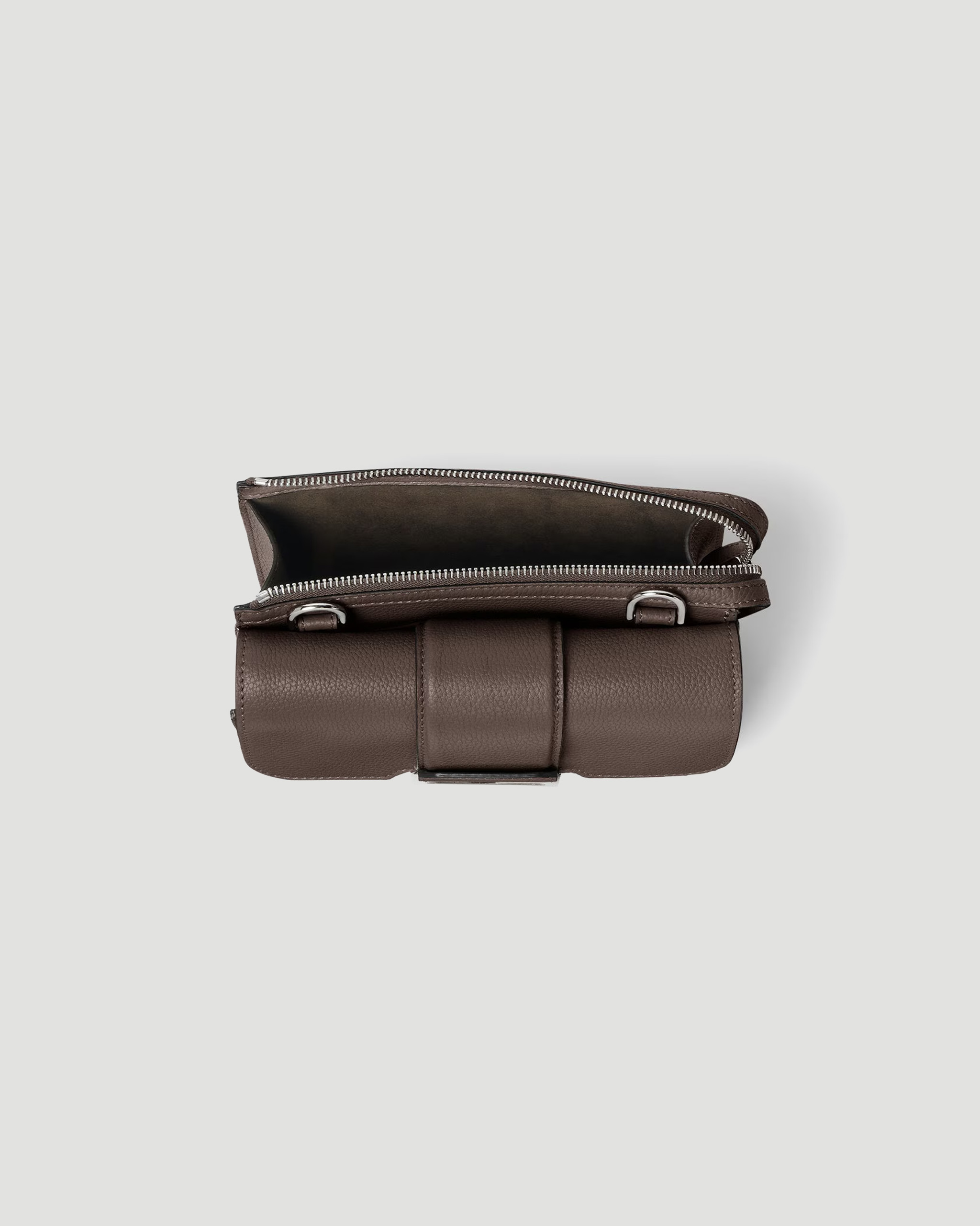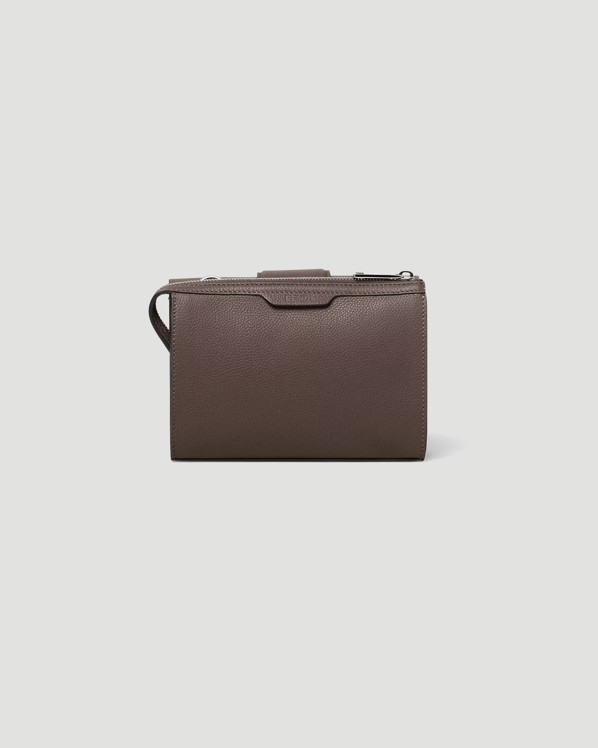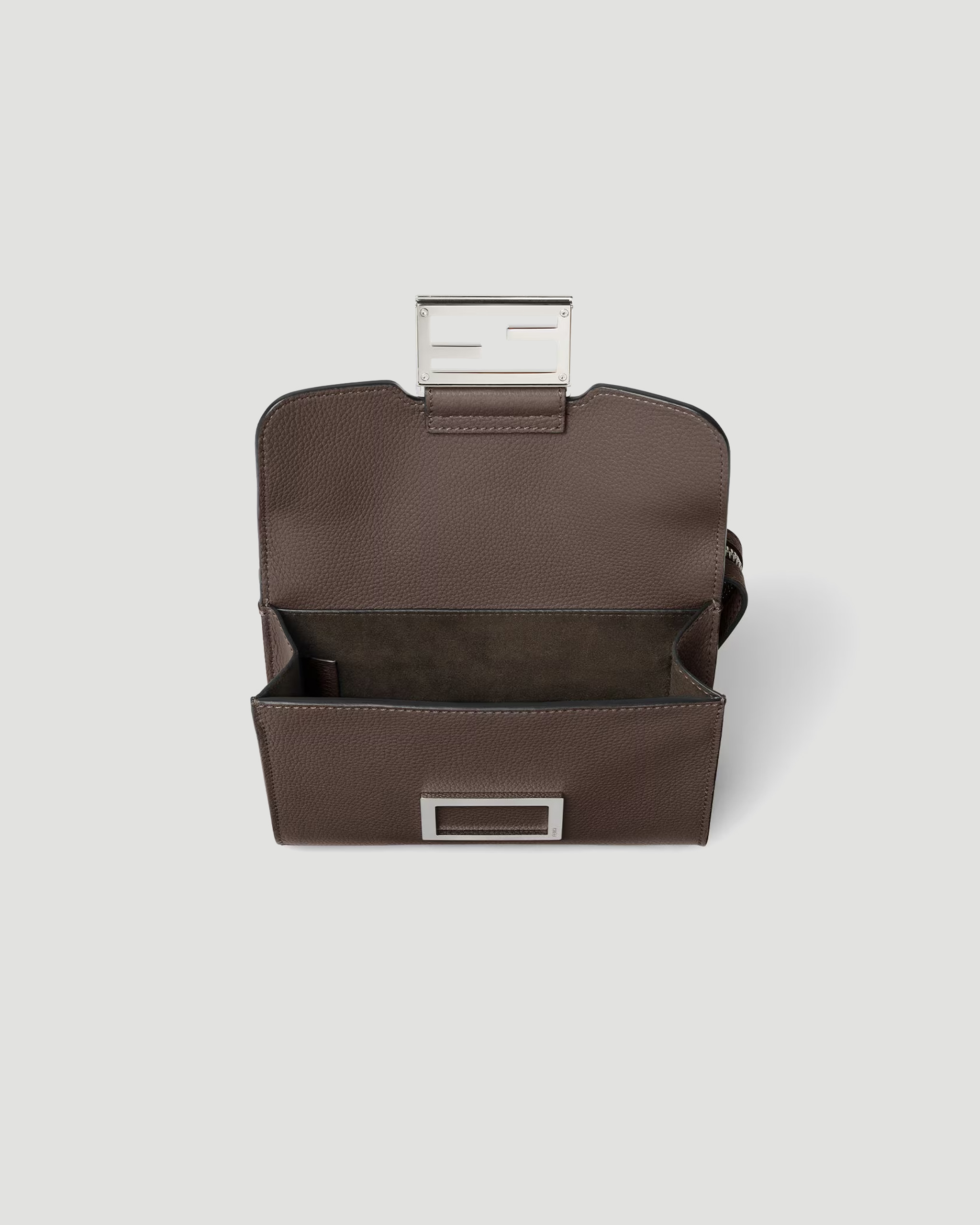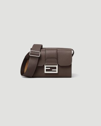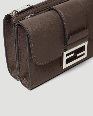 The Fendi Double Baguette bag is crafted from dark brown full-grain leather and divided into two compartments: one with a square flap and FF magnetic clasp, the other with a zip closure. Designed with a flat pocket and strap hooks between the compartments, it features a lined interior and palladium-tone metalware. The adjustable technical fabric crossbody strap, in a matching tone, is embellished with Fendi lettering.