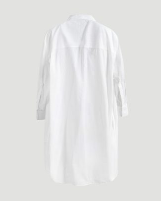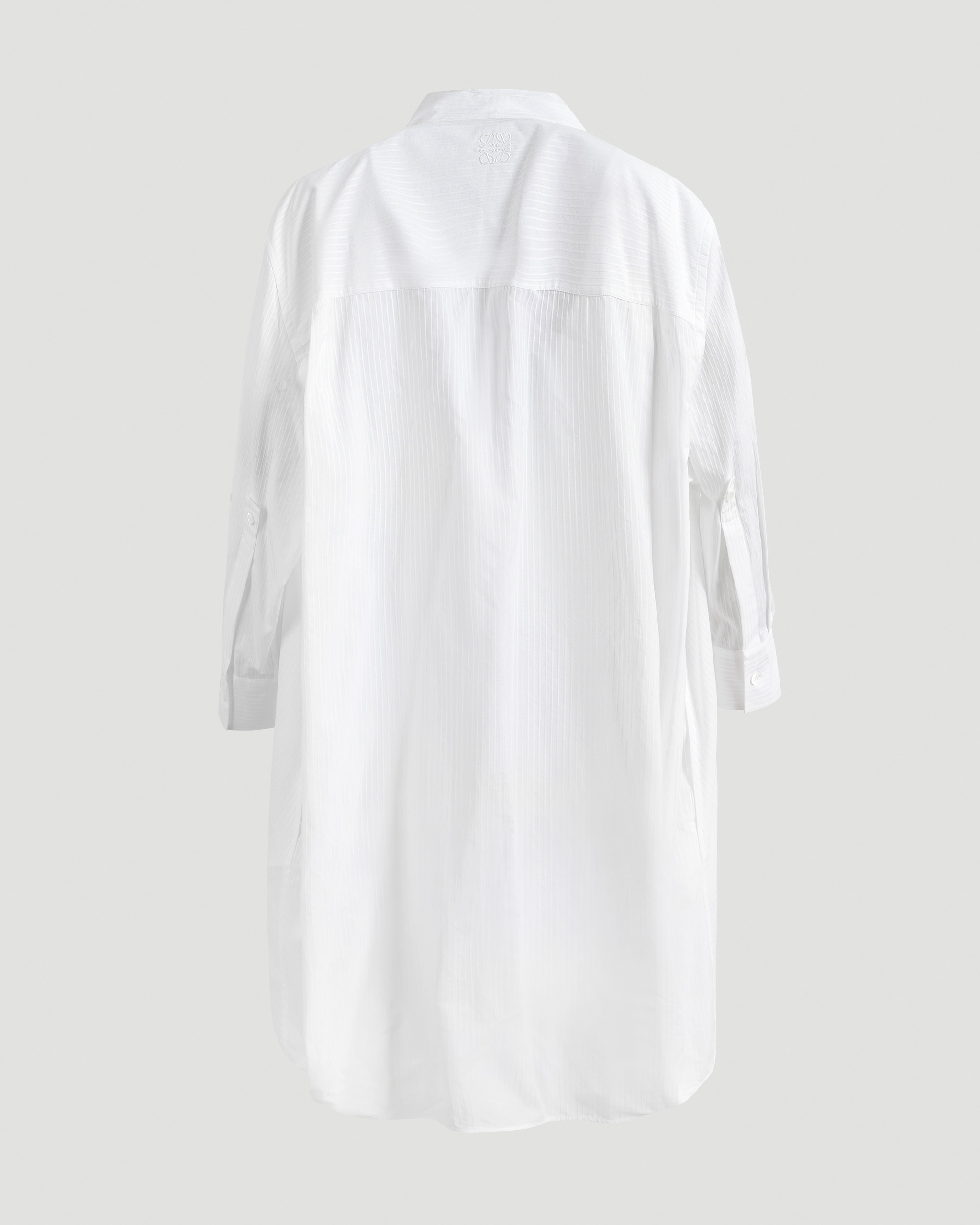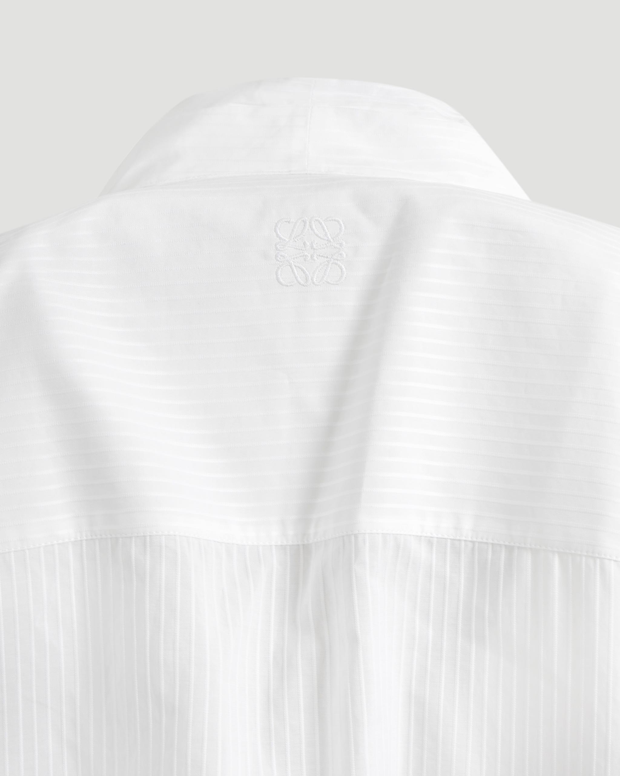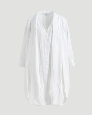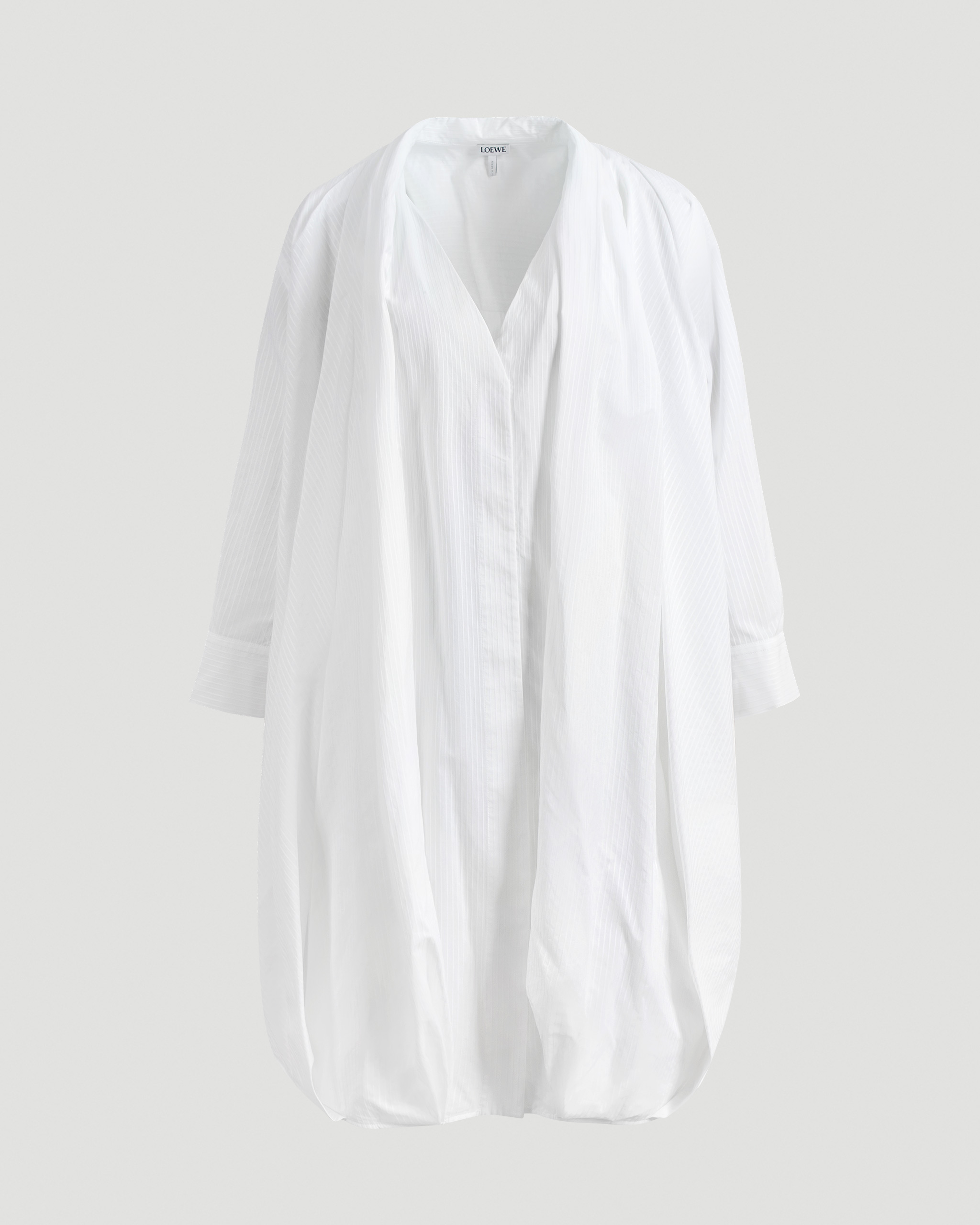 Loewe dress in lightweight textured cotton poplin, shaped in a balloon silhouette with front draping. Cut to a relaxed fit and short length, it features a V-neck and concealed button front fastening. Finished with Anagram embroidery at the back for a subtle signature touch.