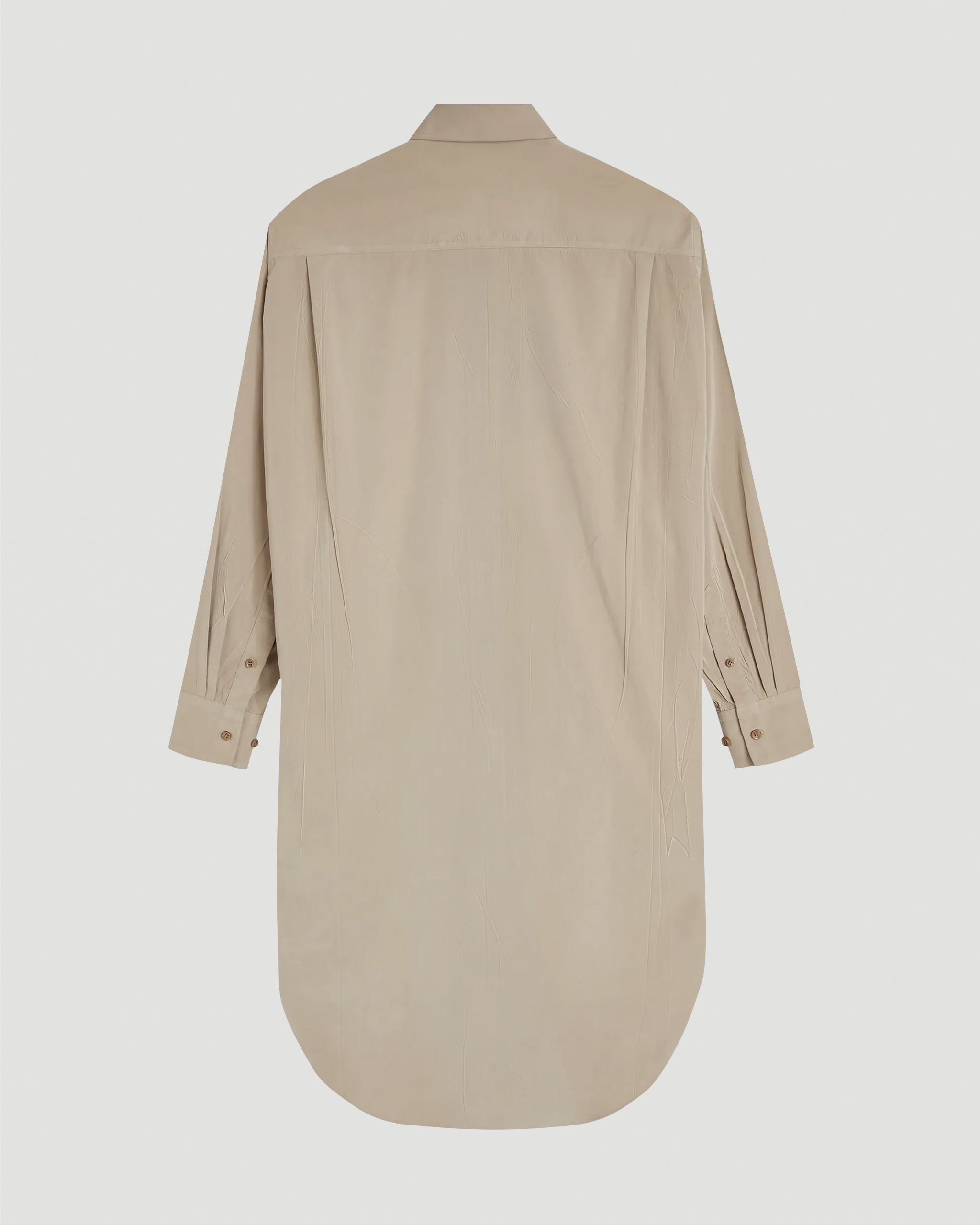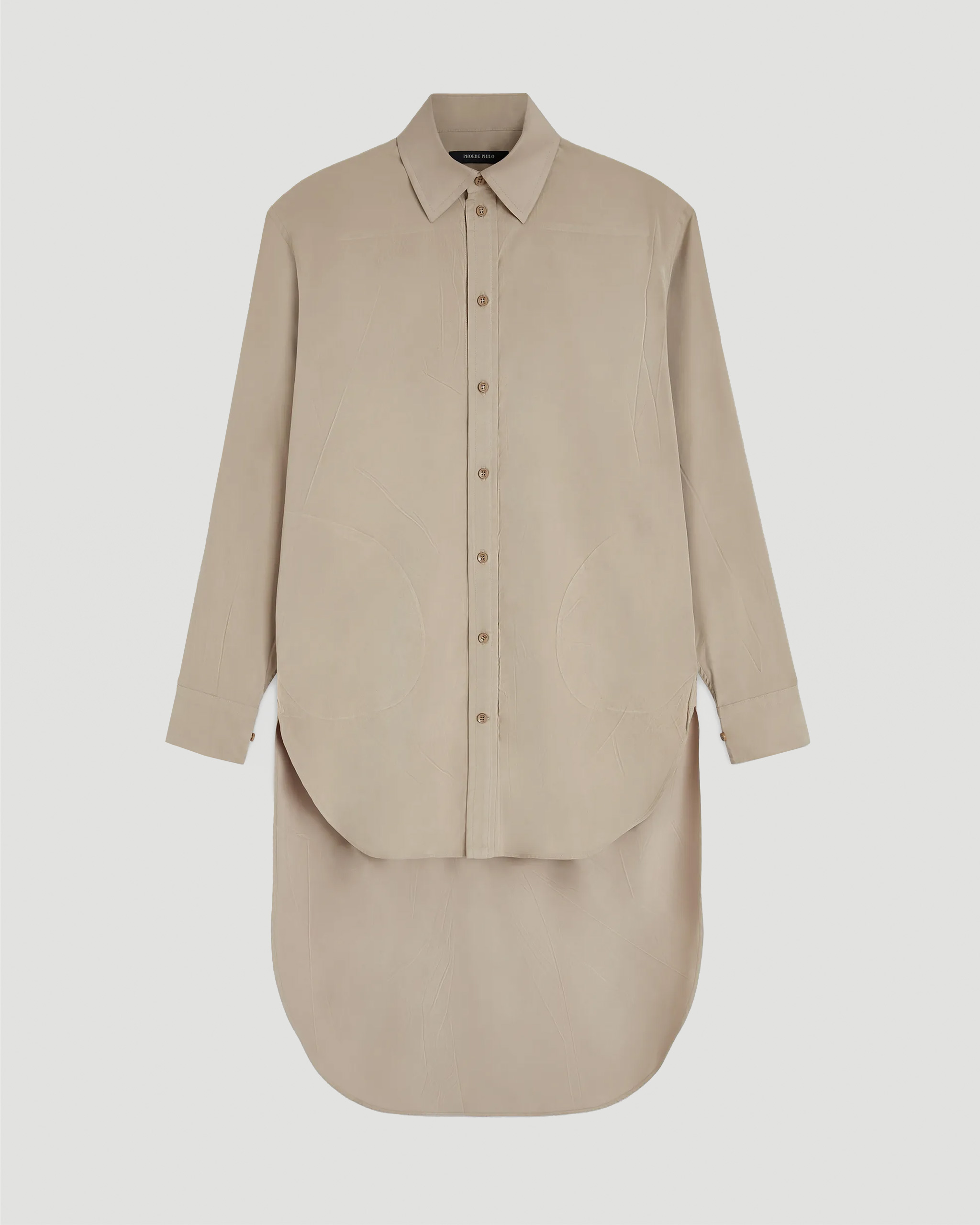 This asymmetric shirt by Phoebe Philo is cut from trench poly twill in an eased silhouette. Featuring a regular-length front and an extended back, it’s detailed with a classic collar and button fastenings, offering a fluid take on tailored structure with subtle directional shift.