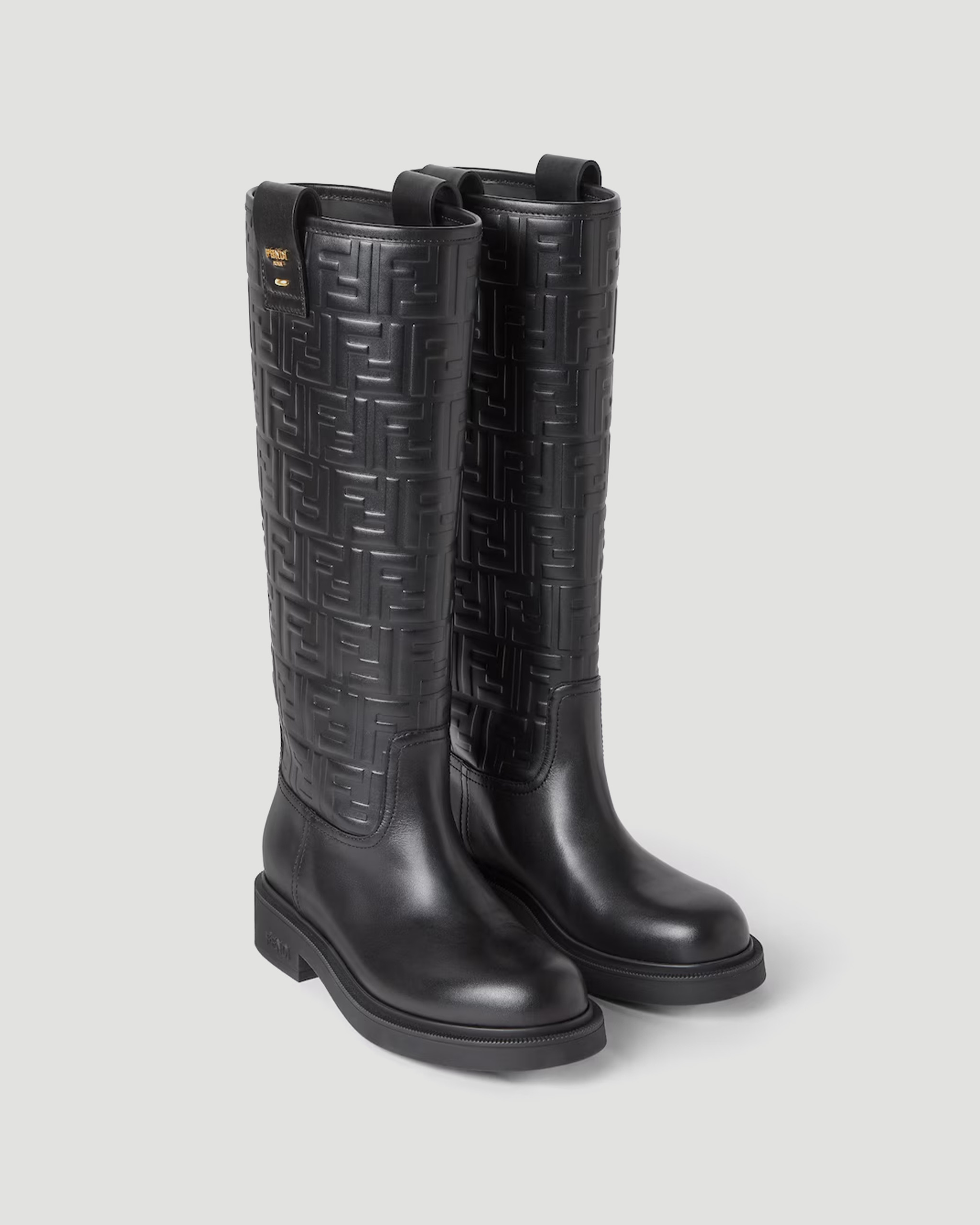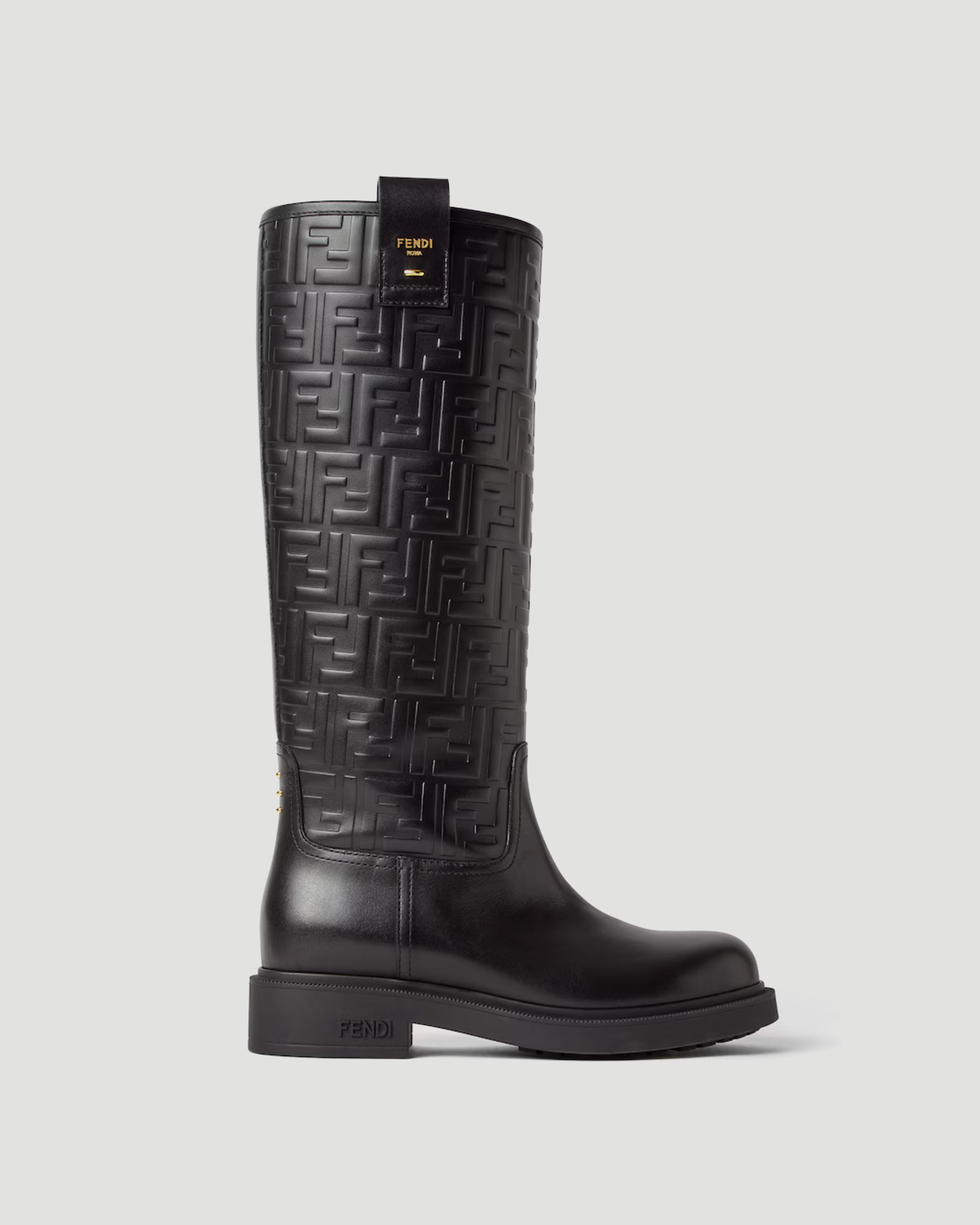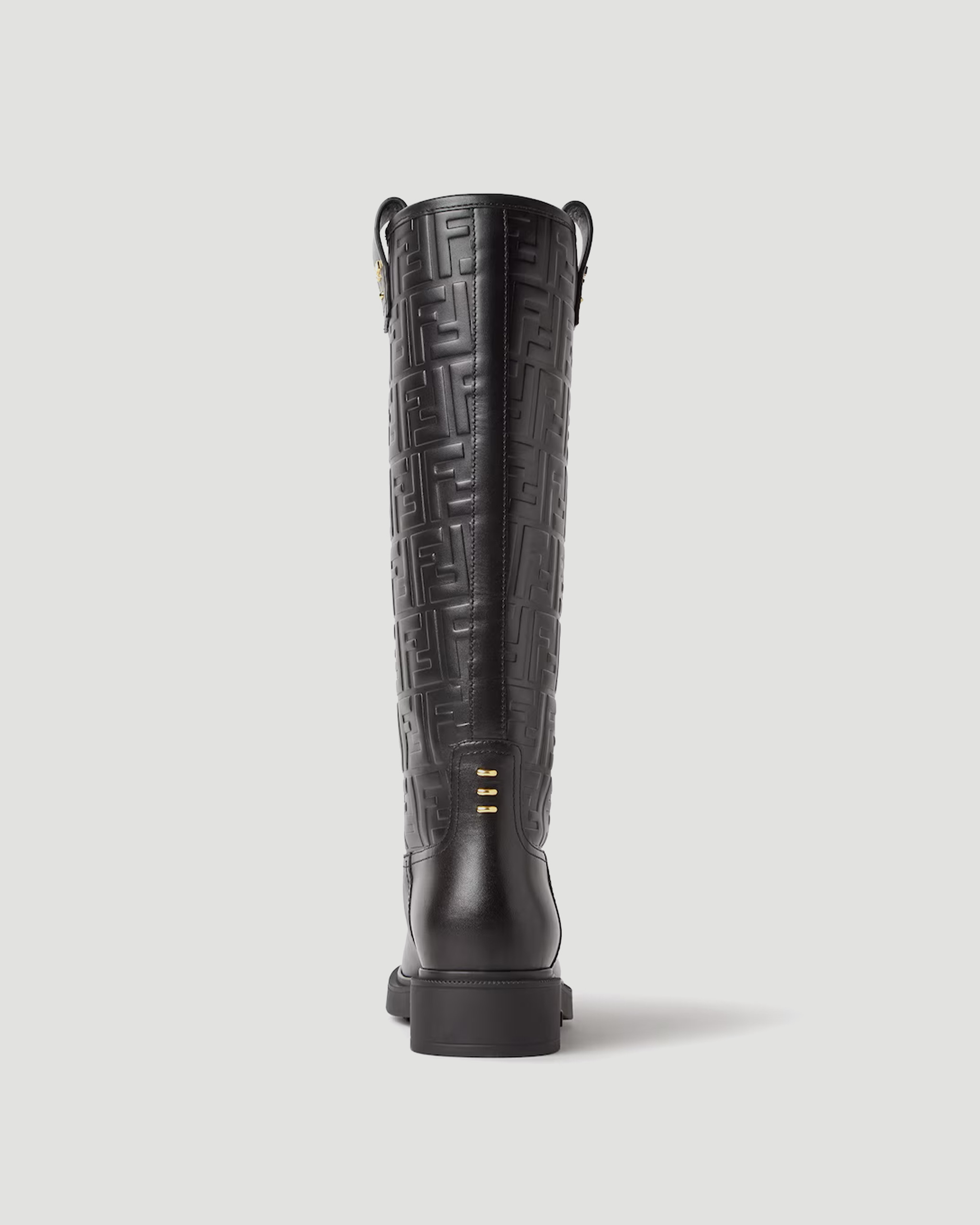 The Fendi tubular leg boots are made from black leather with a round toe and a leg showcasing the FF motif in heat-stamped relief. They are decorated with Selleria metal stitching, Fendi Roma metal lettering, and finished with a rubber sole, gold-finish metalware, and a heel detailed with Fendi lettering on the side.