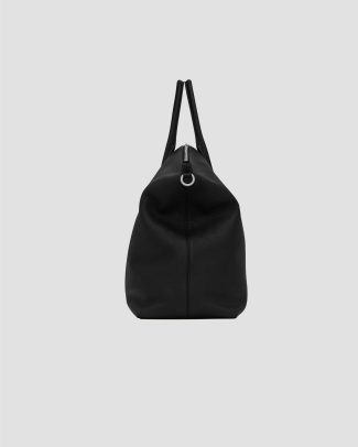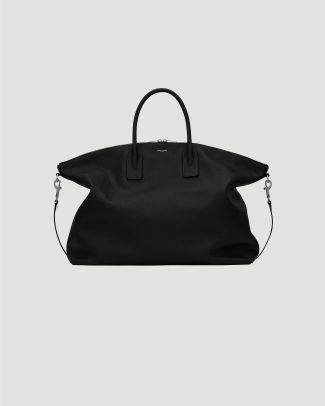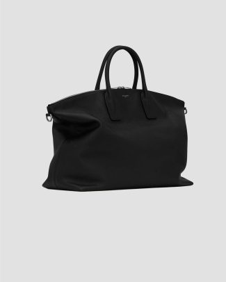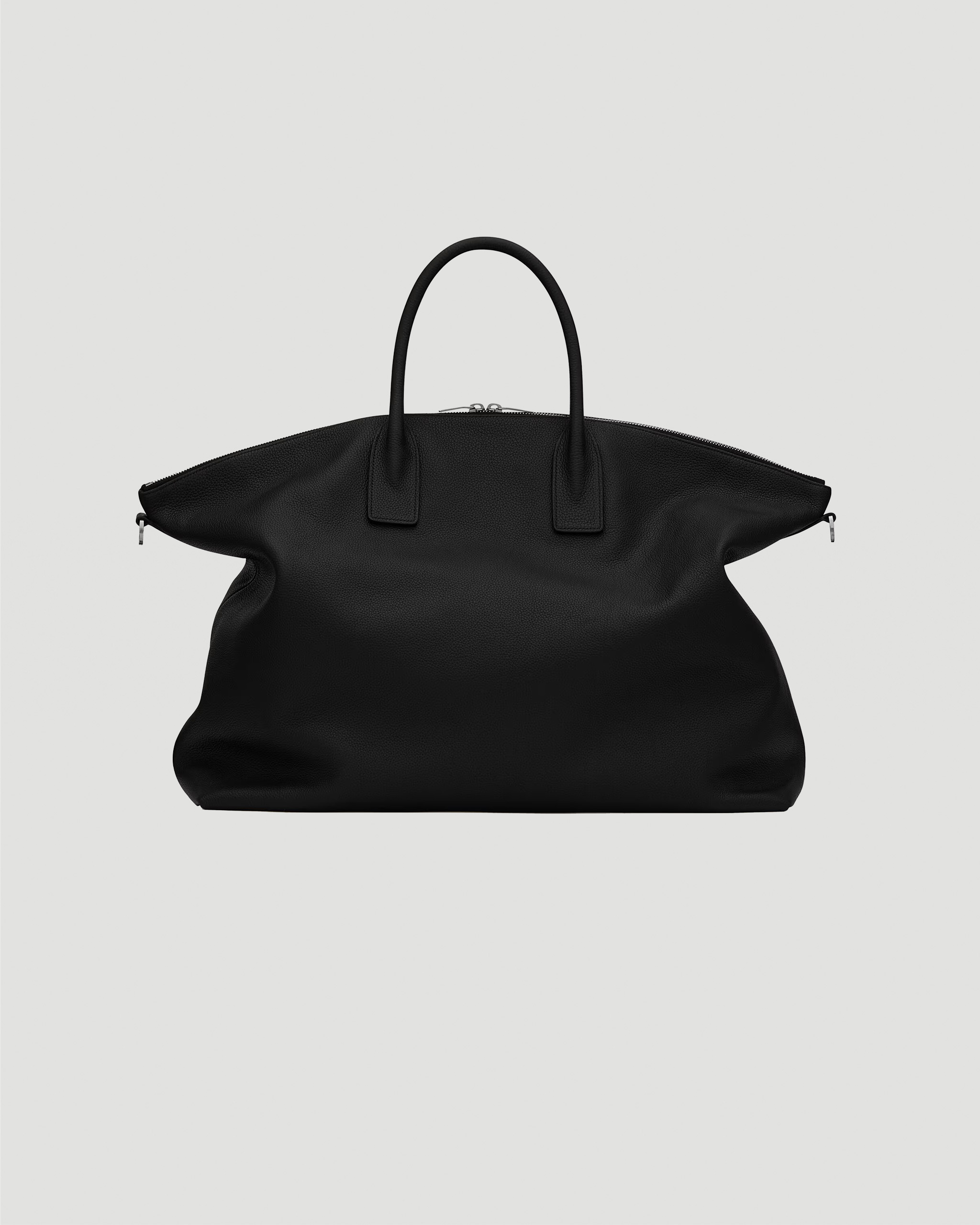 This oversized Saint Laurent embossed bowling bag features tubular leather top handles and an adjustable, detachable crossbody strap. It is detailed with silver-toned hardware, a two-way zip closure, one main compartment, and an interior zip pocket.