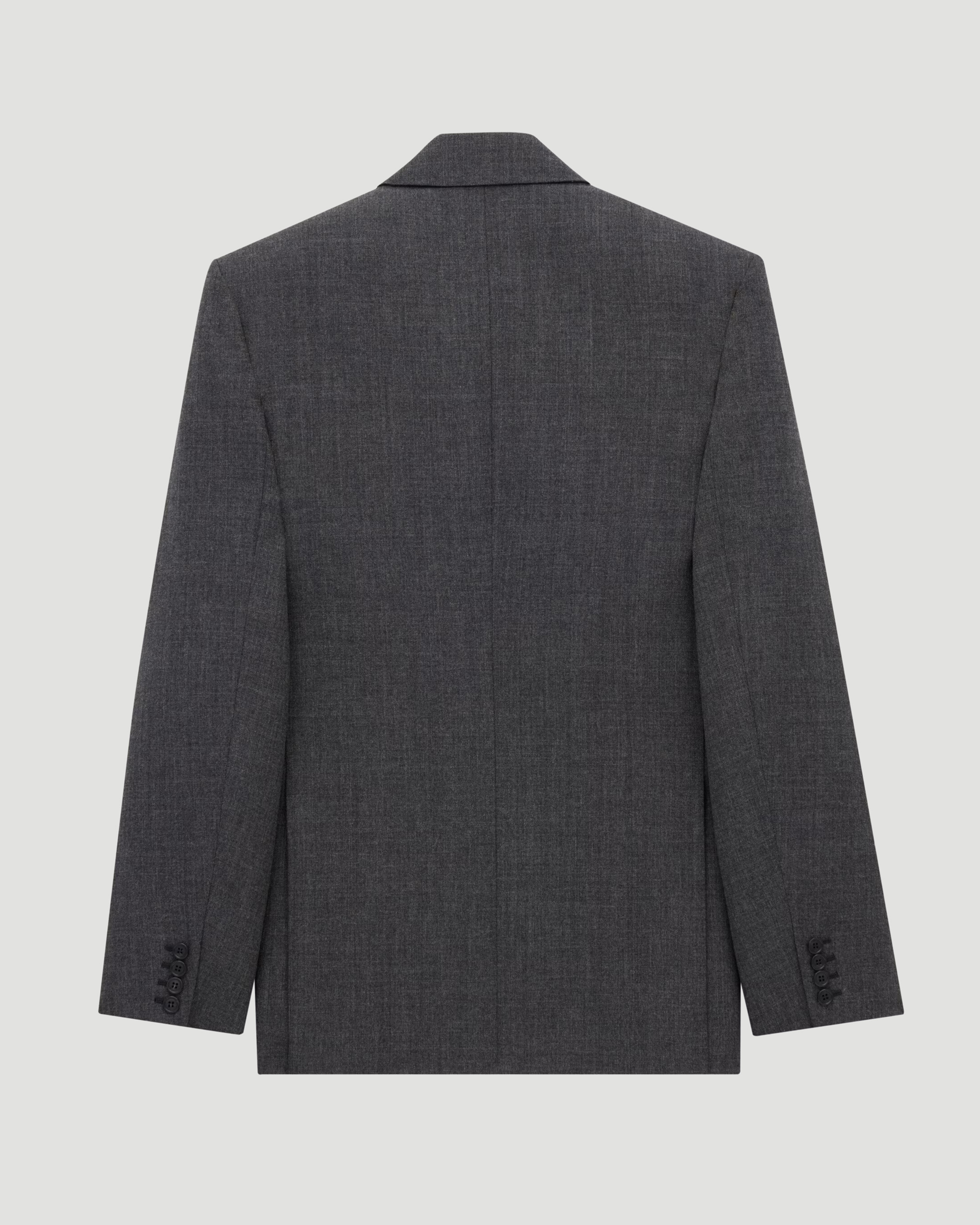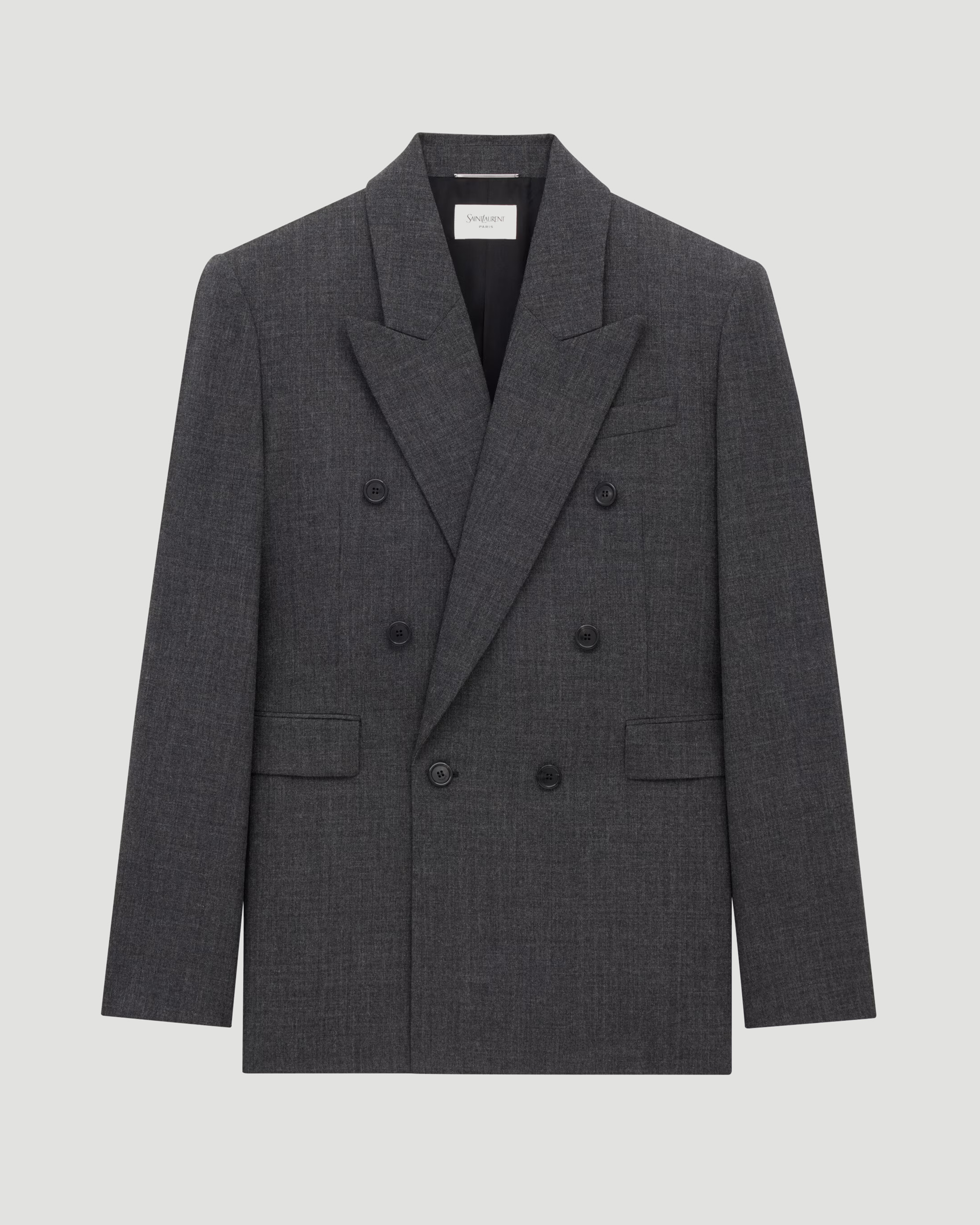 This Saint Laurent double-breasted jacket is tailored from certified wool and designed with a peaked lapel and an oversized, elongated silhouette. It features a six-button front, two front jetted pockets with flaps, a welt chest pocket, and two inner welt pockets. Finished with padded shoulders and a double back vent for structure and movement.