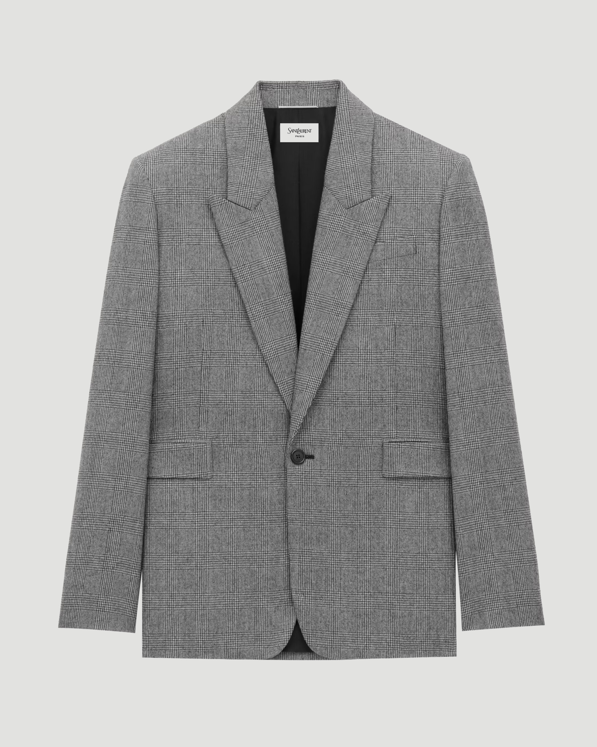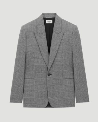 This wool jacket by Saint Laurent features a single-breasted, one-button design. Finished with a peaked lapel, oversized fit, front jetted pockets with flaps, chest welt pocket, inner pockets, padded shoulders, and a single back vent.