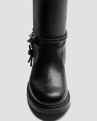 This knee-high boot by Bottega Veneta is made from calfskin leather and features coaxial detailing highlighted by the house’s signature metallic triangle element.