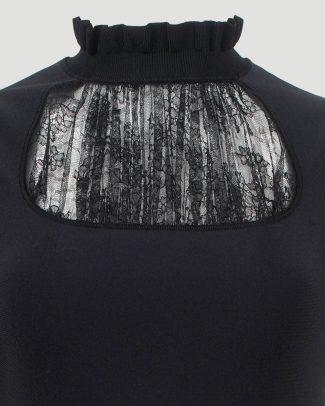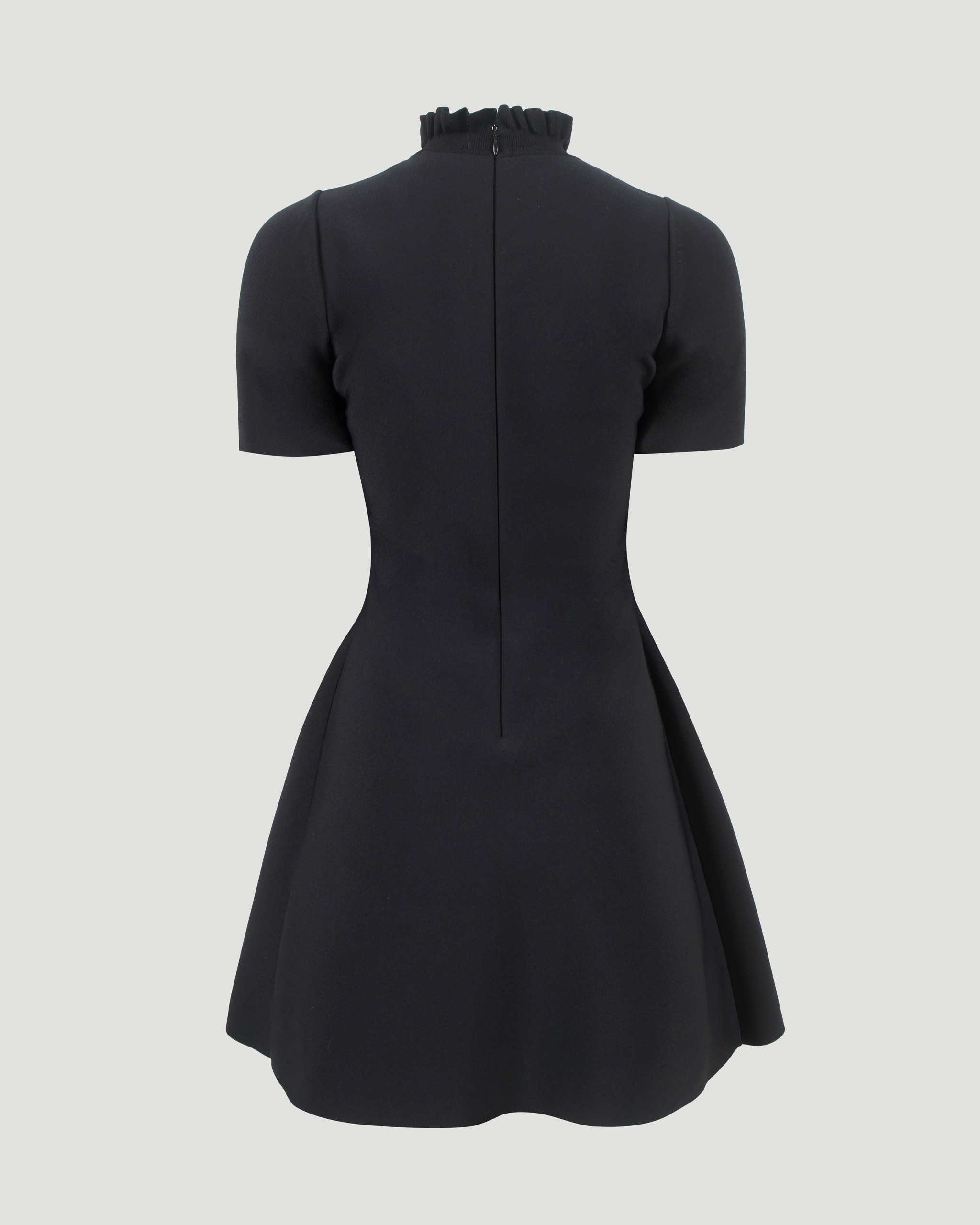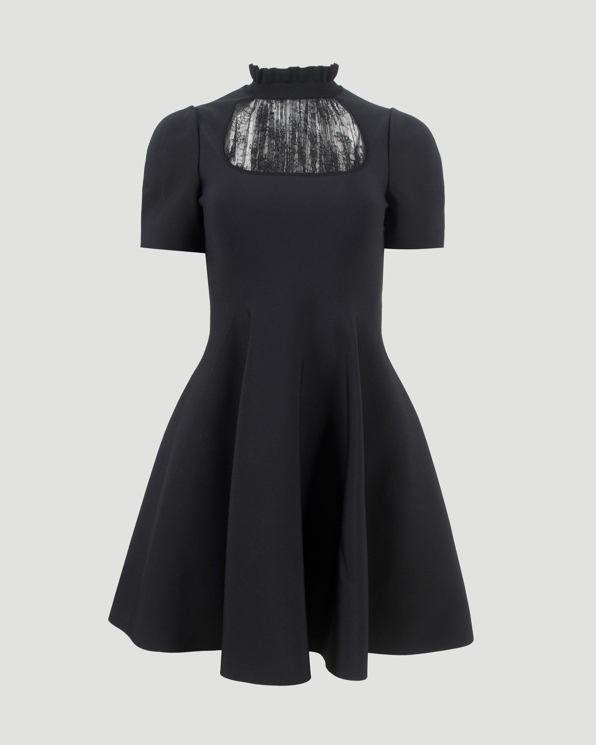 Mini dress by Alexander McQueen in stretch viscose with a sheer lace chest panel. Designed with a crew neck and frill detailing, short sleeves, and a flared skirt. Finished with a back zip fastening.