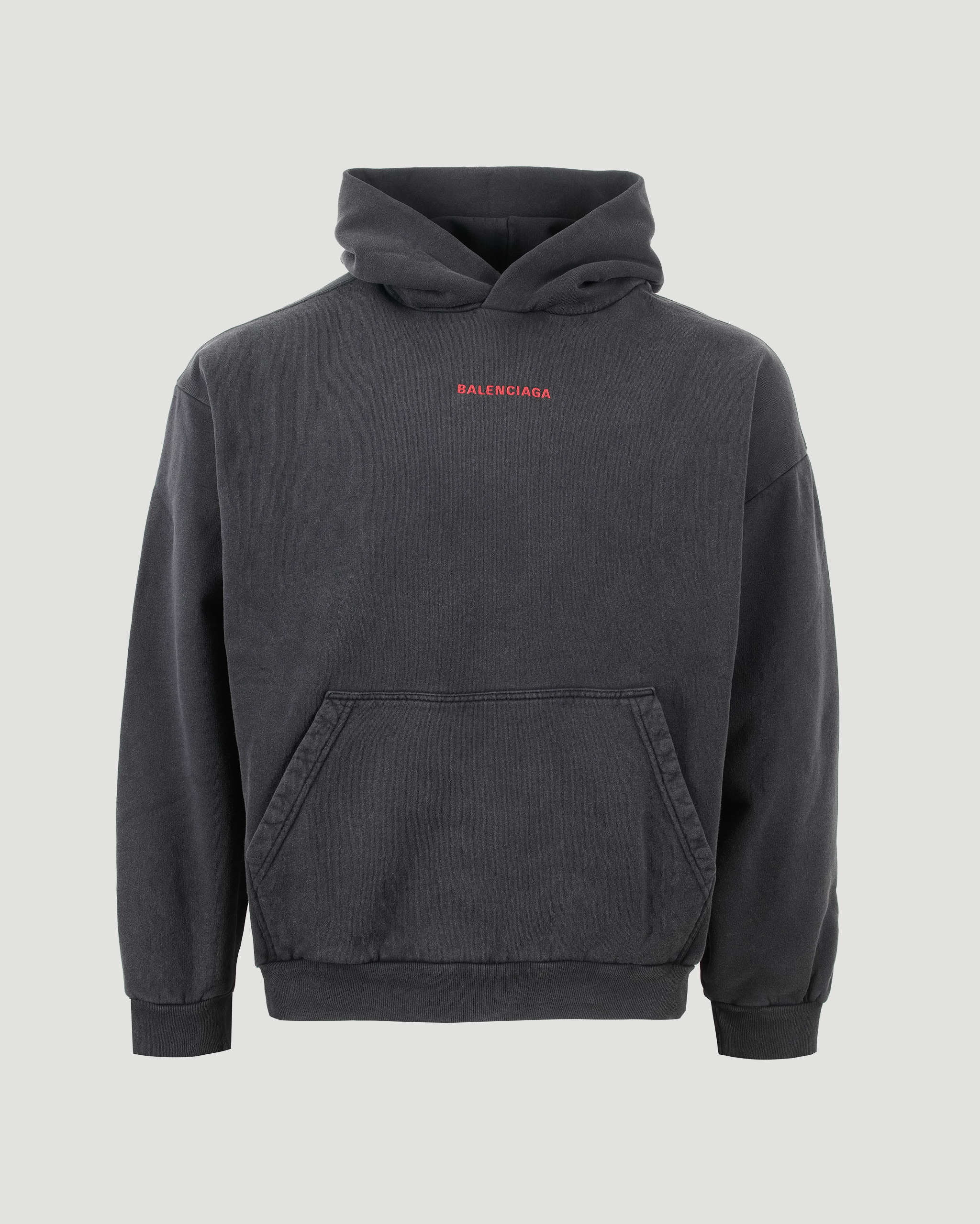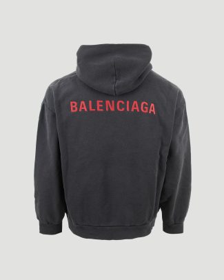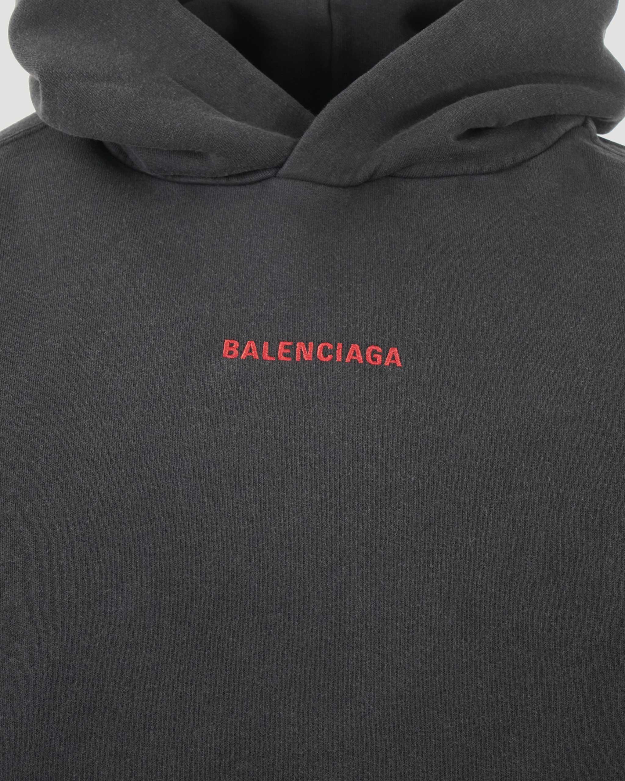 Medium-fit hoodie by Balenciaga in dry fleece. Designed with a hood without drawstring, dropped shoulders, and a front kangaroo pocket. Gathered at the cuffs and waistline, and finished with Balenciaga Back artwork embroidered on the front and back.
