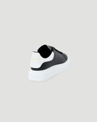 These black Alexander McQueen lace-up sneakers feature a white calf leather heel detail, large flat laces, and an oversized white rubber sole. They are finished with the Alexander McQueen logo on the tongue and heel.