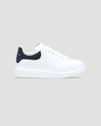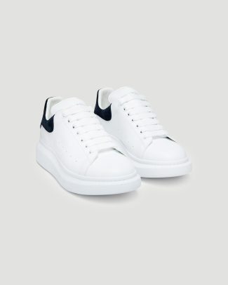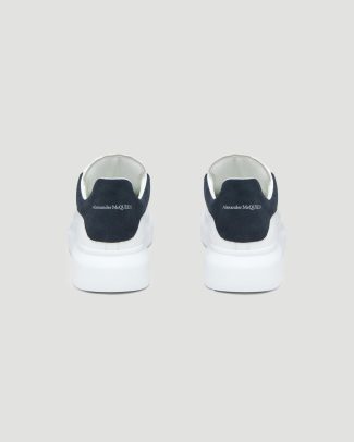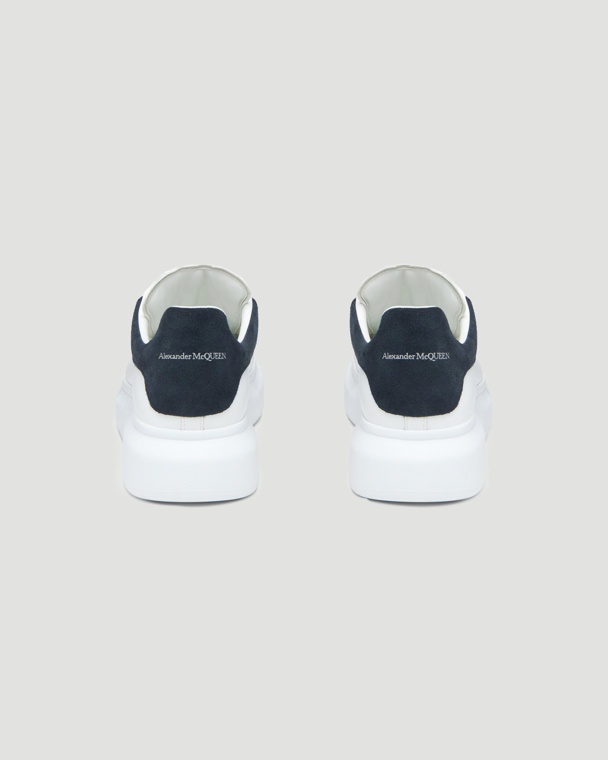 These oversized sneakers by Alexander McQueen are made from white calf leather, accented with a blue grey suede heel counter featuring the McQueen signature. Finished with a chunky rubber sole for a distinctive finish.