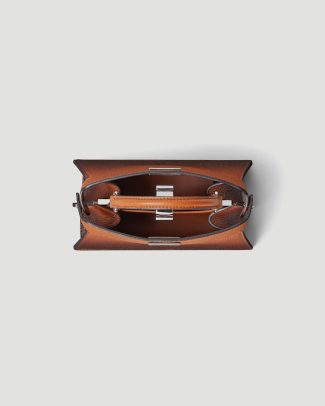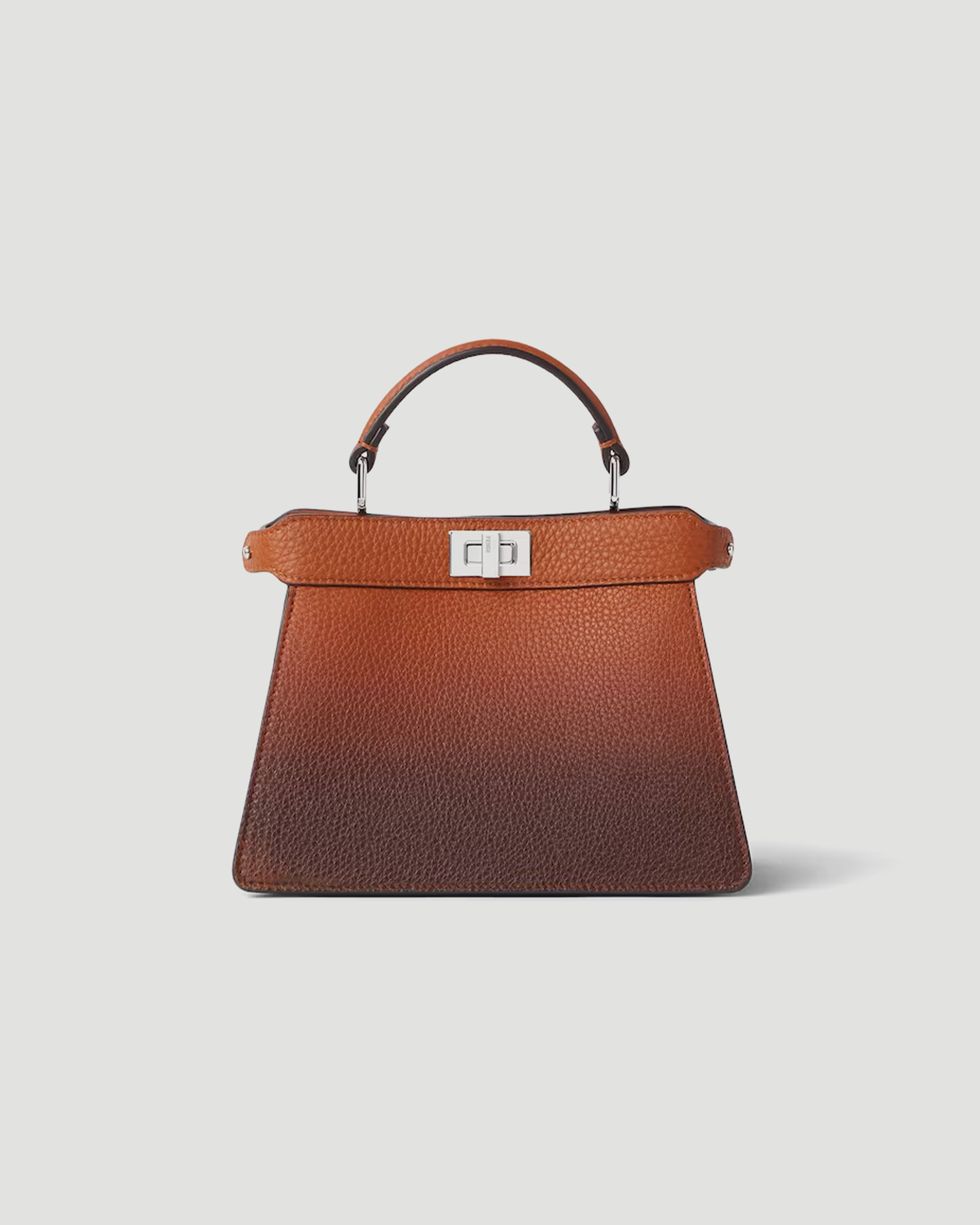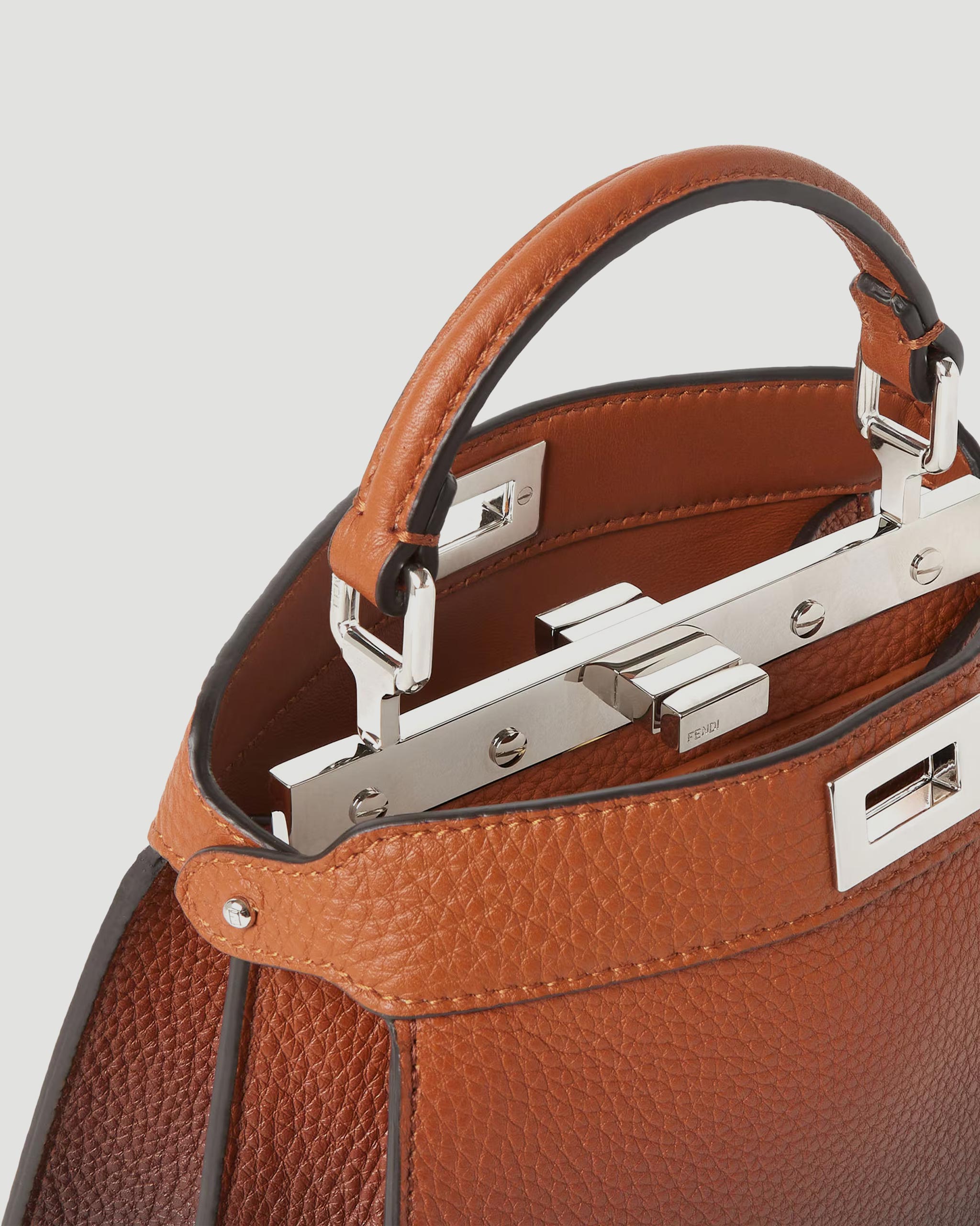 The iconic small Peekaboo bag from Fendi is crafted from Cuoio Romano leather in gradient dark brown tones and finished with the signature twist lock on both sides. Its tone-on-tone leather interior includes two compartments divided by a stiff partition and an inner pocket. Palladium-finish bar, closure and metalware. It can be carried by hand or worn on the shoulder or crossbody with the top handle and adjustable, detachable strap.