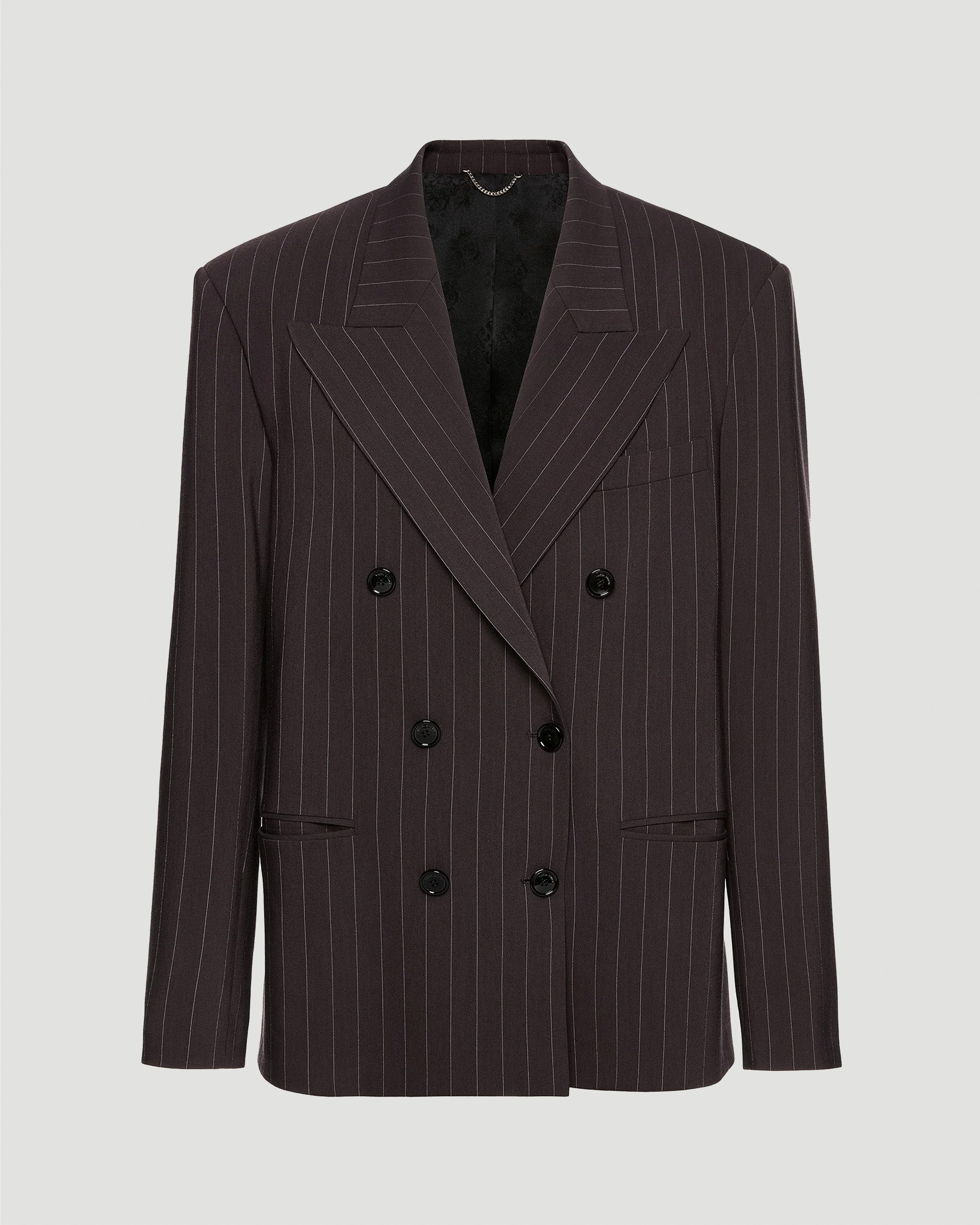 This double-breasted blazer by Magda Butrym features an oversized silhouette with fine vertical pinstripes. Strong shoulders and elongated lapels emphasize the masculine-inspired cut, while subtle waist shaping adds balance to the sharp tailoring.