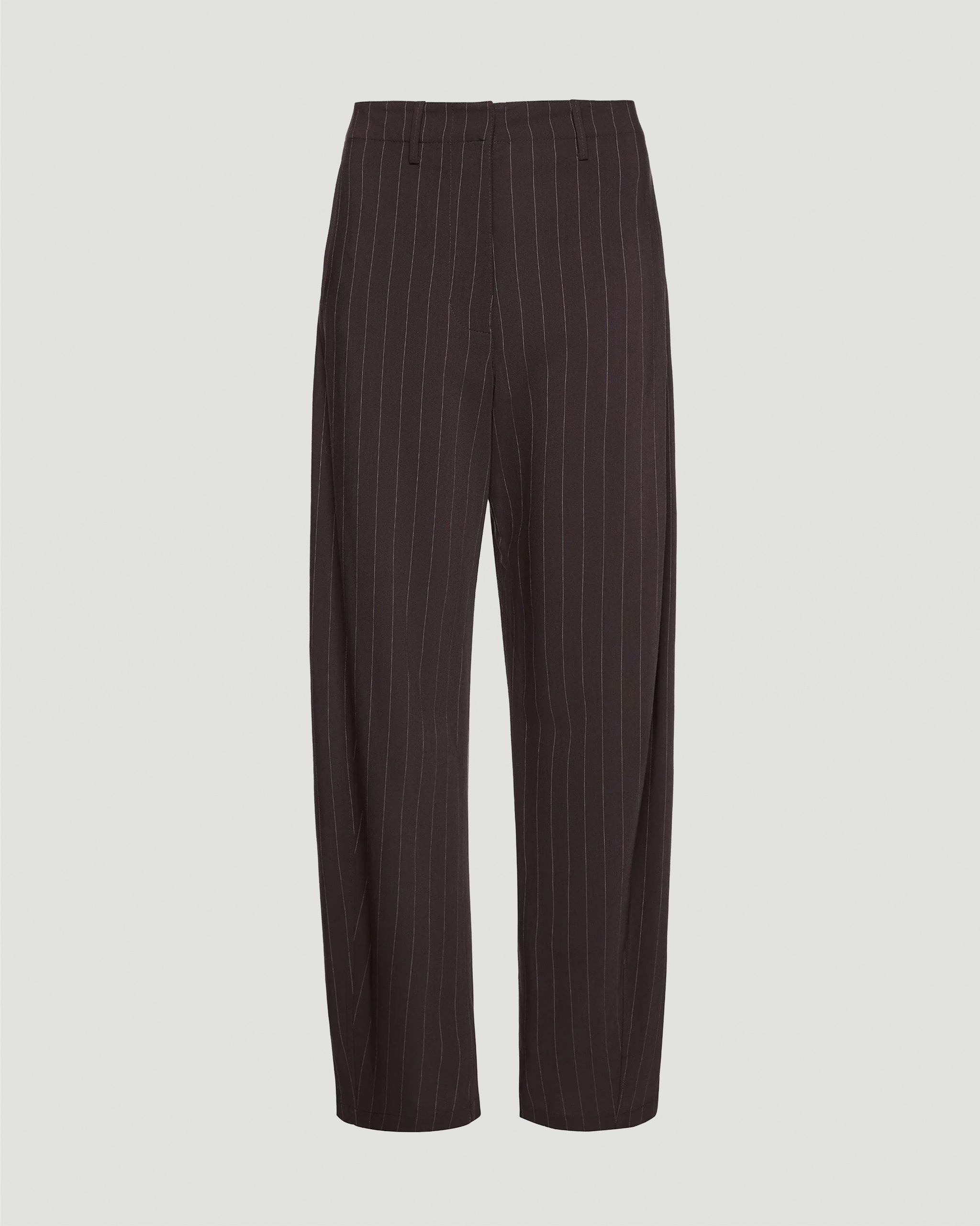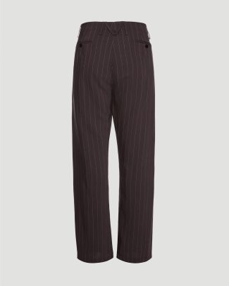 These tailored trousers by Magda Butrym feature a wide-leg silhouette with side seams shifted to the front for a refined shape. They include front welt pockets, single-button back pockets, a dropped waistline, and rear belt loops shaped into an “M” motif.