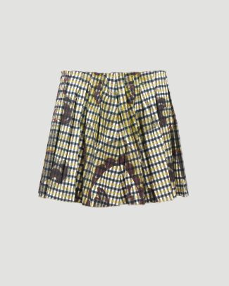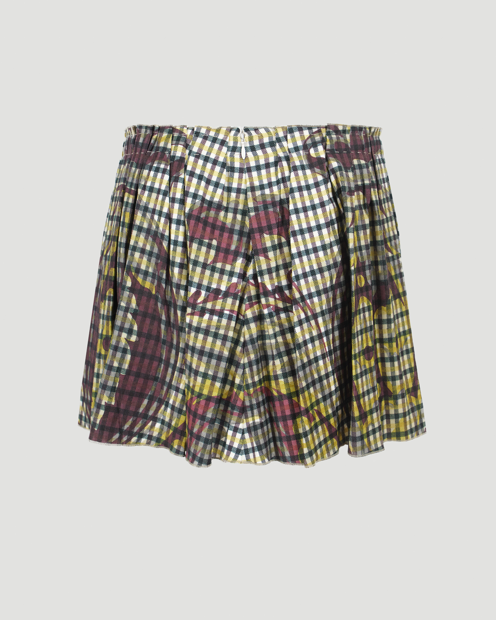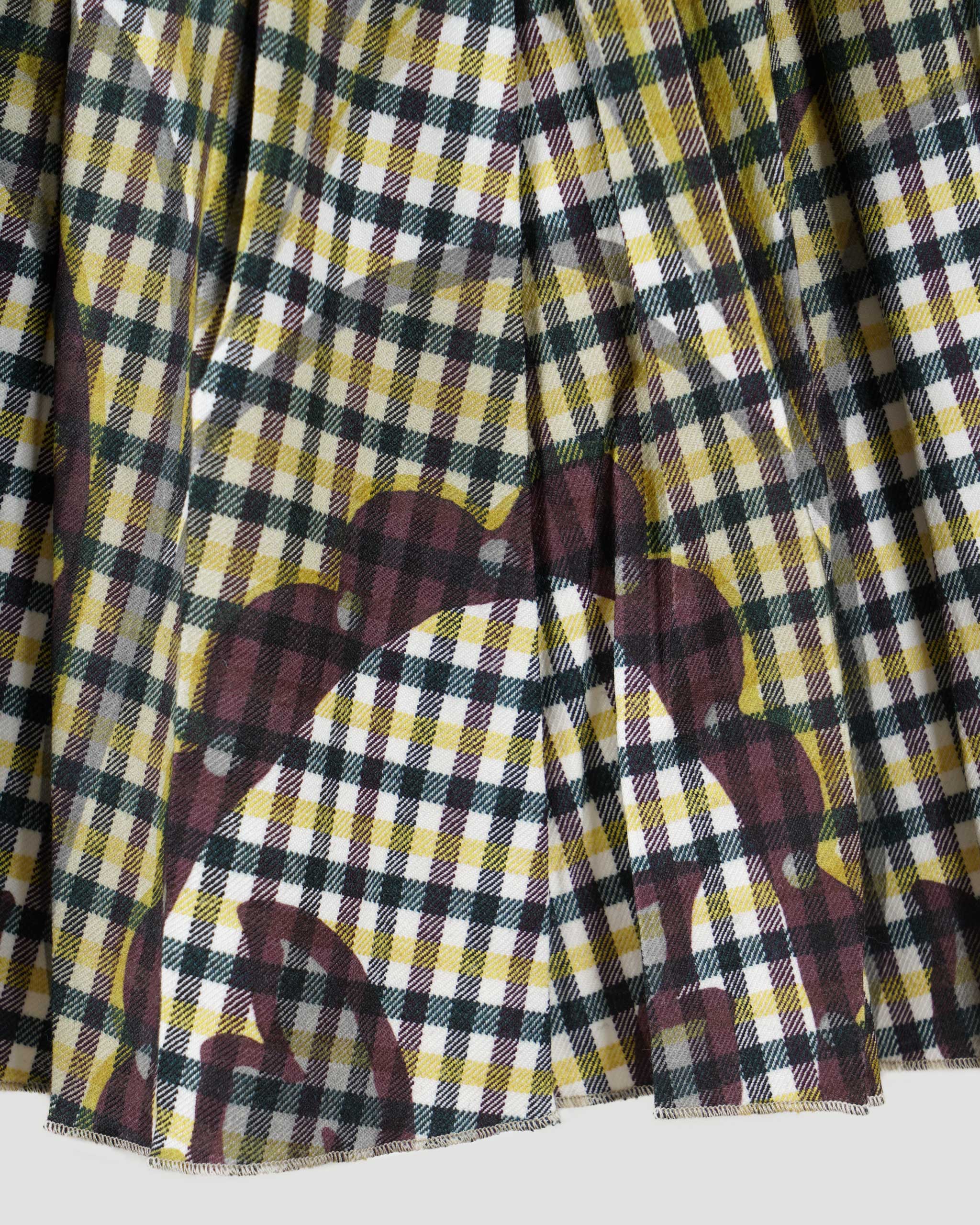 Pleated mini skirt by ETRO, crafted from a wool-blend gingham fabric adorned with a placed floral print. Features a regular fit and a concealed side zip closure.