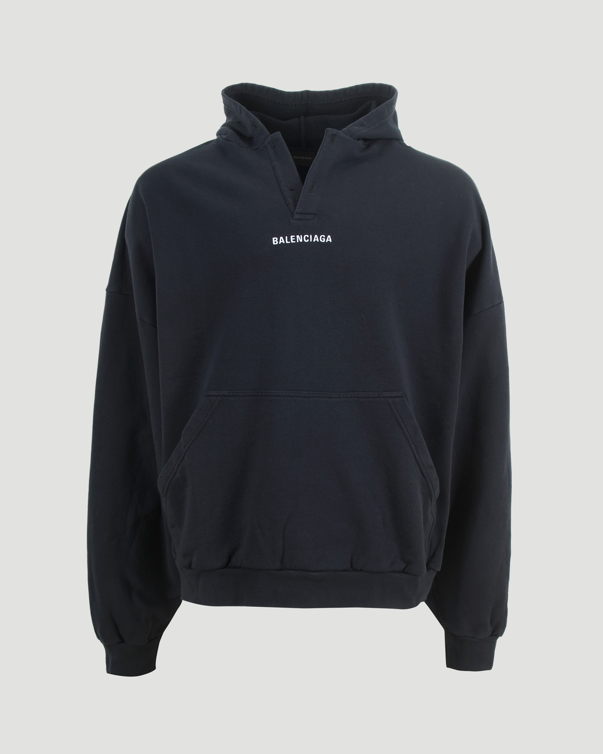 This polo hoodie by Balenciaga is made in dry fleece in faded black. It has a polo button placket at the collar, a hood without drawstrings, dropped shoulders, a kangaroo pocket, gathered cuffs and waistline, and embroidered Balenciaga Back artwork at the front and back.