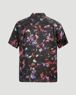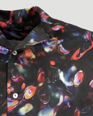 This short-sleeve shirt is crafted from 100% satin-finish viscose, offering a fluid drape with a subtle sheen. Features an exclusive all-over print designed from generative art. Each pattern is inspired by the living world cellular forms, waves, and organic flows turning every piece into a fragment of infinite art. Finished with natural shell buttons, the shirt combines comfort, elegance, and artistry.