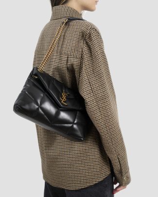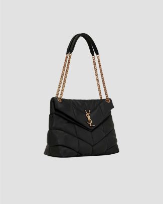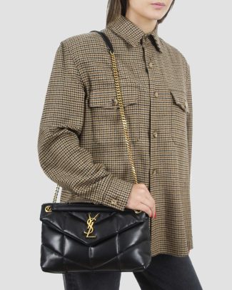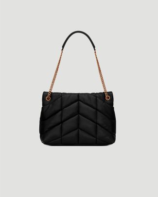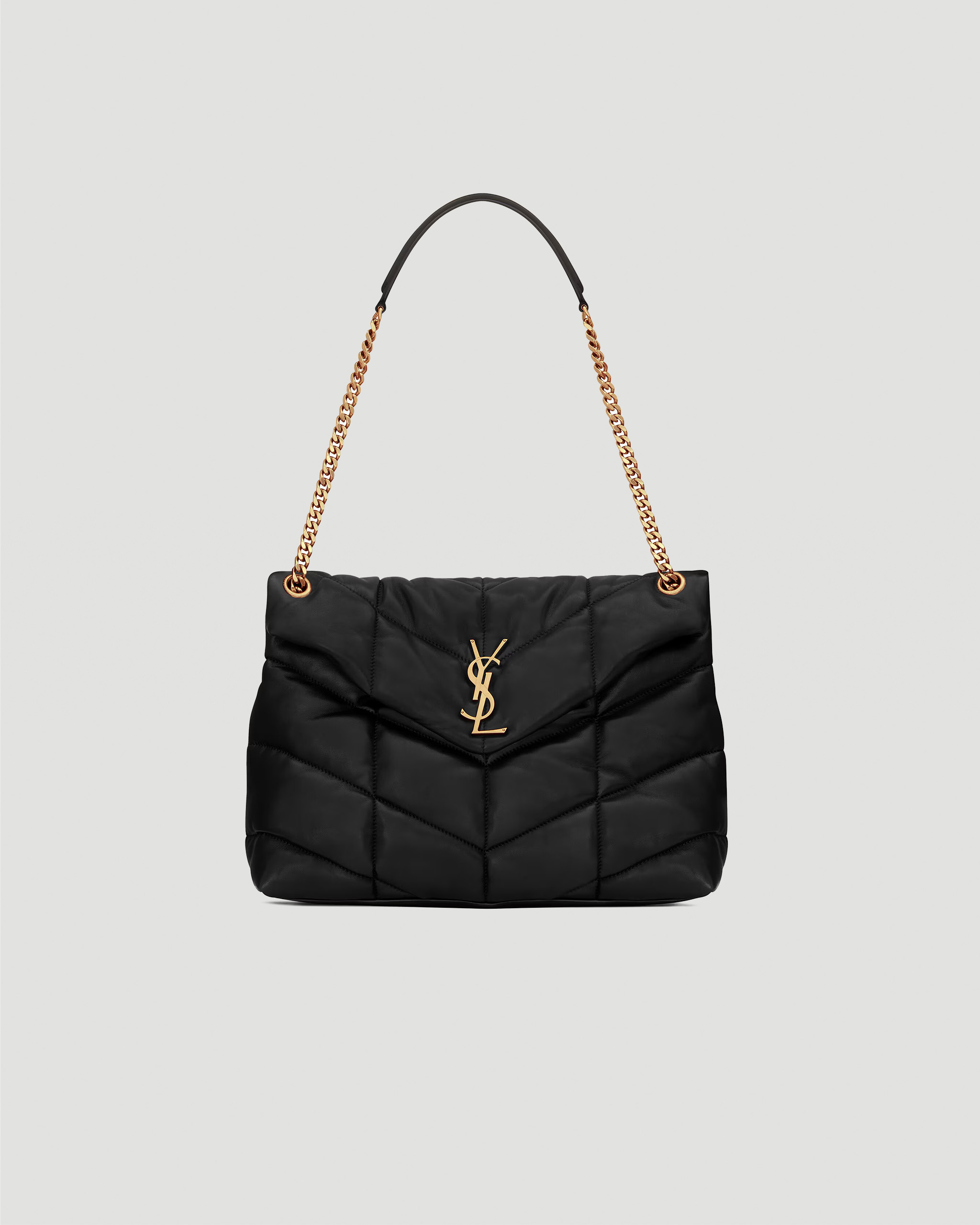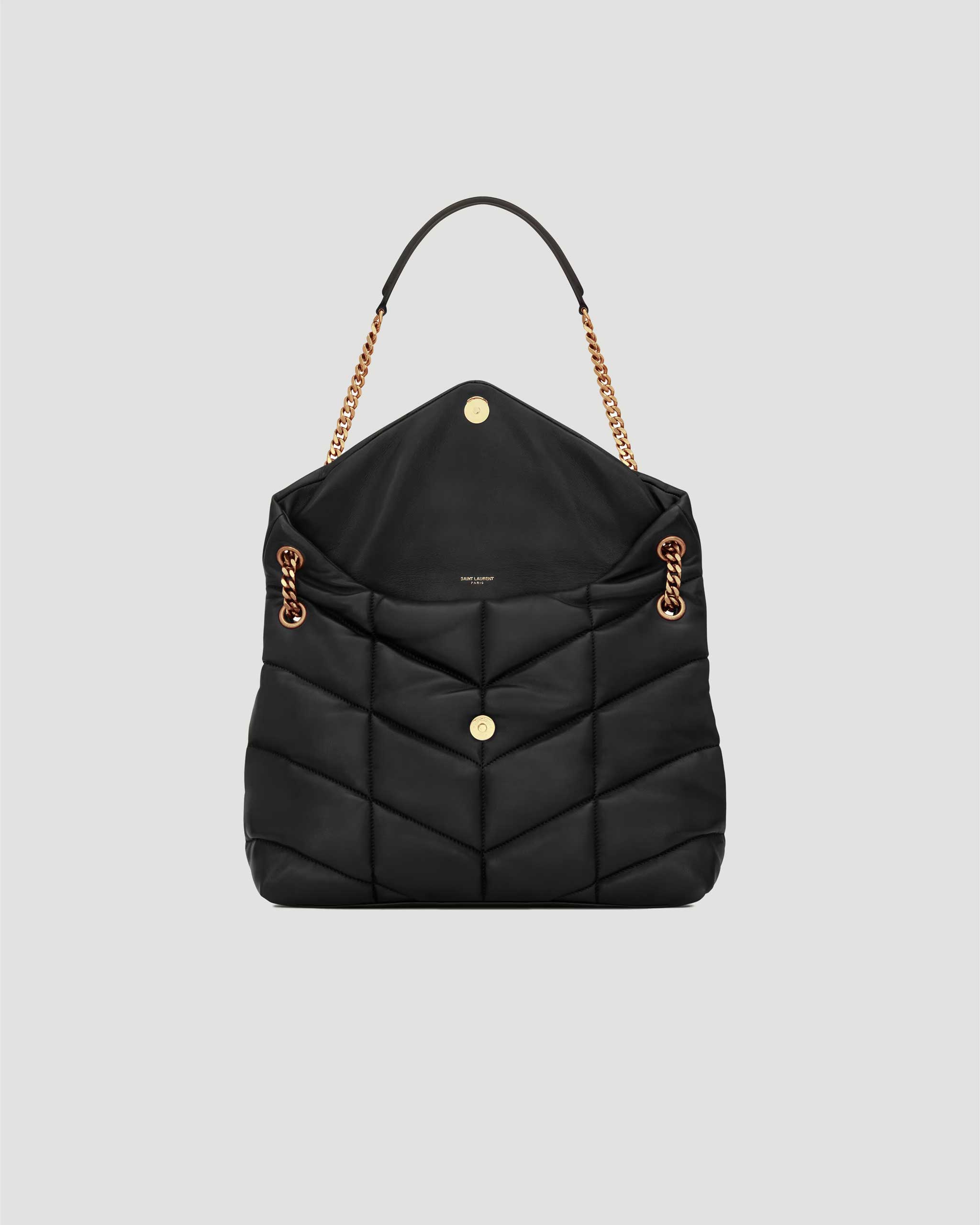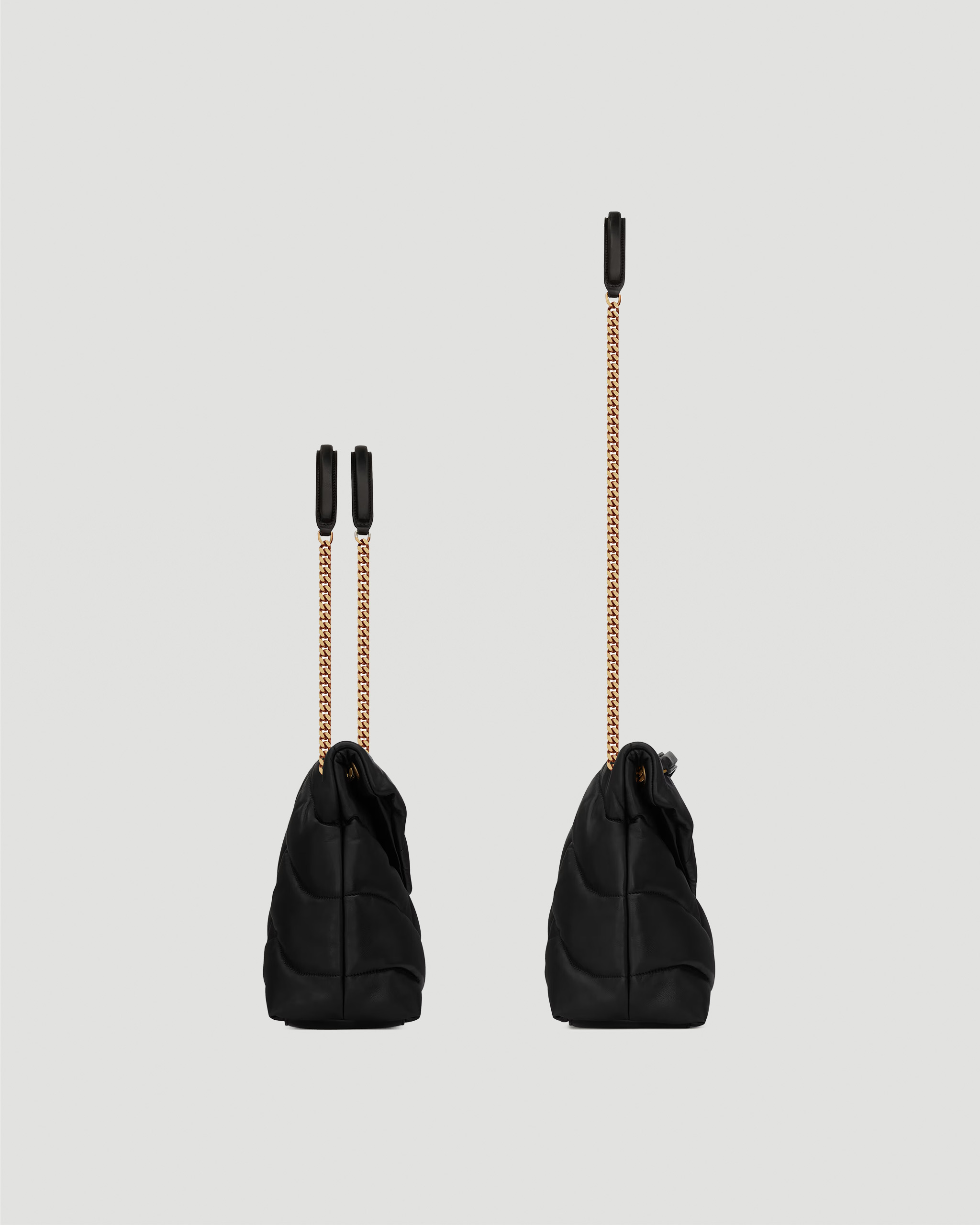 The iconic Loulou Puffer by Saint Laurent is crafted from soft nappa lambskin with signature chevron quilting. It features a sliding chain strap for shoulder or crossbody wear. Finished with light bronze brass hardware, a magnetic snap tab, grosgrain lining, and one interior zipped pocket.