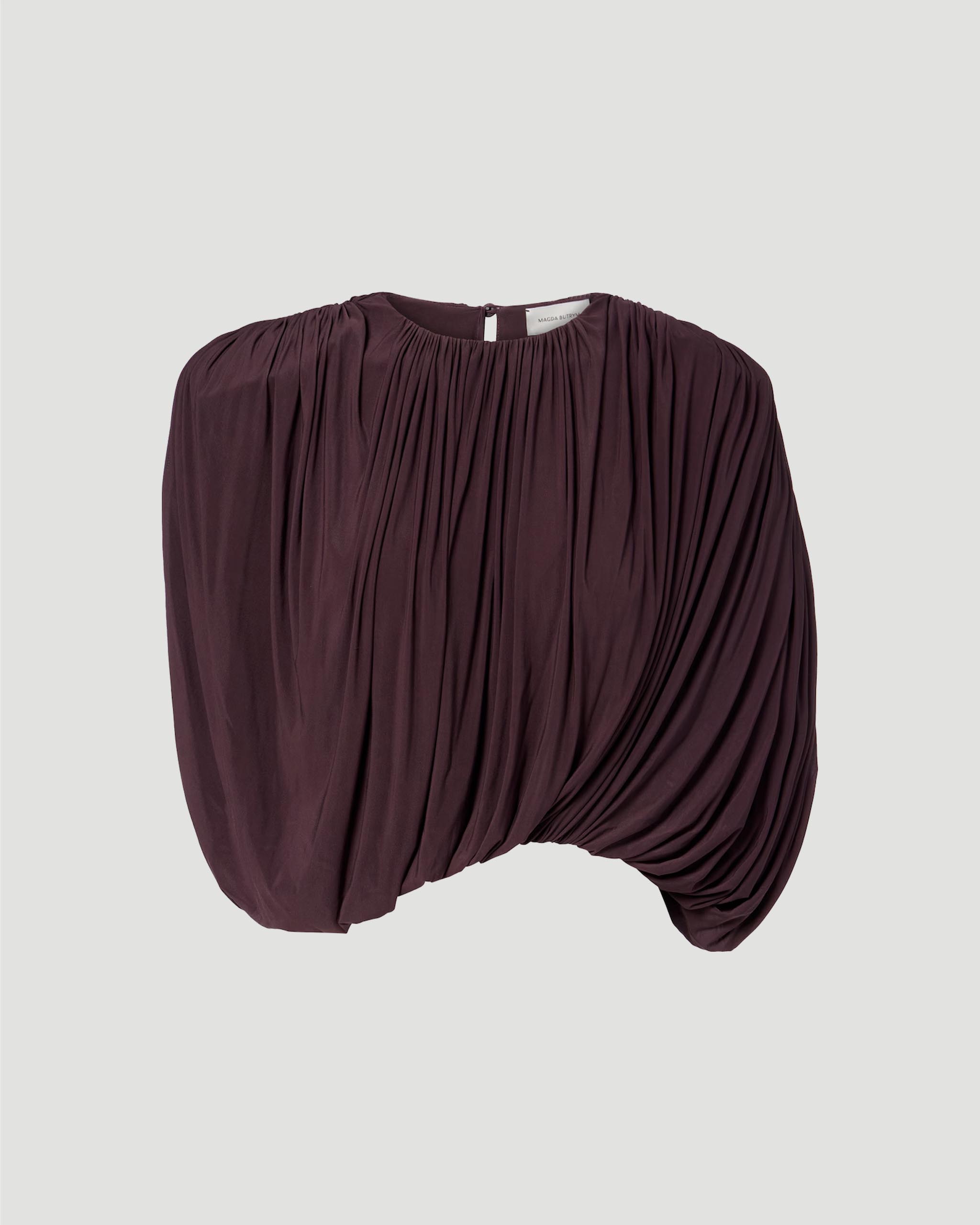 This Magda Butrym sleeveless top features a round neckline and a voluminous silhouette created by heavy ruching at the shoulders and hem. It is structured with shoulder padding and finished with a gathered bubble hemline cinched by an elastic band.