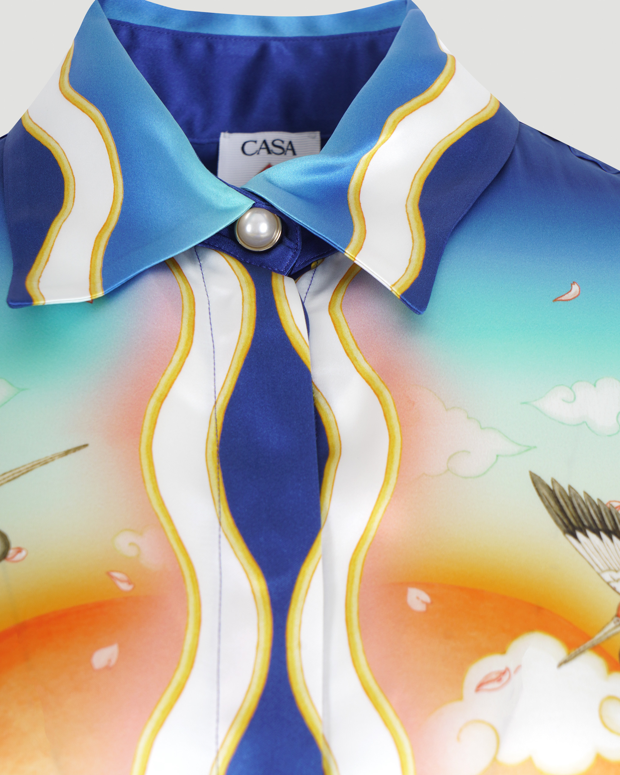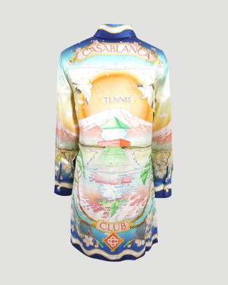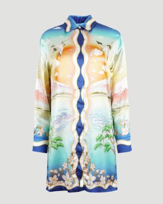 Casablanca shirt dress crafted from printed silk twill featuring traditional Japanese art motifs. Detailed with signature gold-rim pearl buttons at the collar and cuffs, button closure, and Memphis wave-inspired stripe accents along the hem, cuffs, placket, and collar.