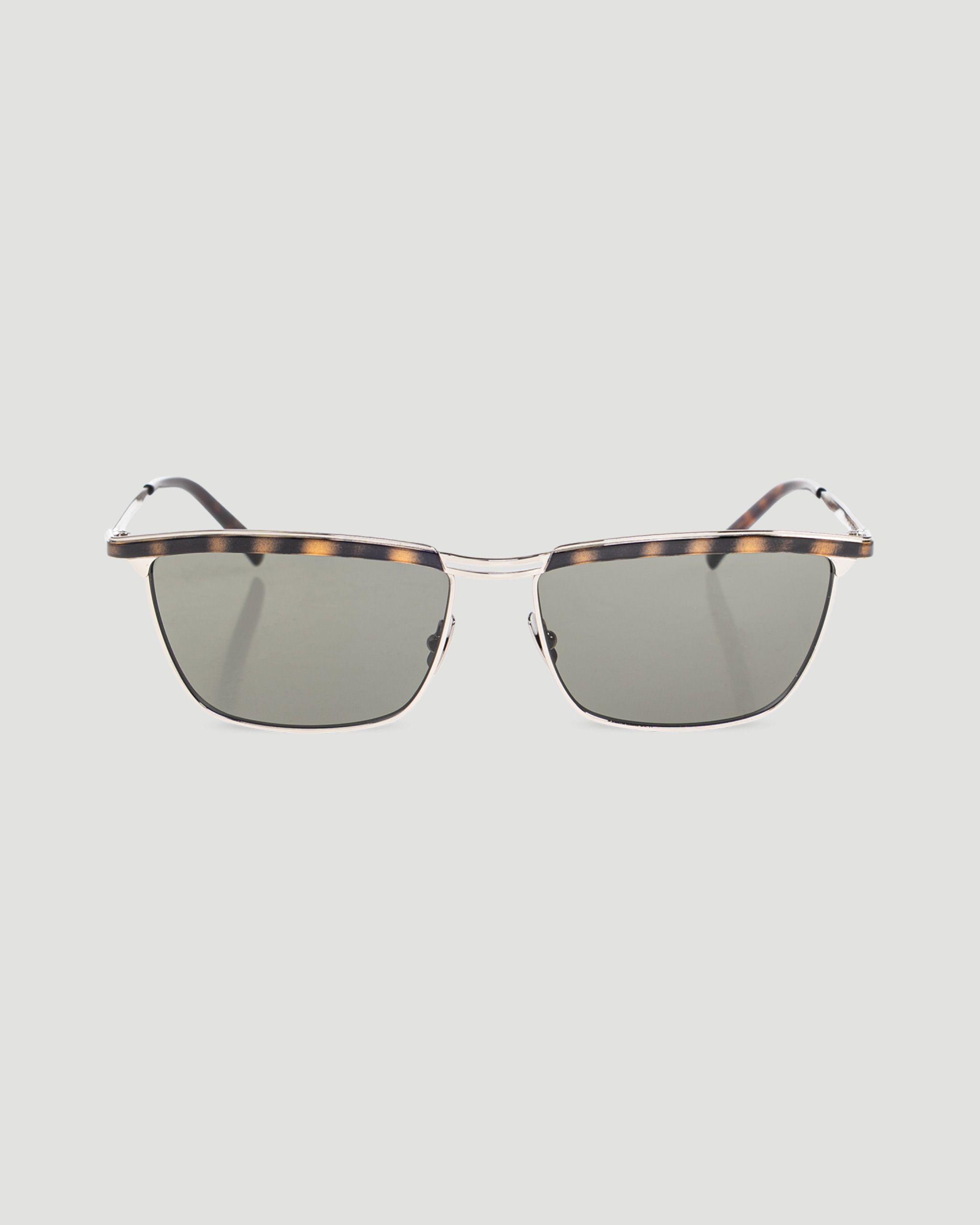 These Saint Laurent trapezoid sunglasses feature metal frames with nylon lenses, a double bridge, and a top bar with tortoiseshell inlay. Finished with engraved temples, metal nose pads, and 100% UVA/UVB protection.