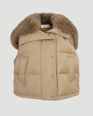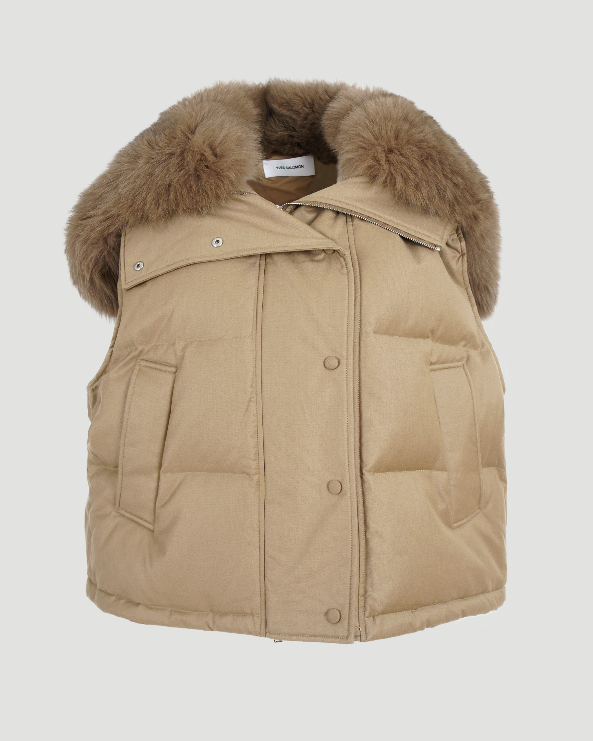 Boxy wool-silk flannel vest by YVES SALOMON, designed for warmth and elegance. Features a removable airy fox fur collar, quilted construction, welt pockets, and a zip under placket with flannel-covered press-stud fastening. Fully lined.