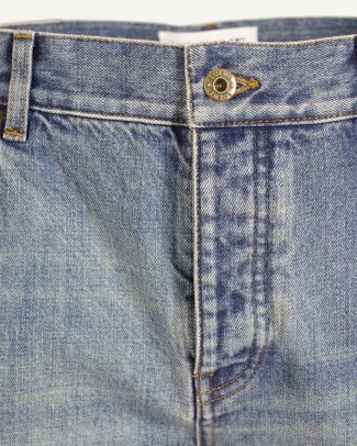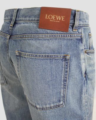 Loewe jeans in medium-weight cotton denim, detailed with a LOEWE 1846 selvedge and a Made in Japan leather patch at the back. Cut in a slim fit with a low waist, straight leg, and regular length. Features a classic five-pocket construction and a concealed button fly.
