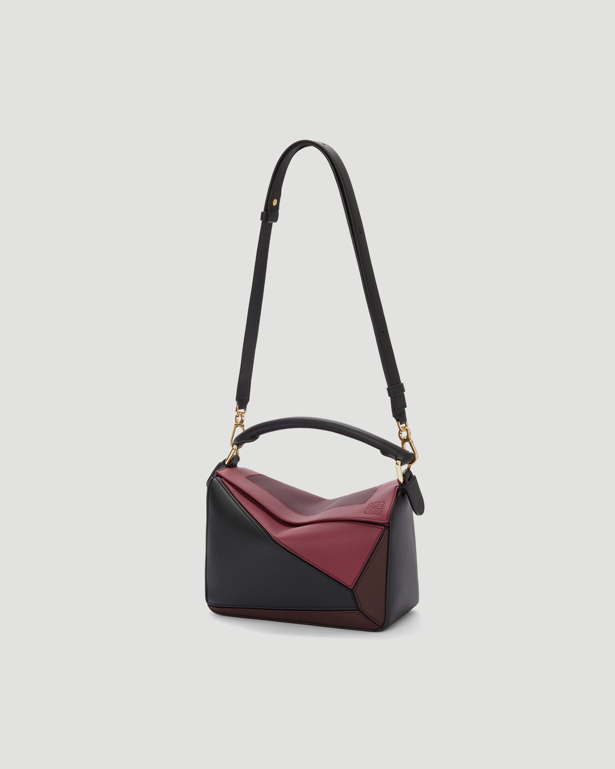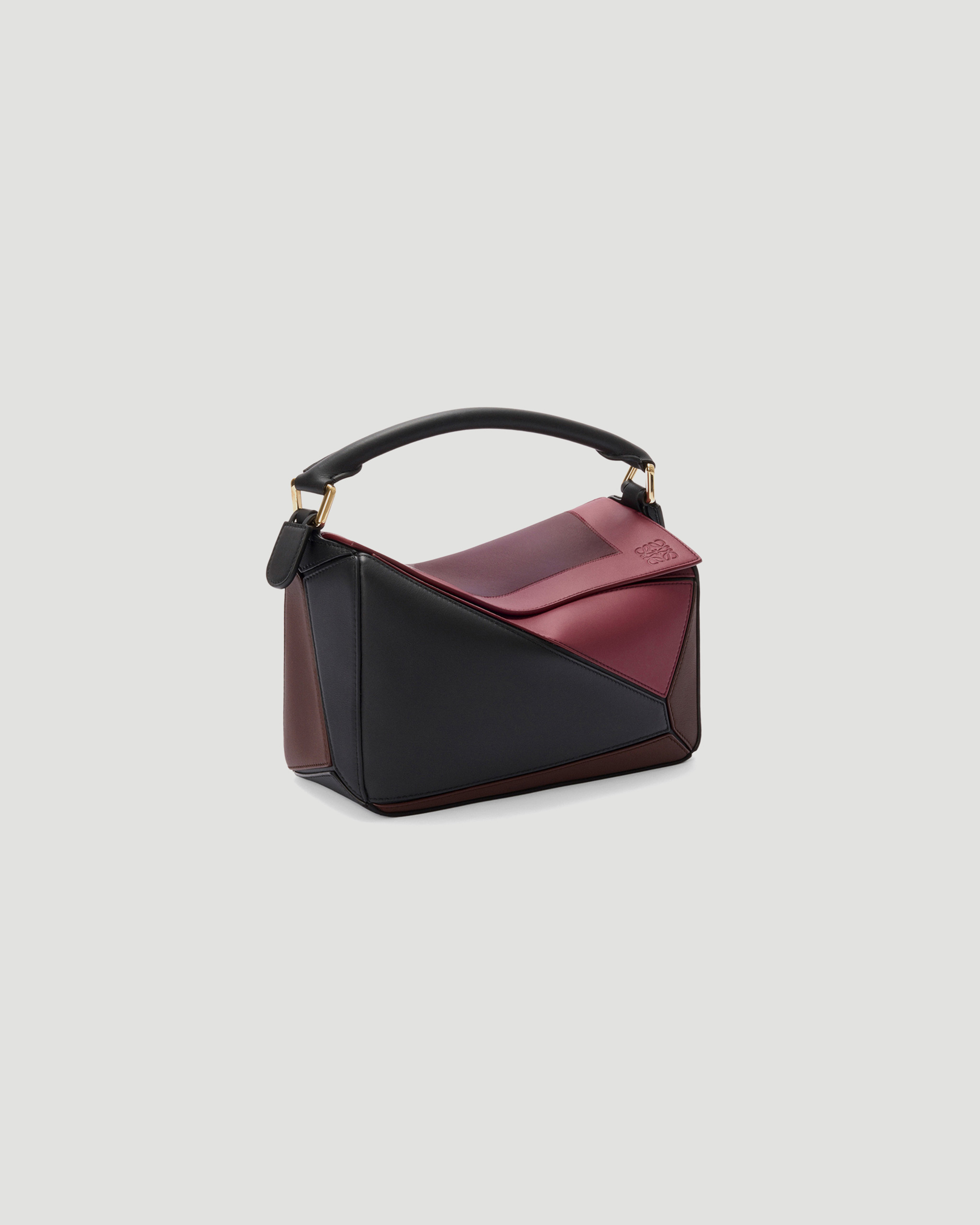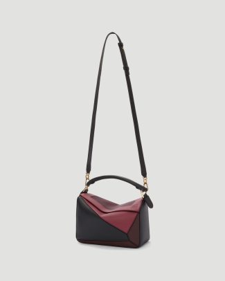Small Puzzle Bag by Loewe crafted in nappa calfskin with intarsia squares inspired by Josef Albers’s Homage to the Square series, part of the LOEWE x Albers collection. Features a detachable, adjustable strap for shoulder, crossbody, or hand carry, a zip closure with calfskin pull, an external zip pocket, and an internal slip pocket. Finished with an embossed Anagram and gold LOEWE and Josef Albers signatures.
