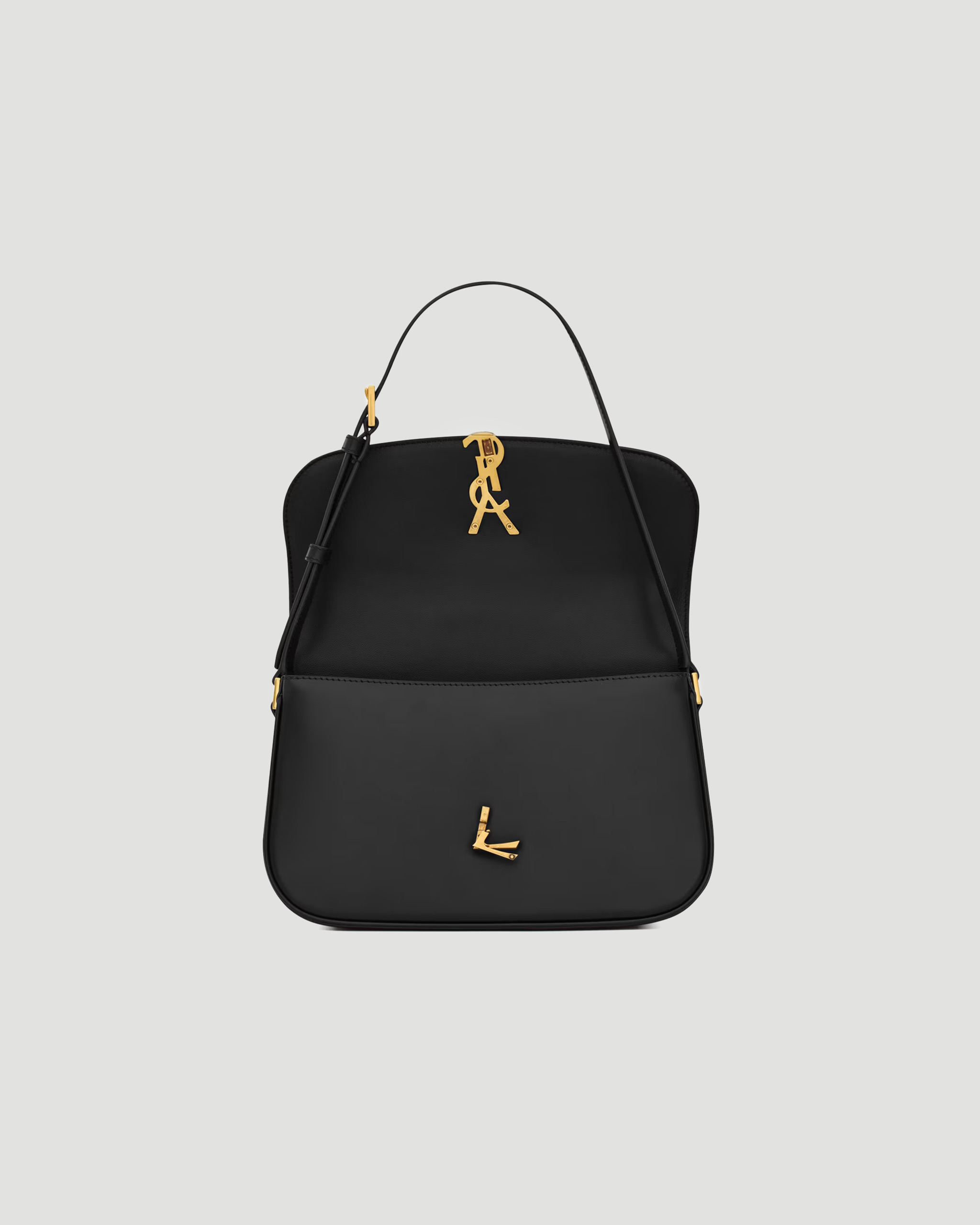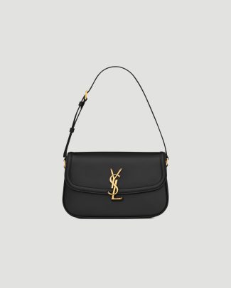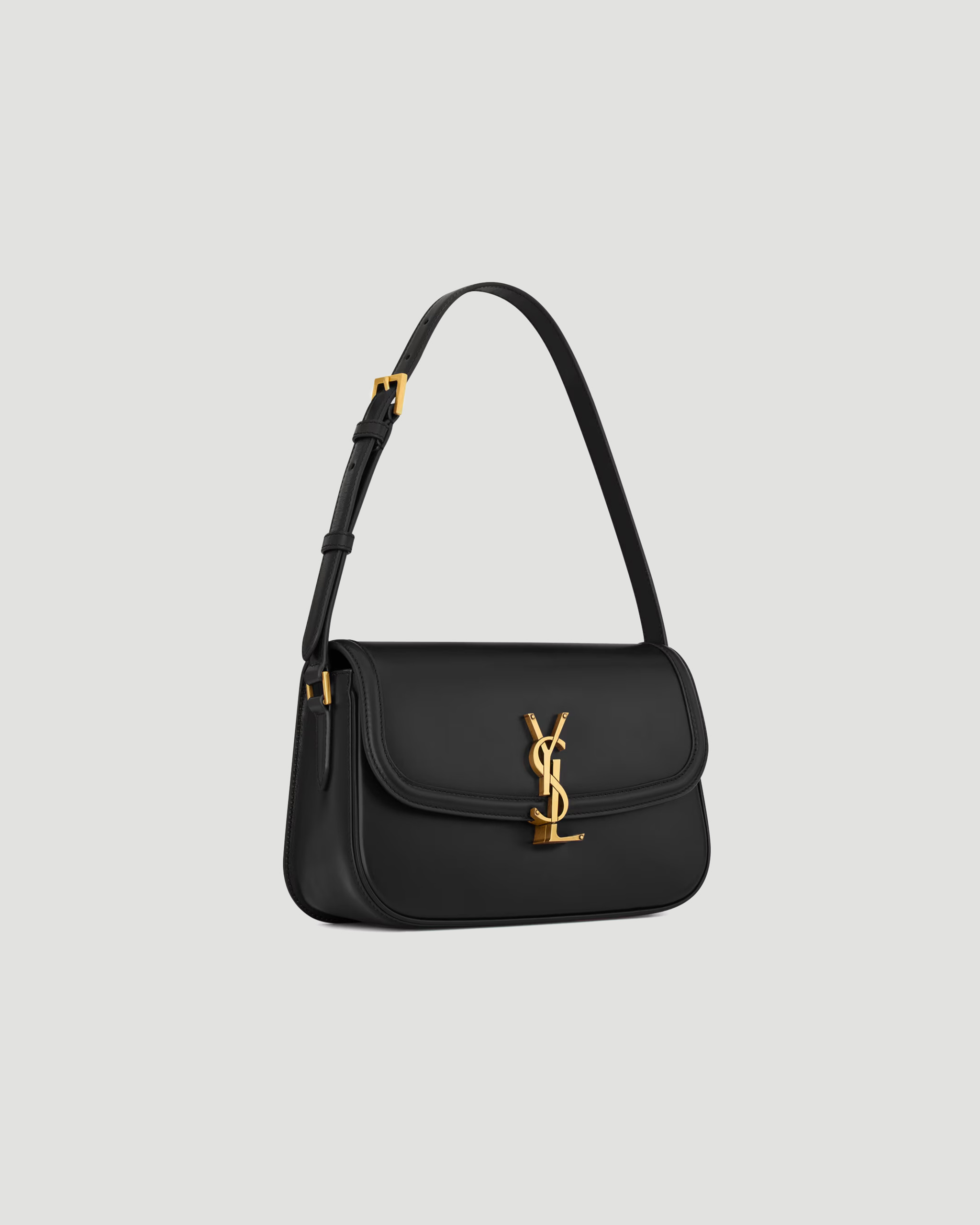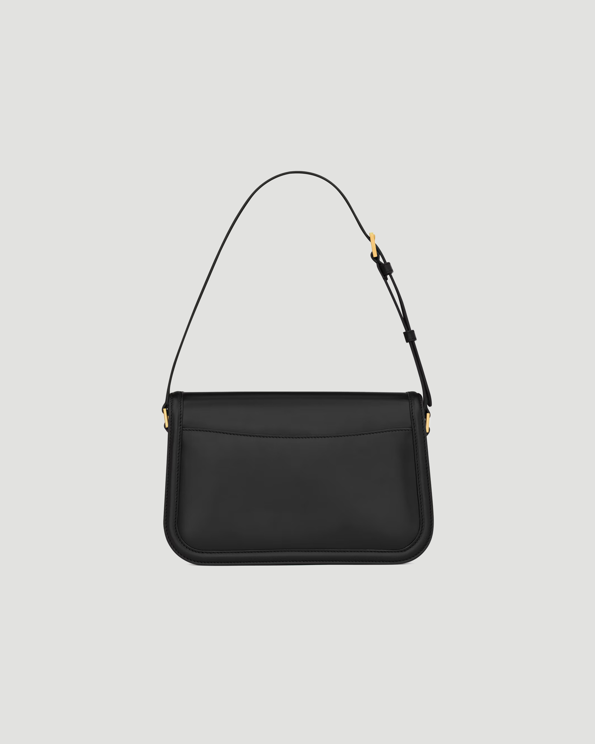 The Solferino Medium Bag in black box leather offers a refined update to a classic silhouette. Defined by its rounded lines and structured form, it features the signature bronze-tone Cassandre clasp and smooth leather lining. Lightweight and elegant, it includes an adjustable strap for comfortable shoulder wear and a sliding clasp closure for a secure finish.
