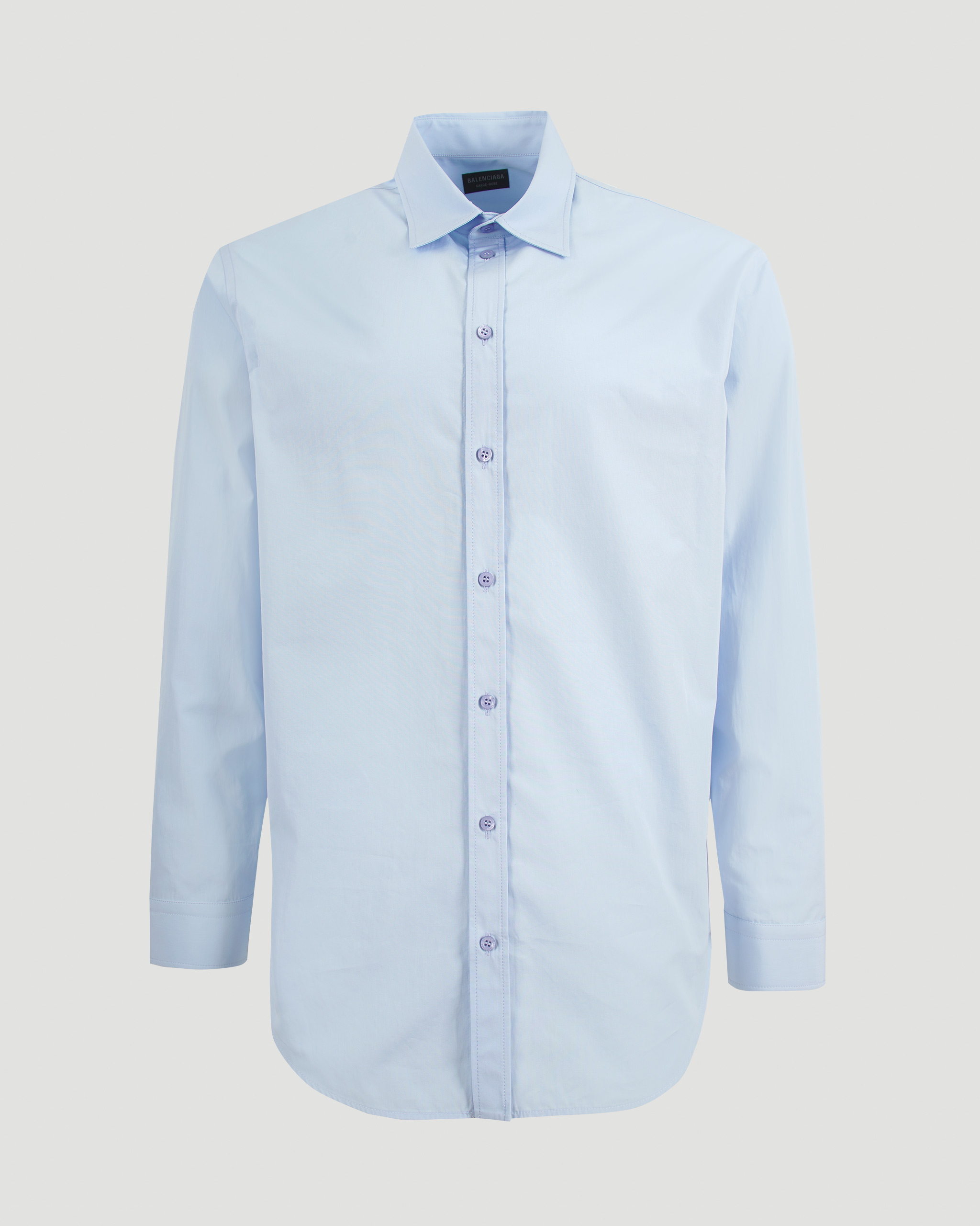 This shirt by Balenciaga is crafted from cotton poplin in baby blue. It features a shirt collar, seven-button front, long sleeves with buttoned cuffs, and a rounded hem.
