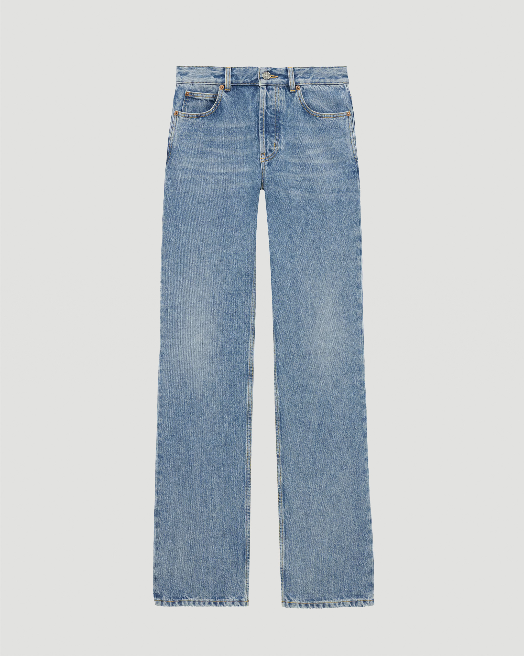 These Saint Laurent jeans are crafted from certified blue denim with a low-rise, straight-leg silhouette. They feature a button fly, five-pocket design, belt-loop waistband, and a Saint Laurent Paris embossed leather jacron.