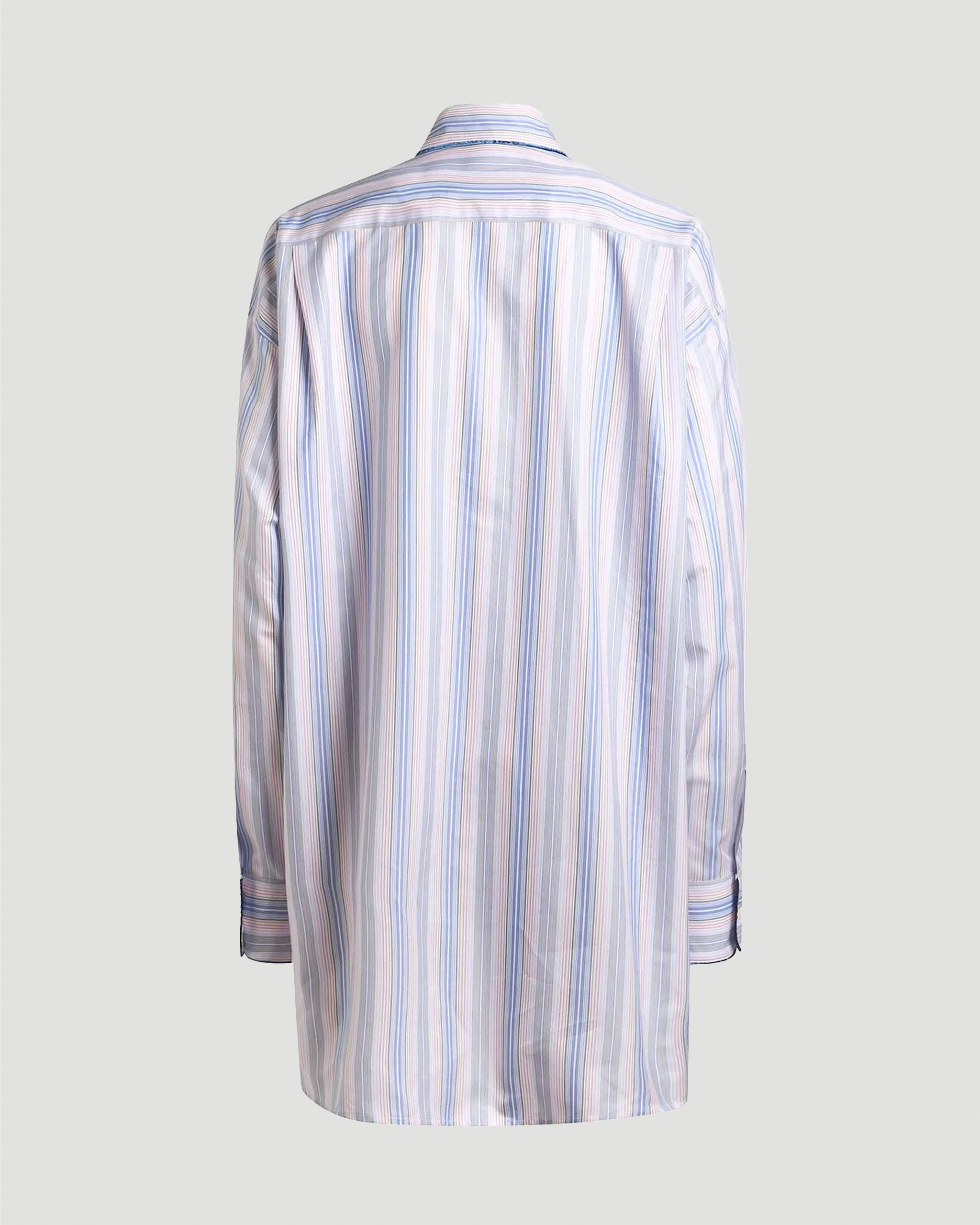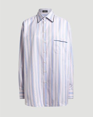 Cotton shirt by Etro, featuring an all-over striped pattern. Designed with a French collar and a chest pocket, both detailed with contrasting velvet piping for a refined touch. Completed with dropped shoulders, long sleeves, and buttoned cuffs for a relaxed yet polished silhouette.