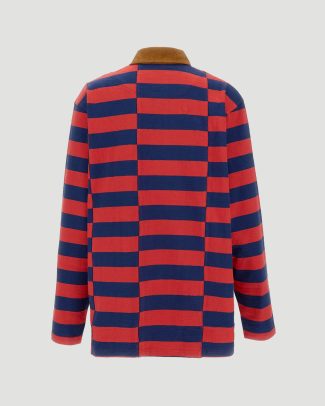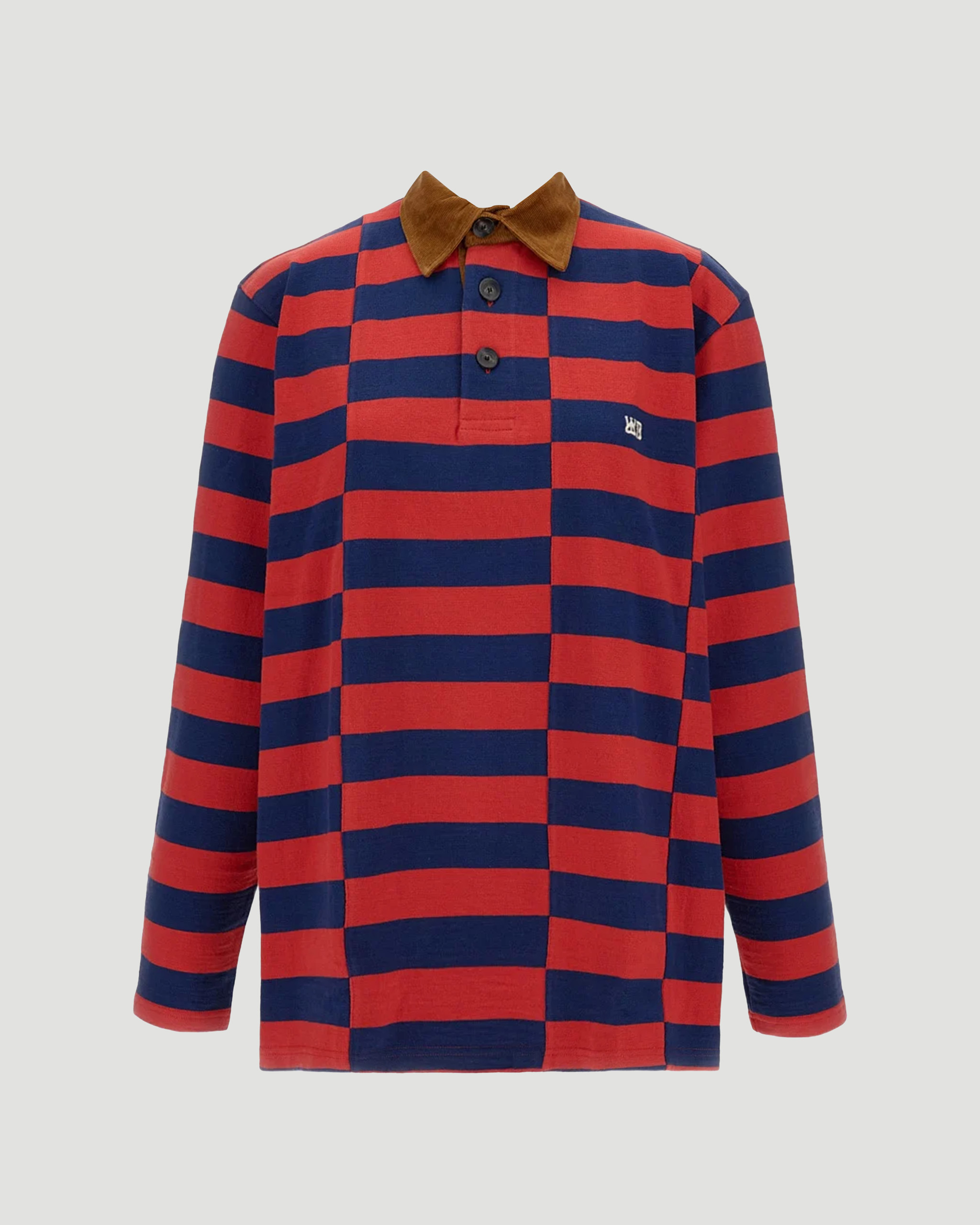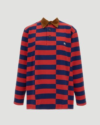 Polo top by Wales Bonner crafted from Japanese canvas with a rhythmic color-block stripe pattern. Designed with a contrasting corduroy collar, an embroidered logo at the chest, and a regular fit for a structured yet casual look.