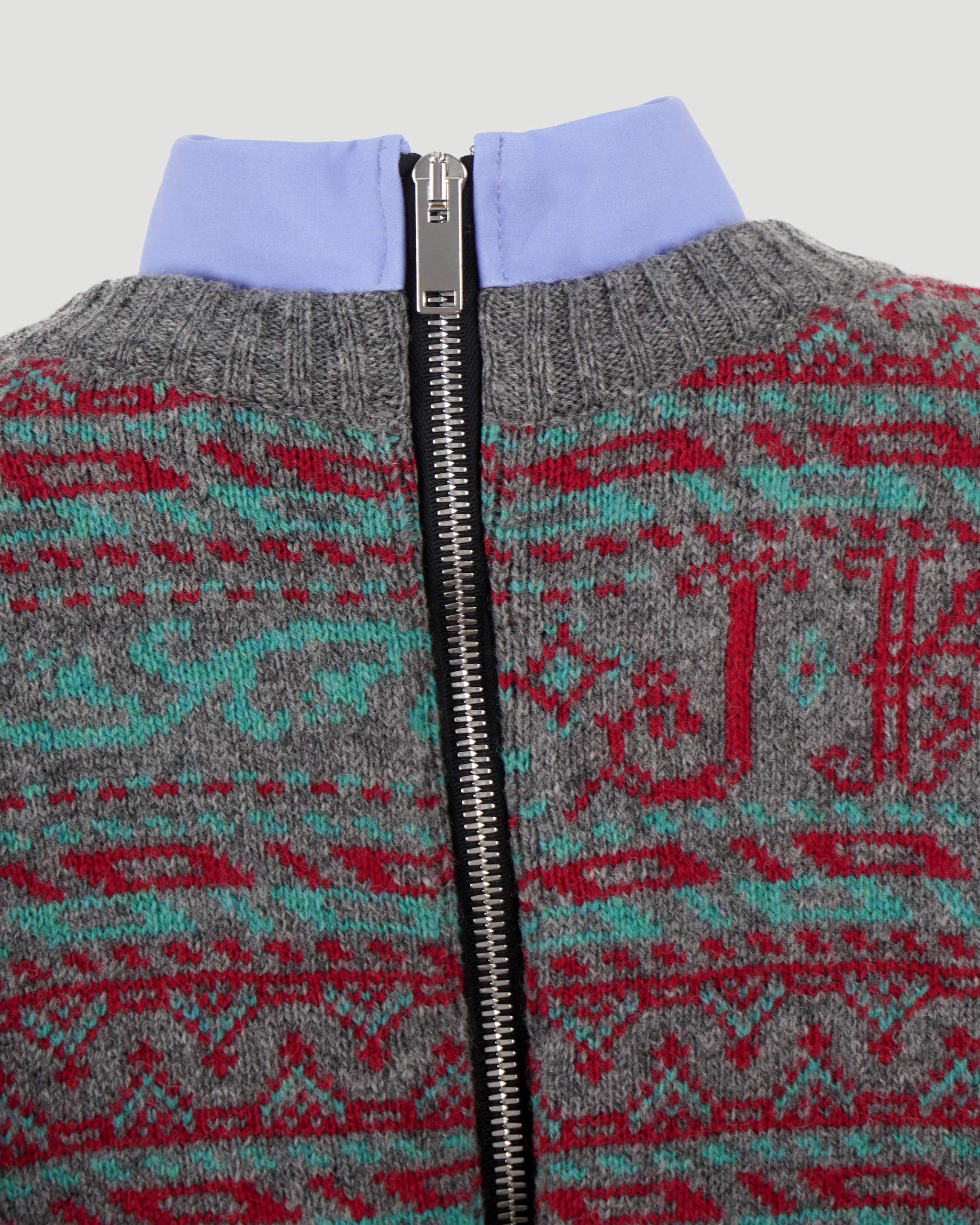 Multicolor knitted sweater by Julie Kegels, featuring an attached shirt panel on the side seams. Finished with a back zipper closure for a structured look.