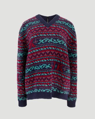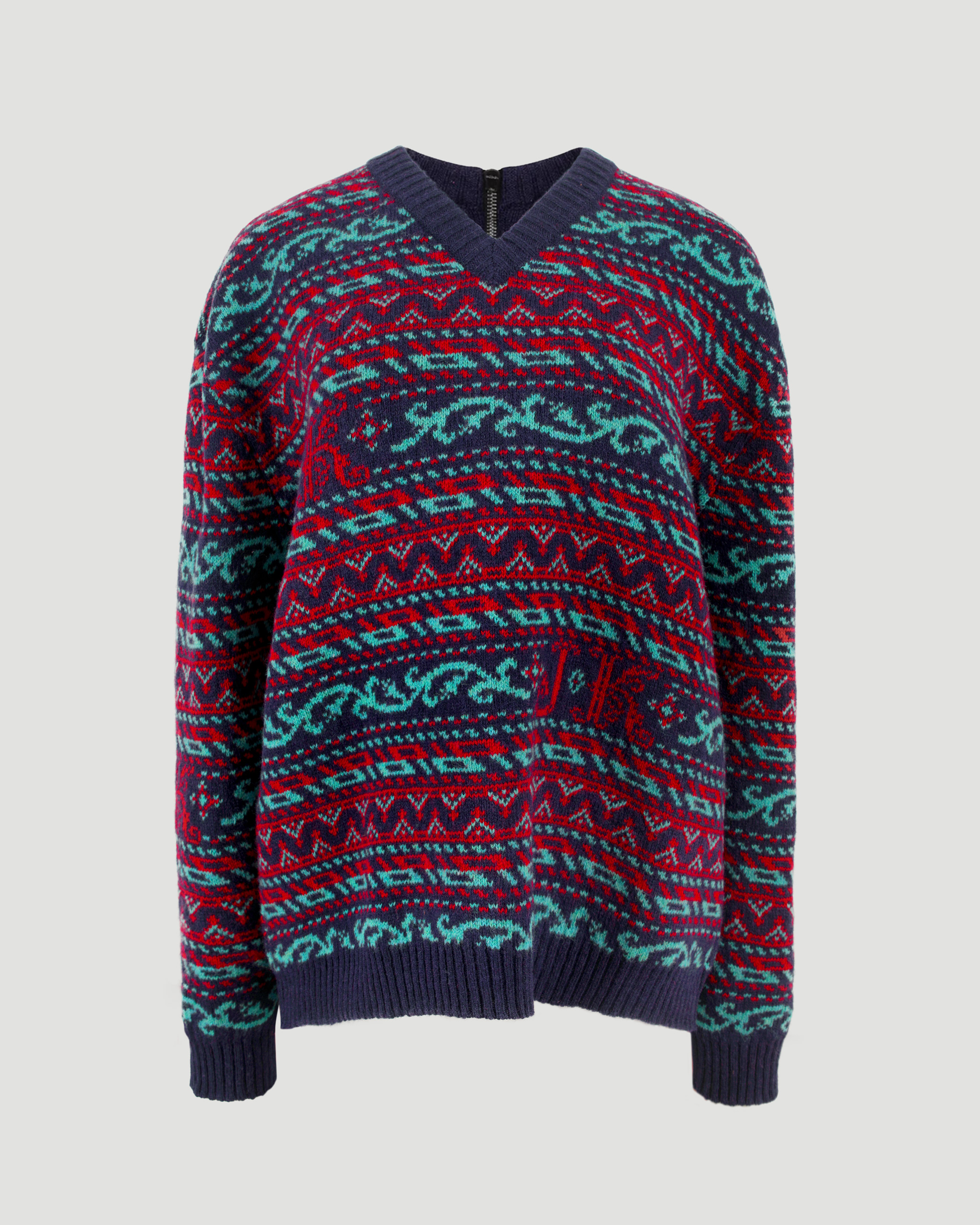 Knitted fair-isle sweater by Julie Kegels designed with a V-neckline and a back zipper closure.