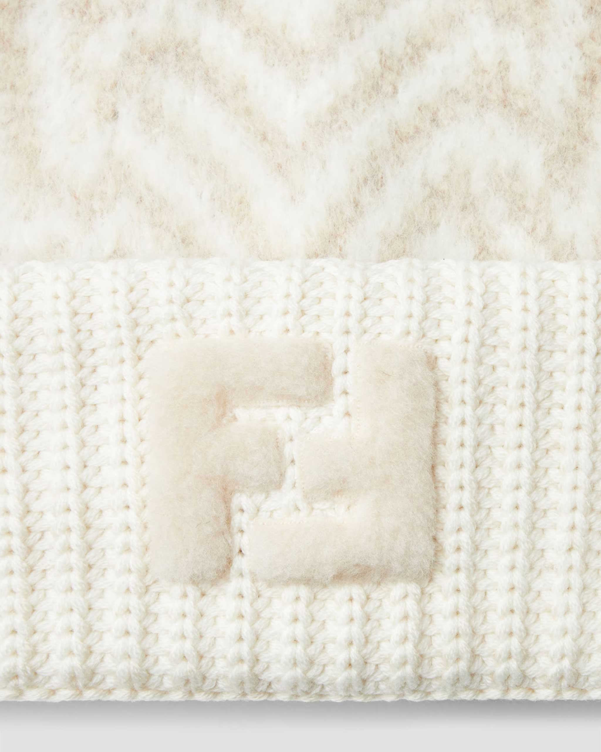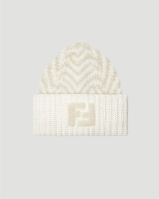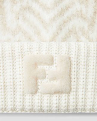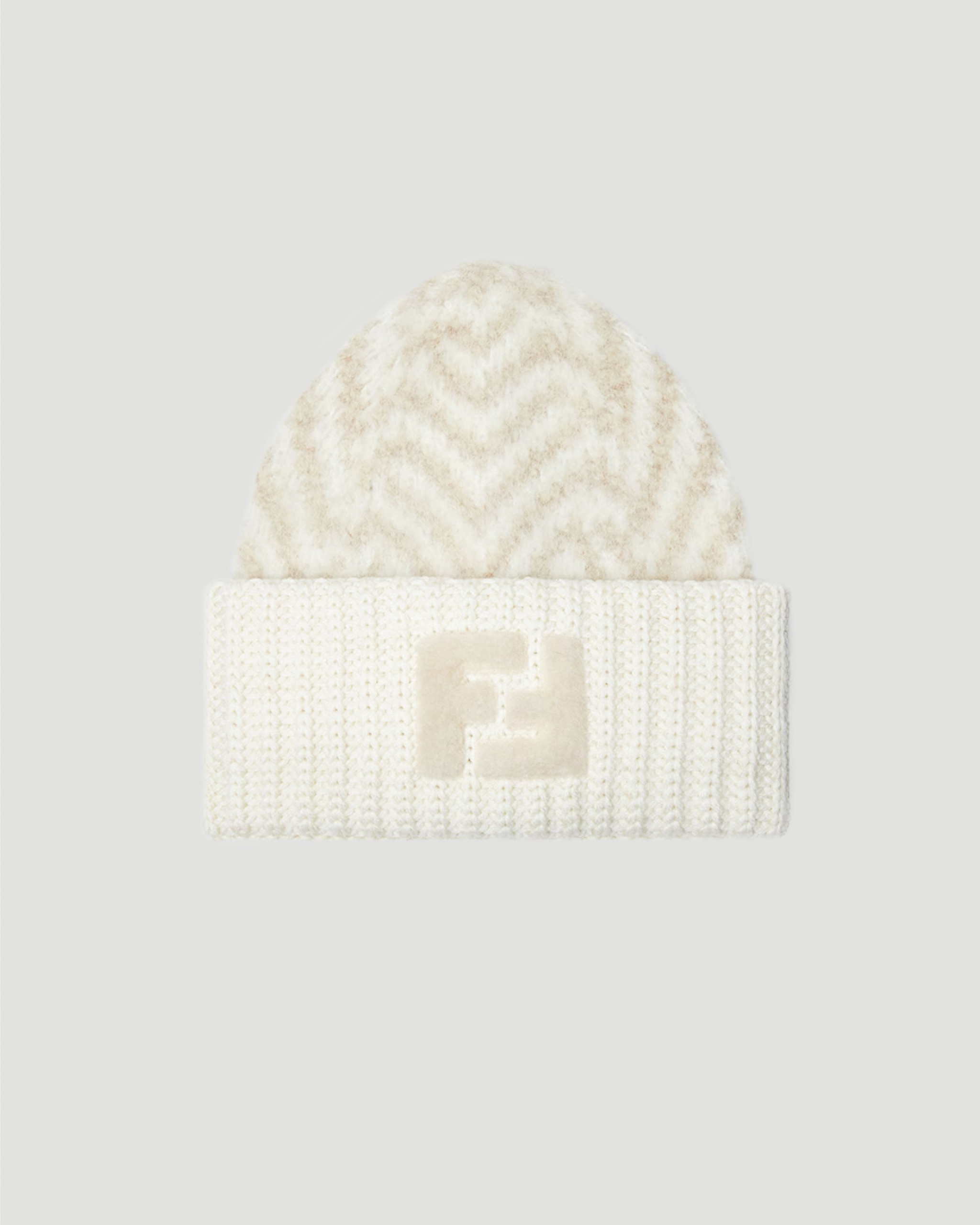 This beanie by Fendi is crafted from soft ivory alpaca with a brushed chevron knit for a plush texture. Features a turned-up brim in fisherman’s rib wool and a tone-on-tone 3D FF logo detail in brushed alpaca at the front.